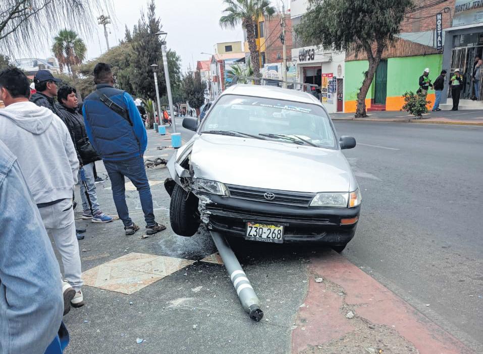 El conductor perdió el controlysedespistóhaciasulado derecho, terminando sobre la vereda y derribando un poste de alumbrado público de material de fierro con panel solar.