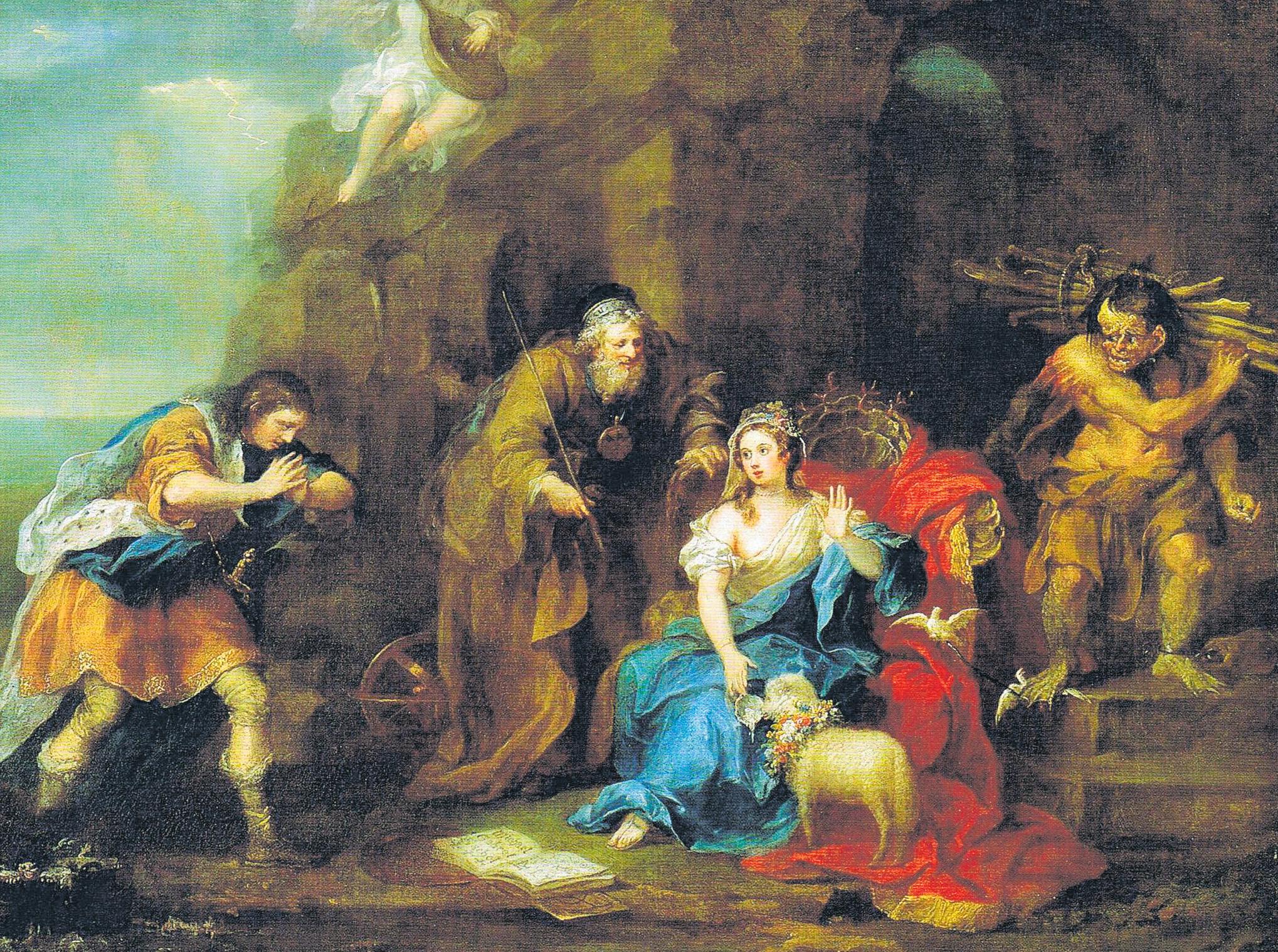 | LaTempestad,deWilliam Hogarth; Calibán aparece en el extremo derecho.|