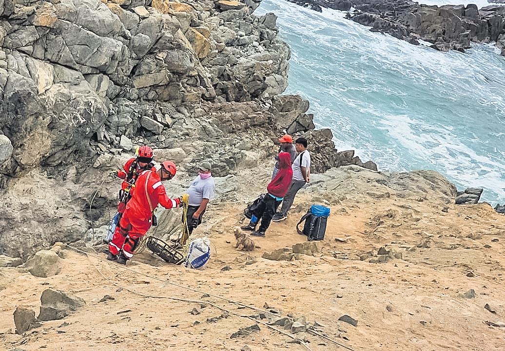 | Bomberos de Ilo descienden por un acantilado empinado con cuerdas para rescatar al pescador herido. |