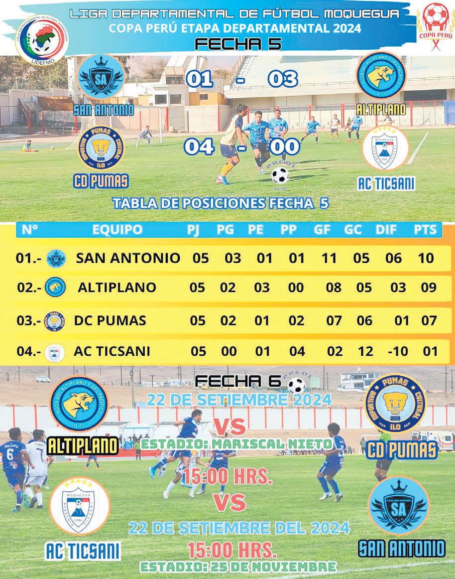 El equipo dirigido por Marcos Sánchez no desaprovechó la ocasión ante un Ticsani que, visiblemente diezmado, llegó a Iloúnicamenteparacumplirconelcalendario.Ticsani,quesolo ha logrado acumular un punto en lo que va del torneo,enfrentó a unos Pumas que mantienen vivas sus esperanzas de clasificaralafasesiguiente.