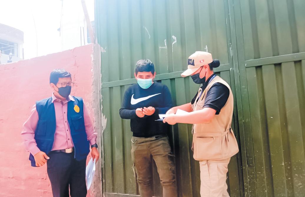 | El Fiscal y Seguridad del Estado con el policía BrayanAlfaroTirado,en la puerta del inmueble usurpado.|