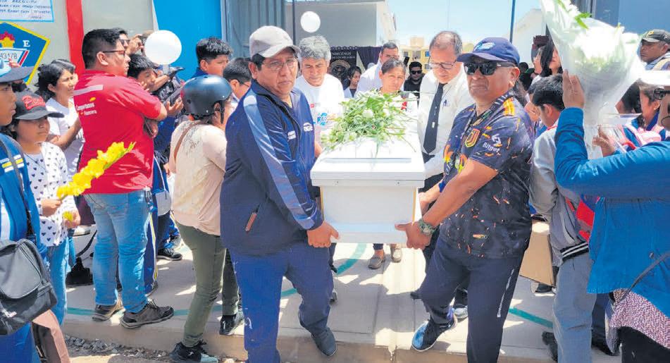 Con profundo pesar,la comunidad educativa de la I.E. José Olaya Balandra se despidió del estudiante Jhoau F.S.CH., alumnodeltercergrado"C".El menor falleció en un trágico accidente de tránsito mientras viajaba en motocicleta junto a su tío, James Mamani Chicani,quientambiénperdió la vida en el impacto contra uncamióngrúa. ElféretrodeJhoaufuetrasladadoasuinstitucióneducativa, donde compañeros y do-