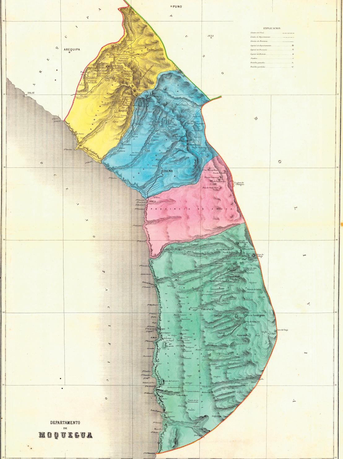 | Mapa del antiguo Departamento de Moquegua que incluía Tarapacá,hacia 1865.Paz Soldán. Geografía del Perú.Grabado por Delamare,Calle St.Andre desArts,45,Paris. |
