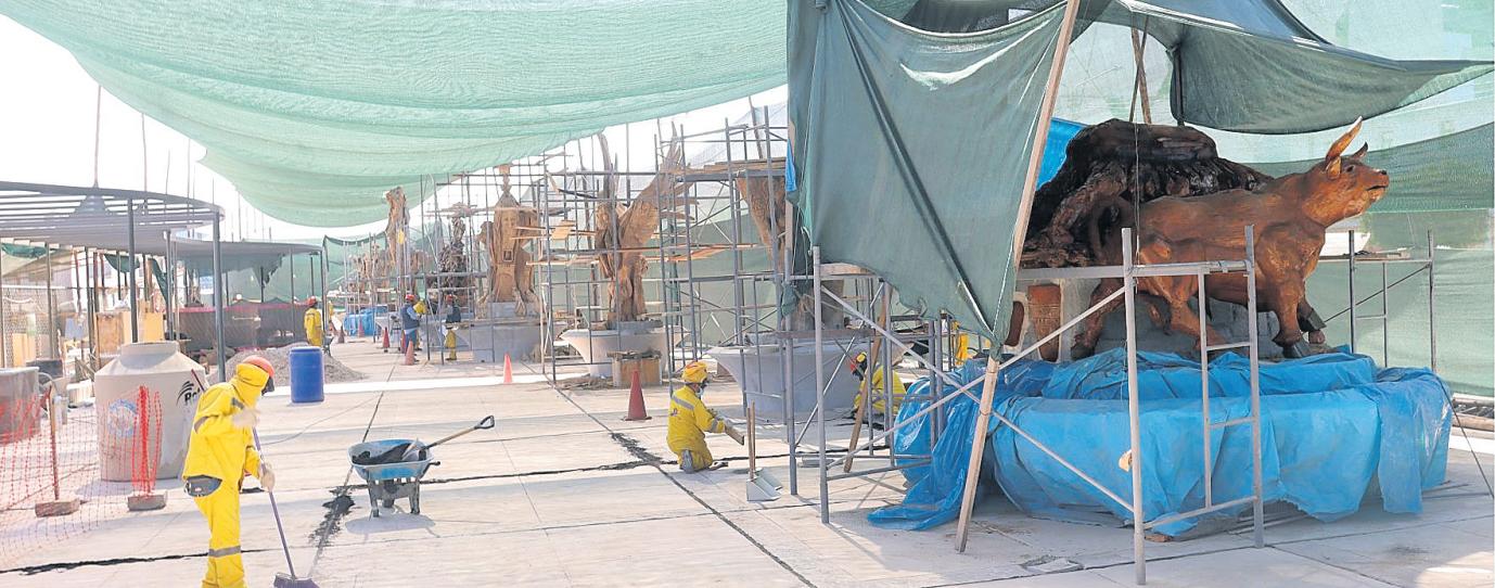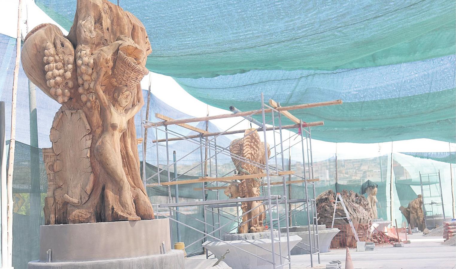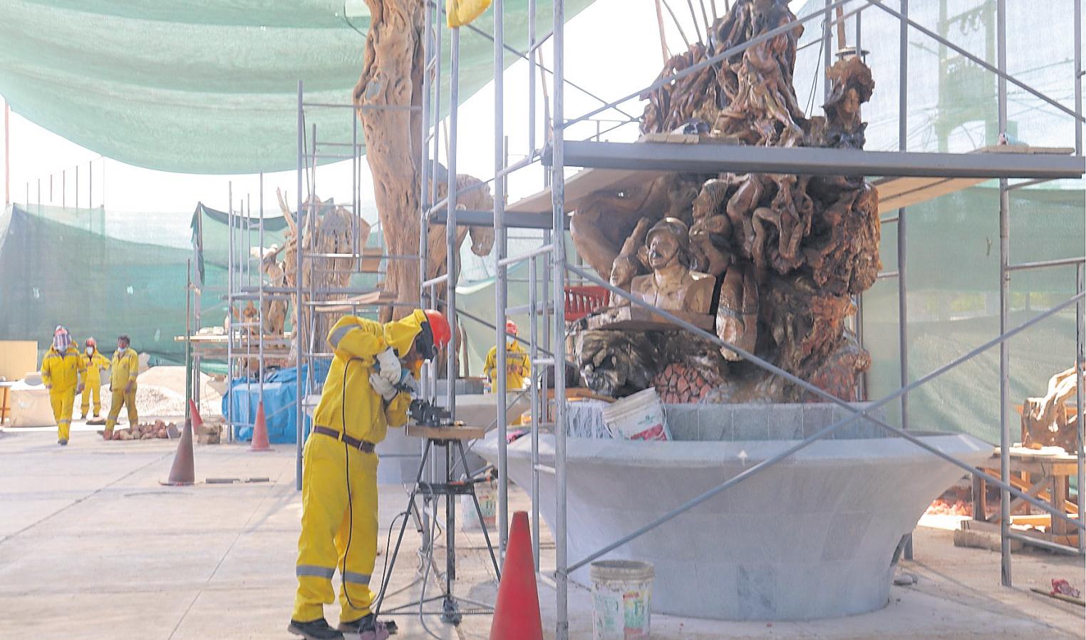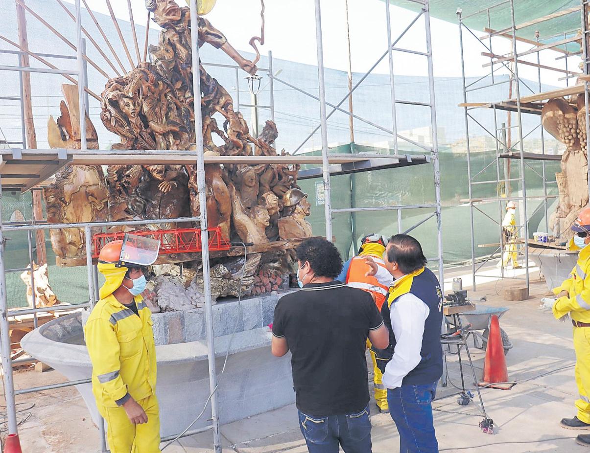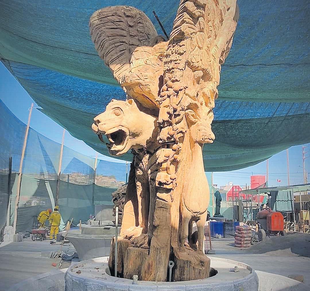 Son15esculturasdemadera las que se están realizando, que se instalarán sobre una base de piedra tallada. Se cuenta con artistas que están esculpiendo hechos de la historia de Moquegua, entre otros.