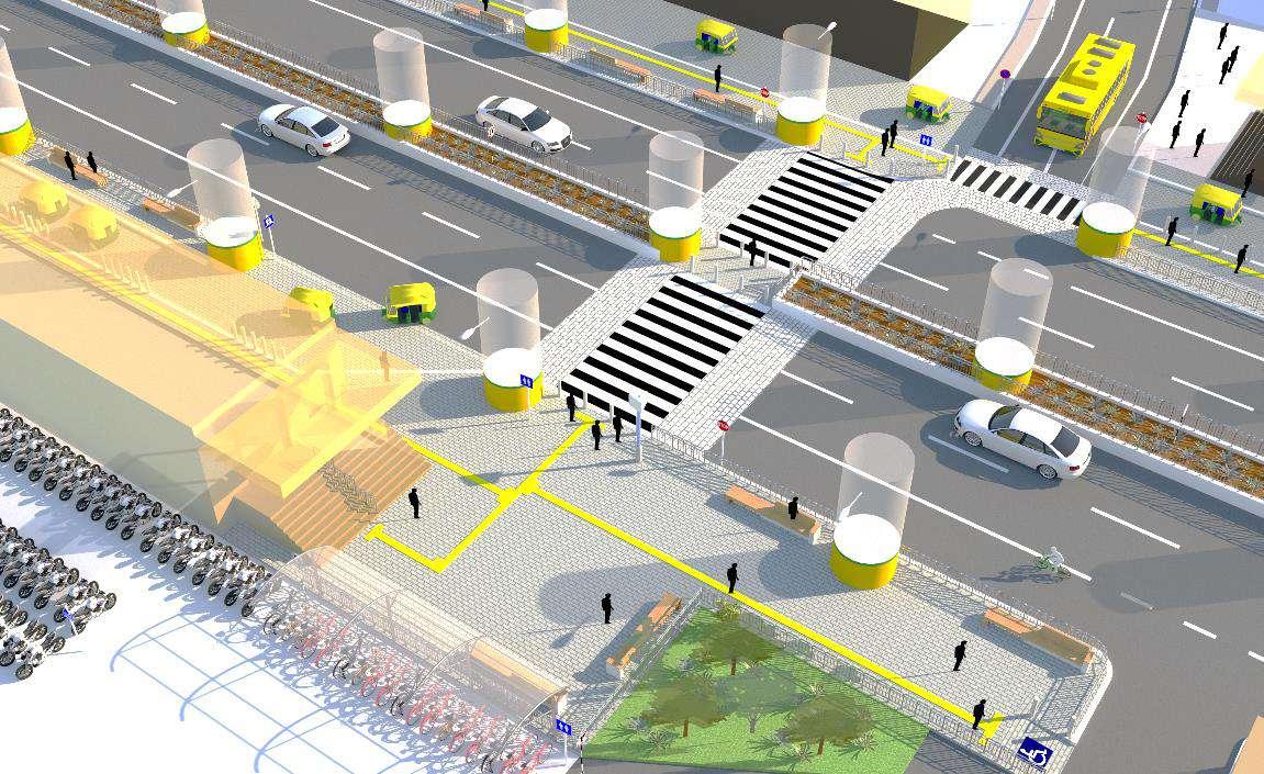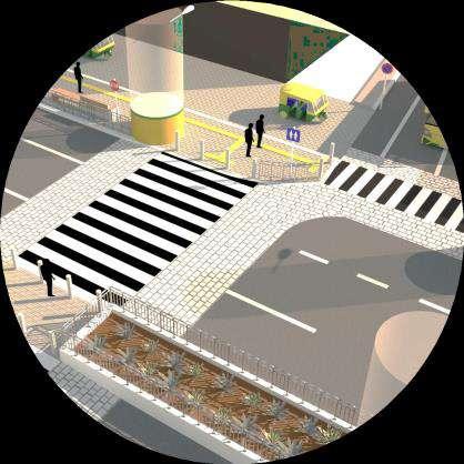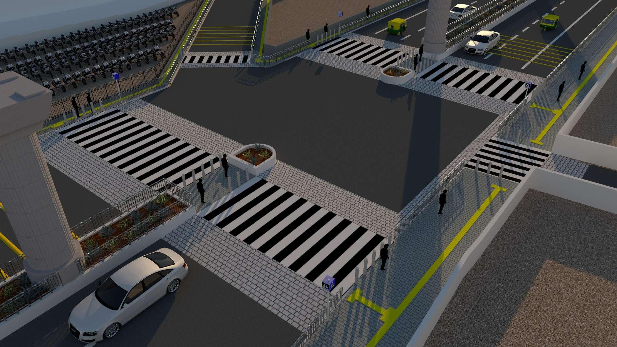 To ensure pedestrian safety and convenience, crossings should be designed for Specially abled with navigating tactile pavers, zebra crossing, Signs, Traffic signal pole, etc