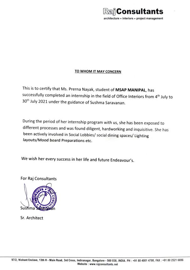 Bangalore-based architect company Raj Consultants specialises primarily on workplace interior design. Under the guidance of senior architect Sushma Saravanan and direction from my peers, I was able to successfully complete the deliverables that were required of me, I created mood and material boards in accordance with the client requirements because attending client meetings had improved my understanding of them. This being my first experience in an office, apart from improving my knowledge of materials, lighting, office spaces, etc. I also learned how workspaces and teams operated to accomplish objectives, fulfil deadlines, and meet targets.