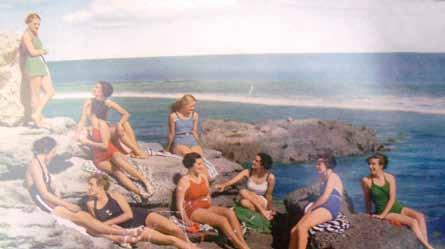 as a young lady, barb enjoyed playing tennis at the royal Kings park tennis club and socialising at cottesloe beach. in 1933 her cousin rae, who worked with a local photographer, organised a group of girls to pose for a photo on the Mudurup rocks south of cottesloe. the group included barb, rae, her sister Katie, some cousins and other friends, most of whom went to plc it was the first colour photograph published in The Western Mail and appeared in the 1933 christmas edition.