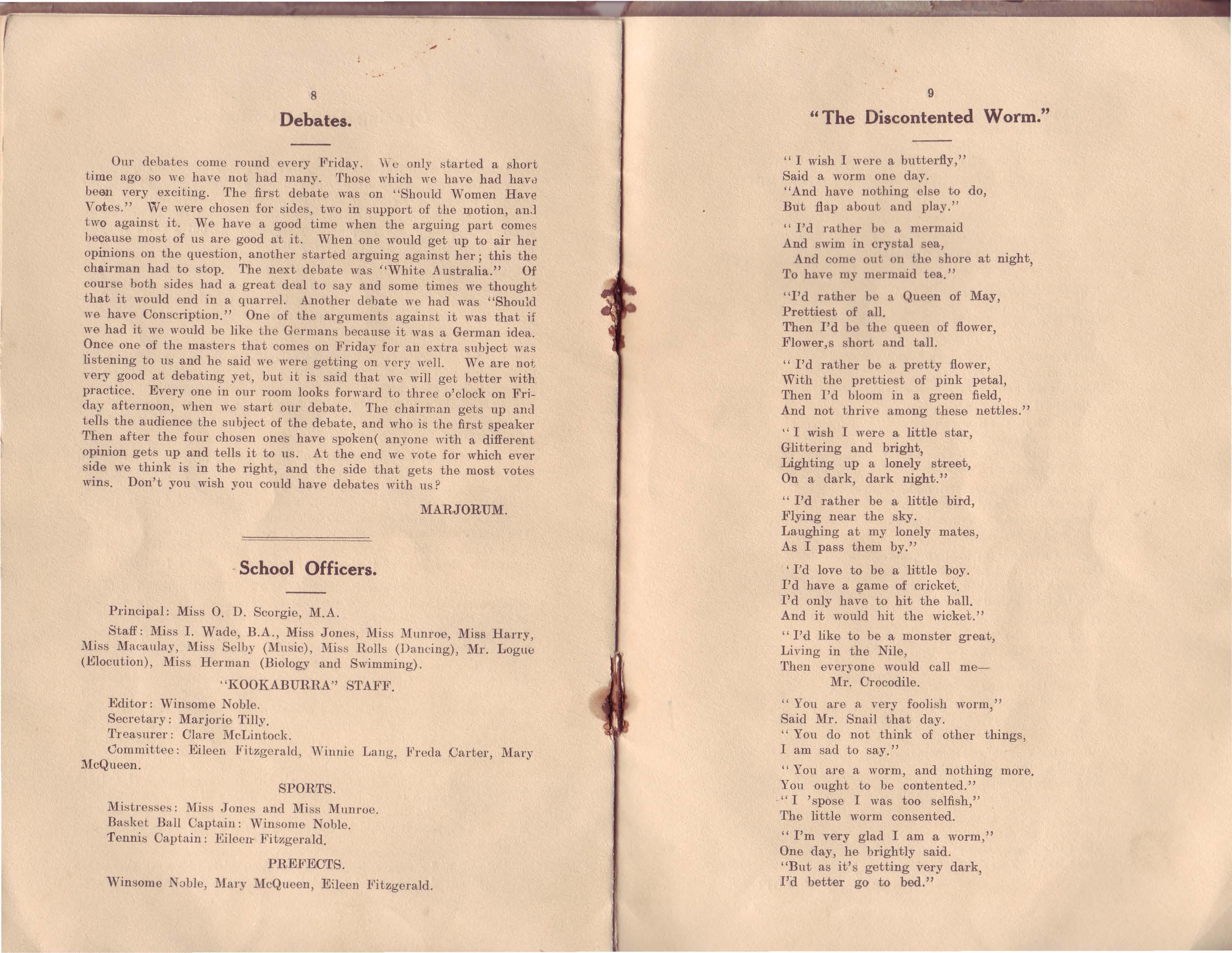 Our debates oome round every Friday. \i" e only started a short time ago so we have not had many. Those which "'e have had havtl been very exciting. The first de·bate was on "Should Women Have Votes." v'V e were chosen for sides, two in support of the motion, anJ two against it. We have a good time when the arguing part comes because most of us are good at it. ·when -one would get up to air her opinions on the question, another started arguing against her; this the chairman had to stop. The next debate was "'Vhite Australia." Of course both sides had a great deal to say and some times we thought that it would end in a quarrel. Another debate we had was "Should we have Conscription." One of the arguments against it was that if we had it we would be like the Germans because it was a German idea. Once one of the masters that comes on Friday for an extra subject was listening to us and he said we were getting on V<'l'J well. We are not very good at debating yet, but it is said that we will get better with practice. Every one in our r-oom looks forward to three o'clock on Friday afternoon, when we start our debate. The chairman gets up antl tells the audience the subject of the debate, and who- is the first speaker Then after the four chosen ones have spoken( anyone with a different opinion gets up and tells it to us. At the end we vote for which ever side we think is in the right, and the side that gets the most votes wins. Don't you wish you could have debates with us?