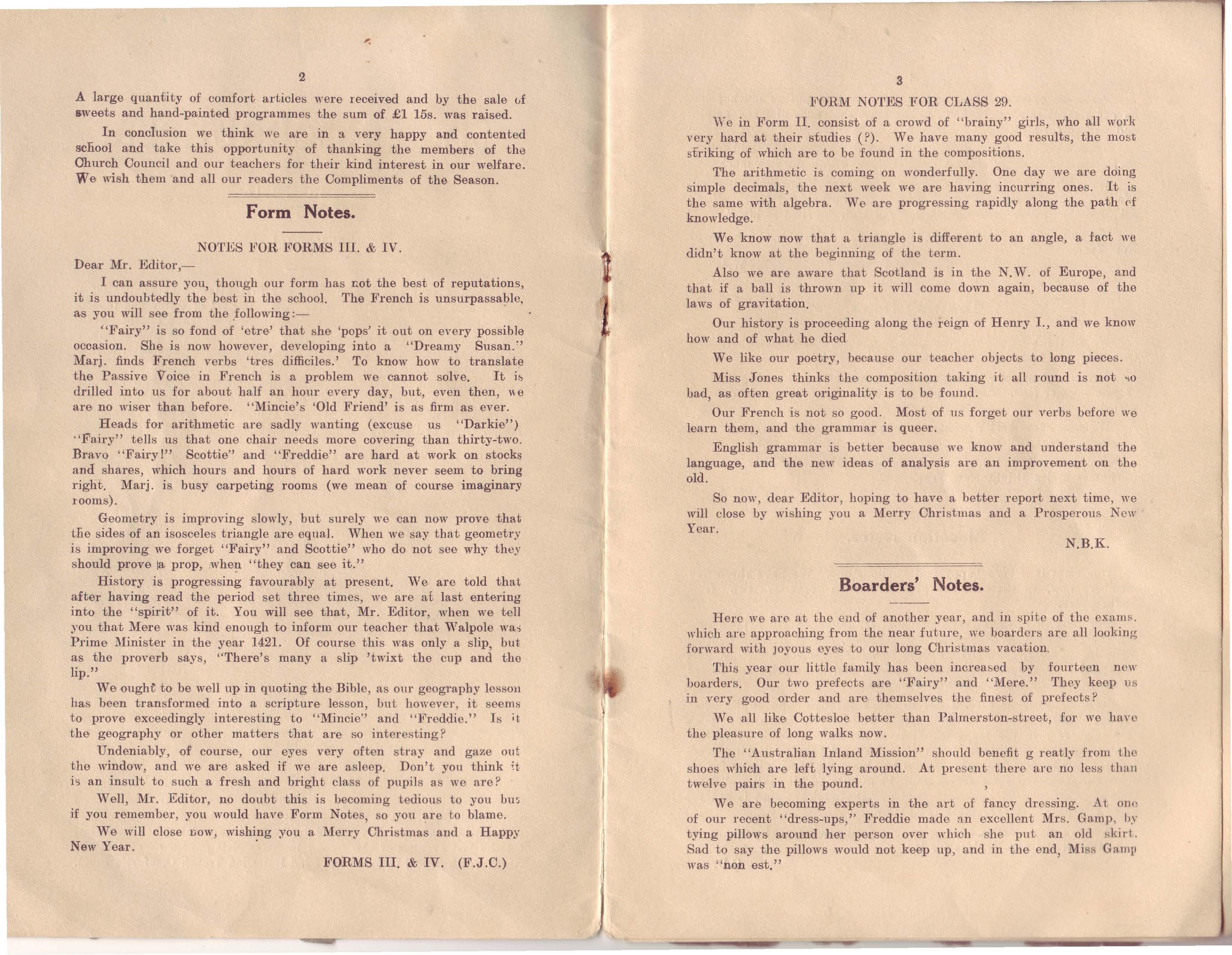 We were in hopes that peace would have been declared before the end of this year, but it seems that it is not to be. The dreadful war still goes on, and we left behind in Australia are doing our little bit. On the last evening of the second term we girls gave a concert in tl1<! North Perth School in aid of the 32nd Battalion Trench Comfort's Fund.