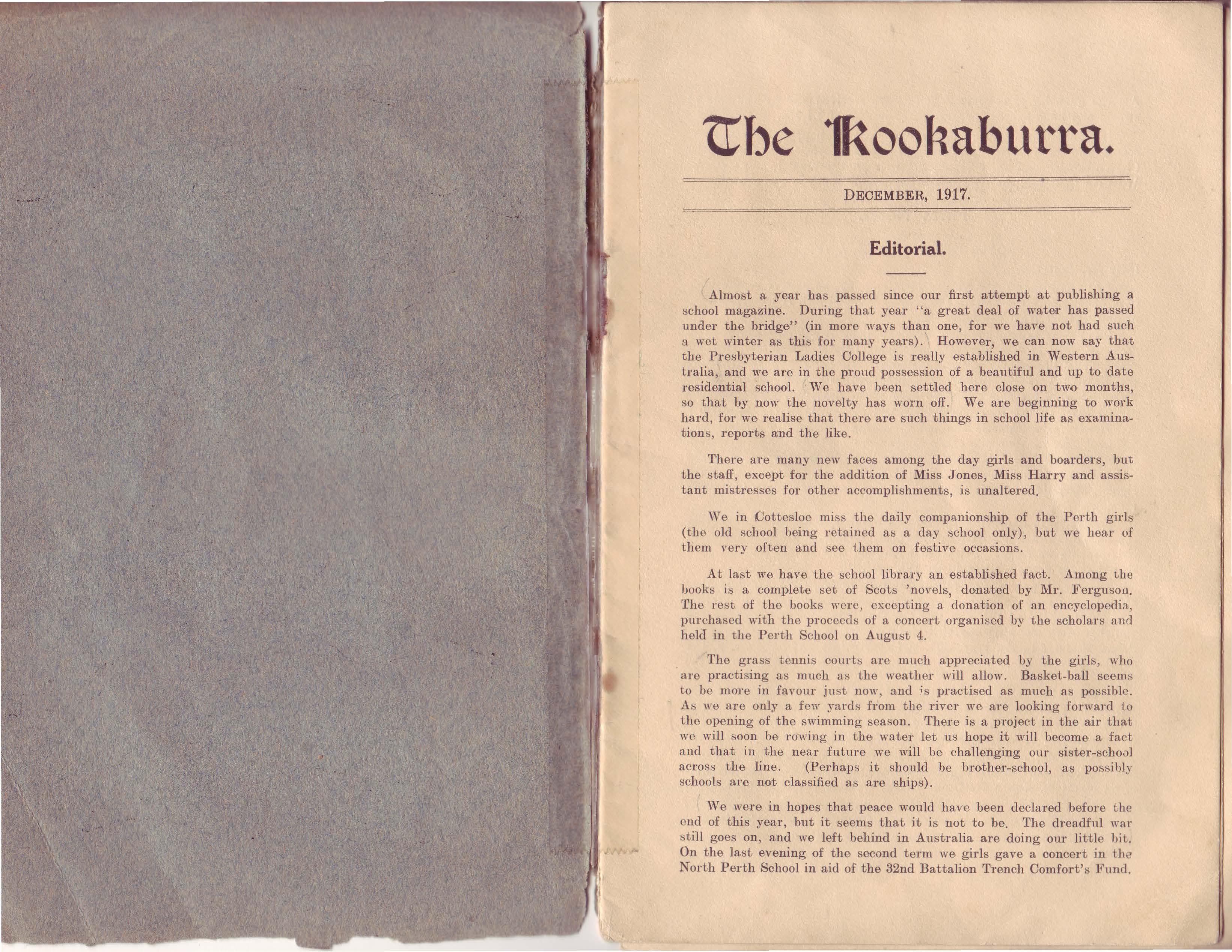 Almost a year has passed since our first attempt at publishing a school magazine. During that year "a great deal of water has passed under the bridge" (in more ways than one, for we have not had such a wet winter as this for many years). However, we can now say that the Presbyterian Ladies College is really established in Western Australia, and we are in the proud possession of a beautiful and up to date residential school. We have been settled here close on two months, so tl1at by now the novelty has worn off. We are beginning to work hard, for we realise that there are such things in school life as examinations, reports and the like.
