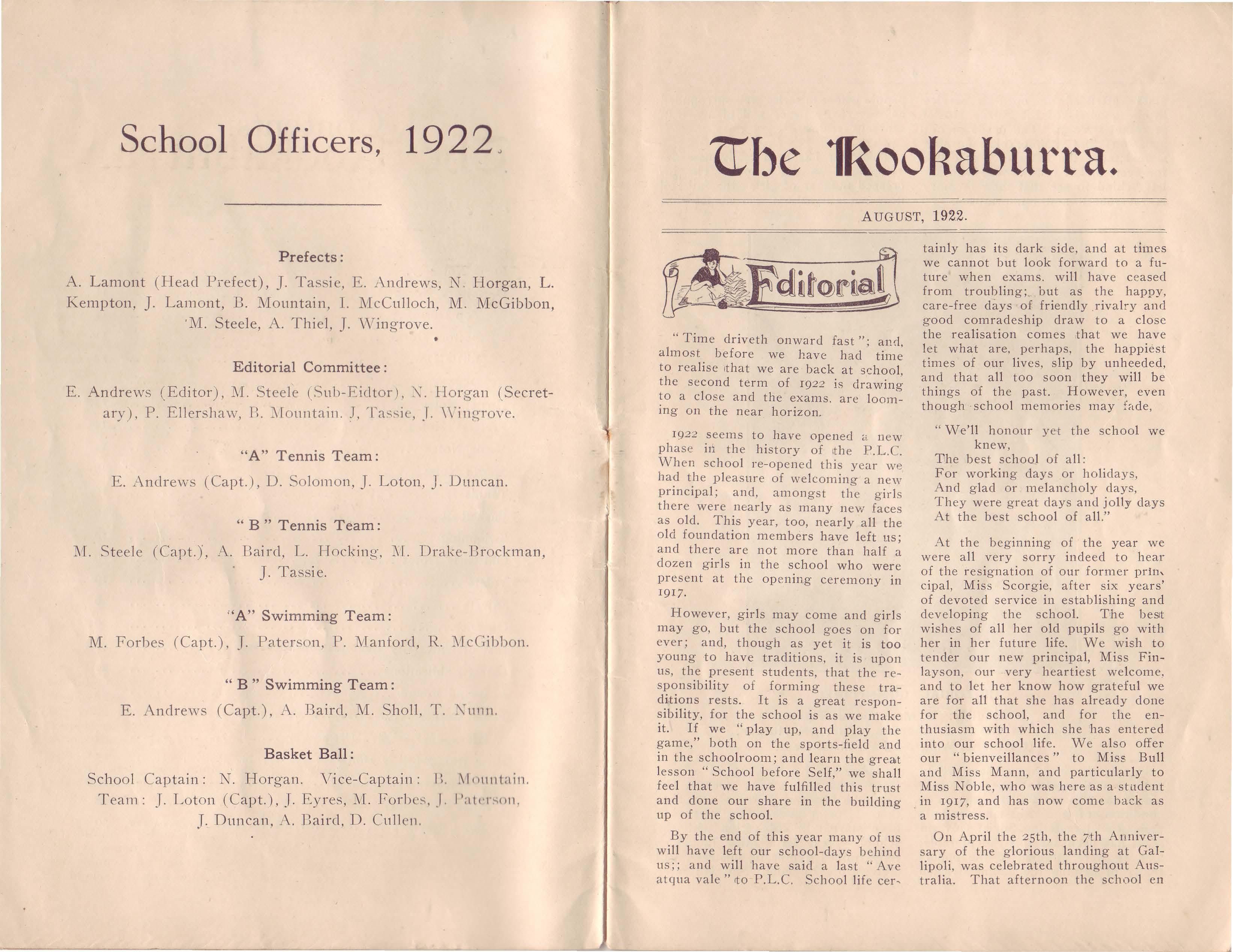 1922 seems to have opened " new phase i11 the history of 1t he P.L.C. When school re-opened this year we had the pleasure of welcoming a new principal ; and, amongst the girls there were nearly as many new faces as old. This year, too, nearly all the old foundation members have left us; and there are not more than half a dozen girls in the school who were present at the open i ng ceremony in I9I7.