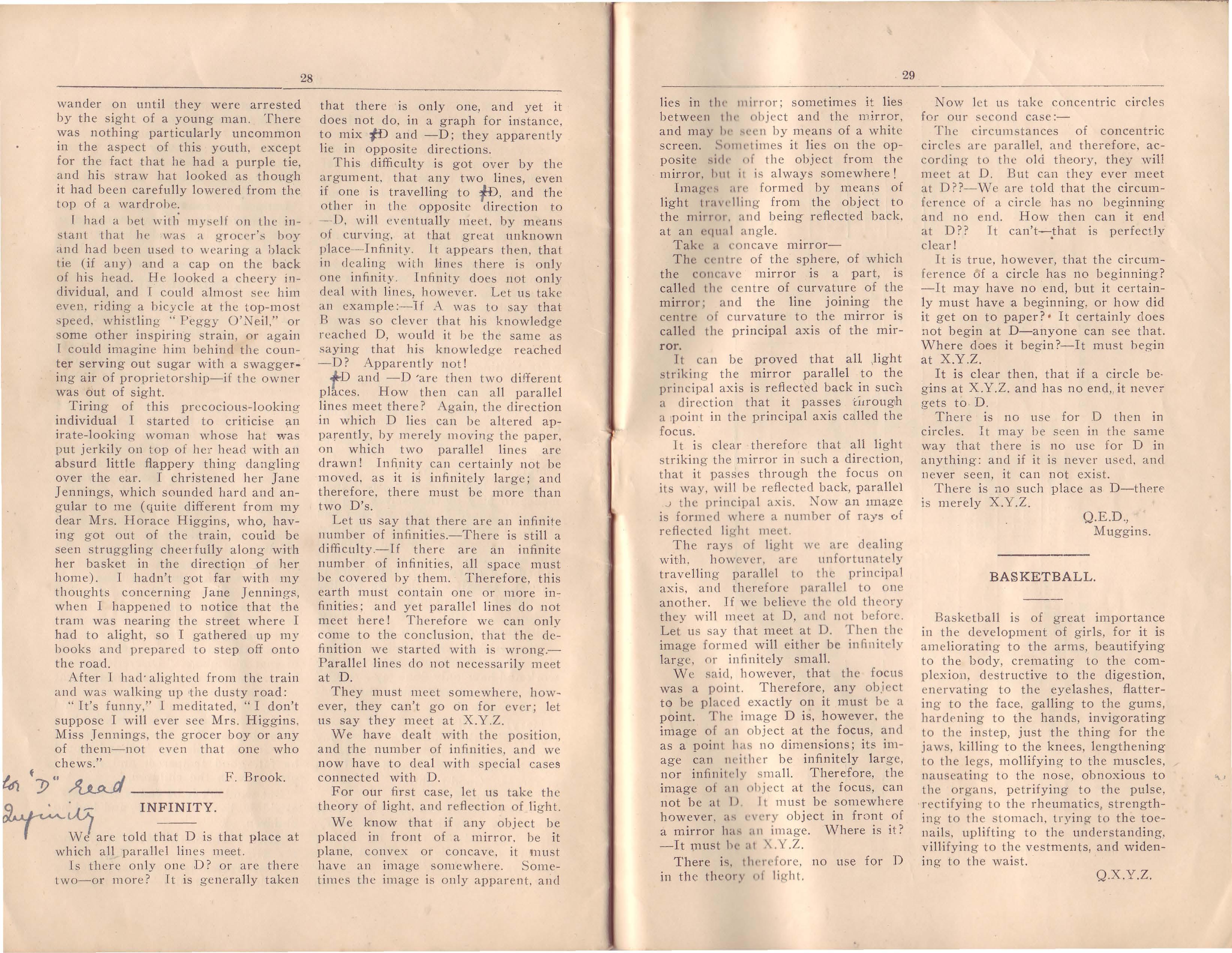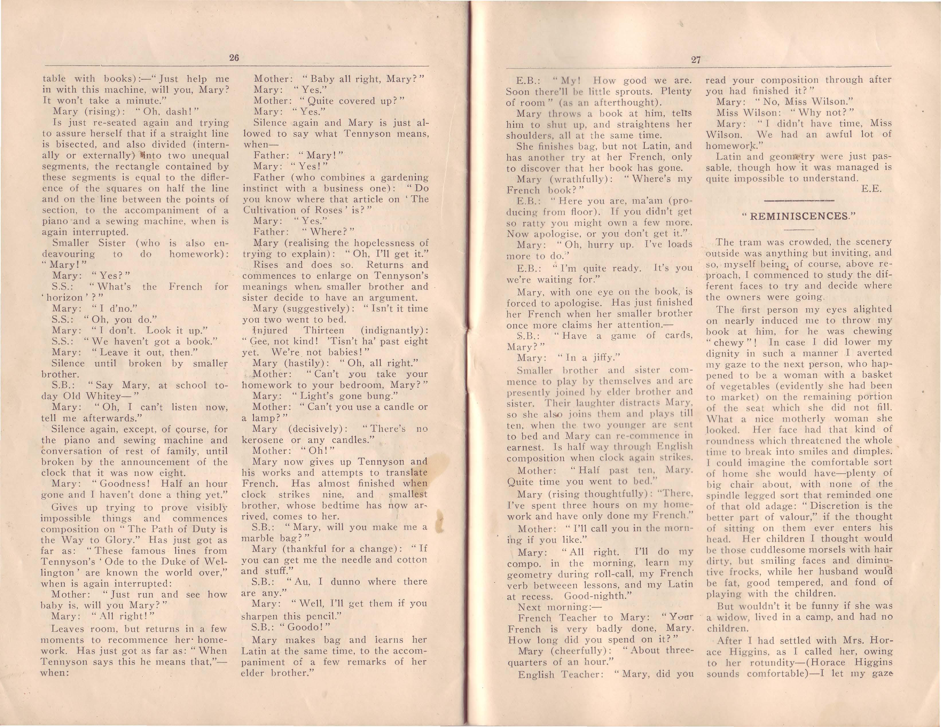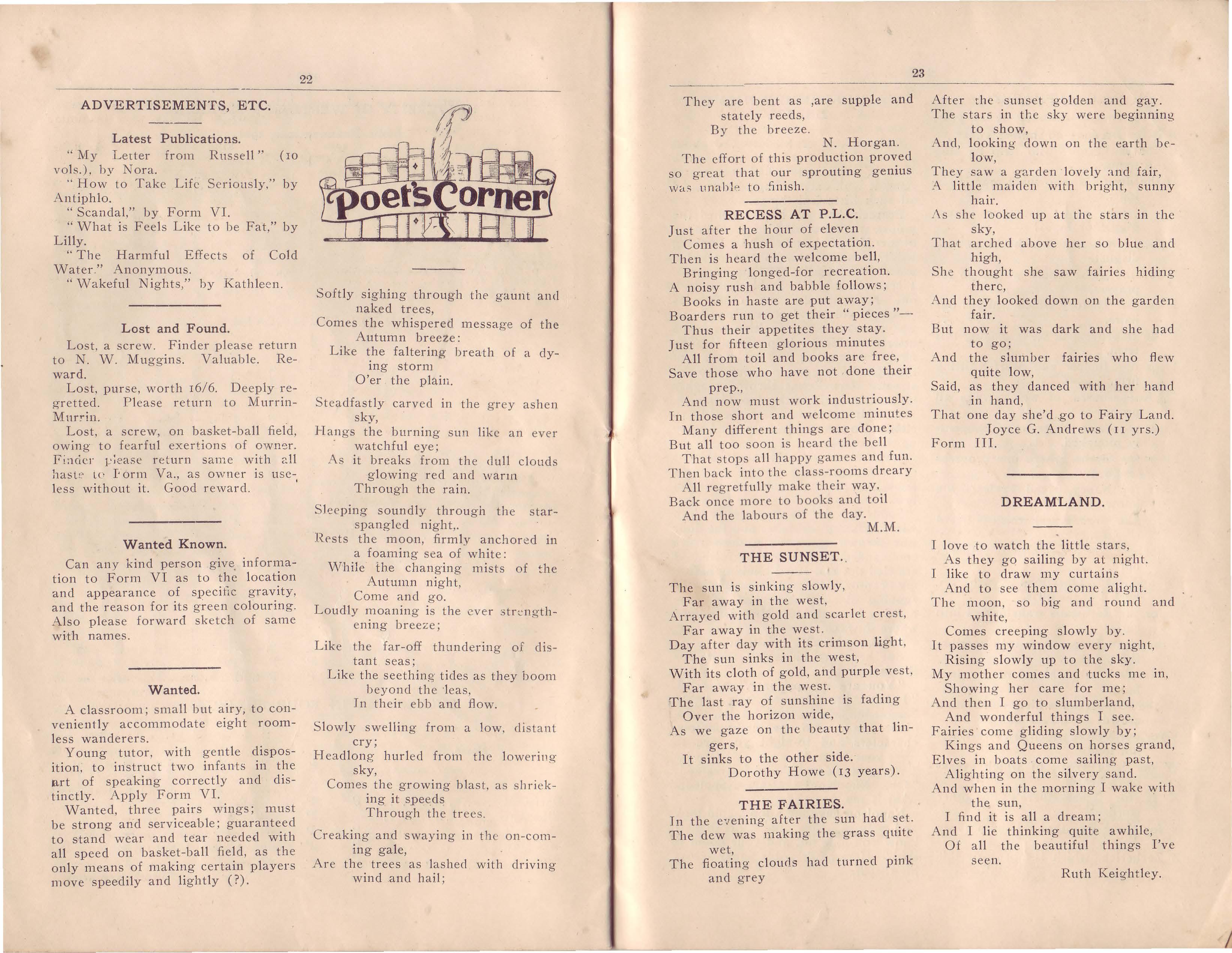 memory. These essays are very brilliant, and often astounding facts are stated, which are truly wonderful, considering they come from such young minds. One famous essayist. in an essay on "Gardens," astonished everyone by stating that " gardens putrify the grounds." Of course, we cannot all <\grec on thC' same 6uhject, and people ar:: fre<' to express their opinions.