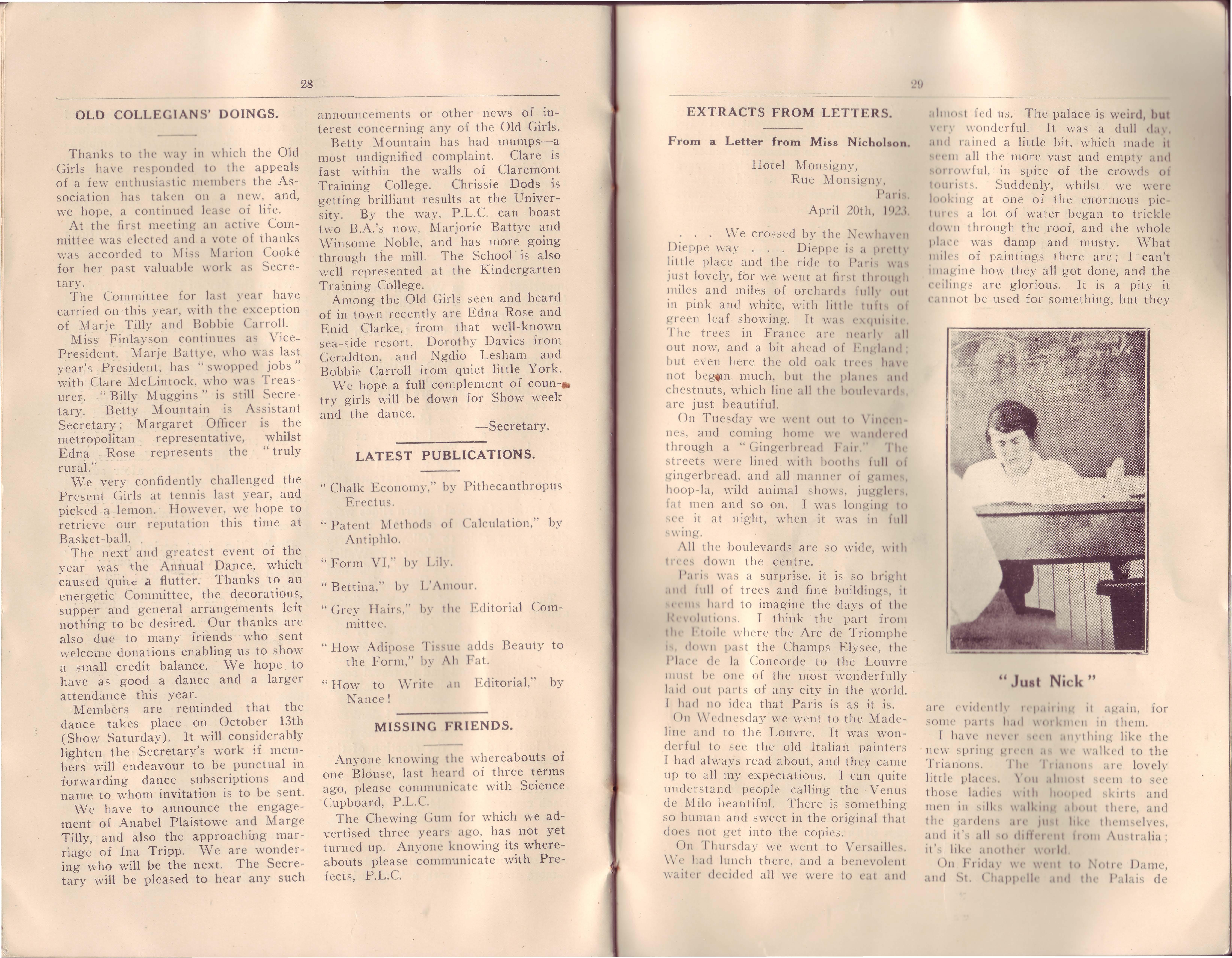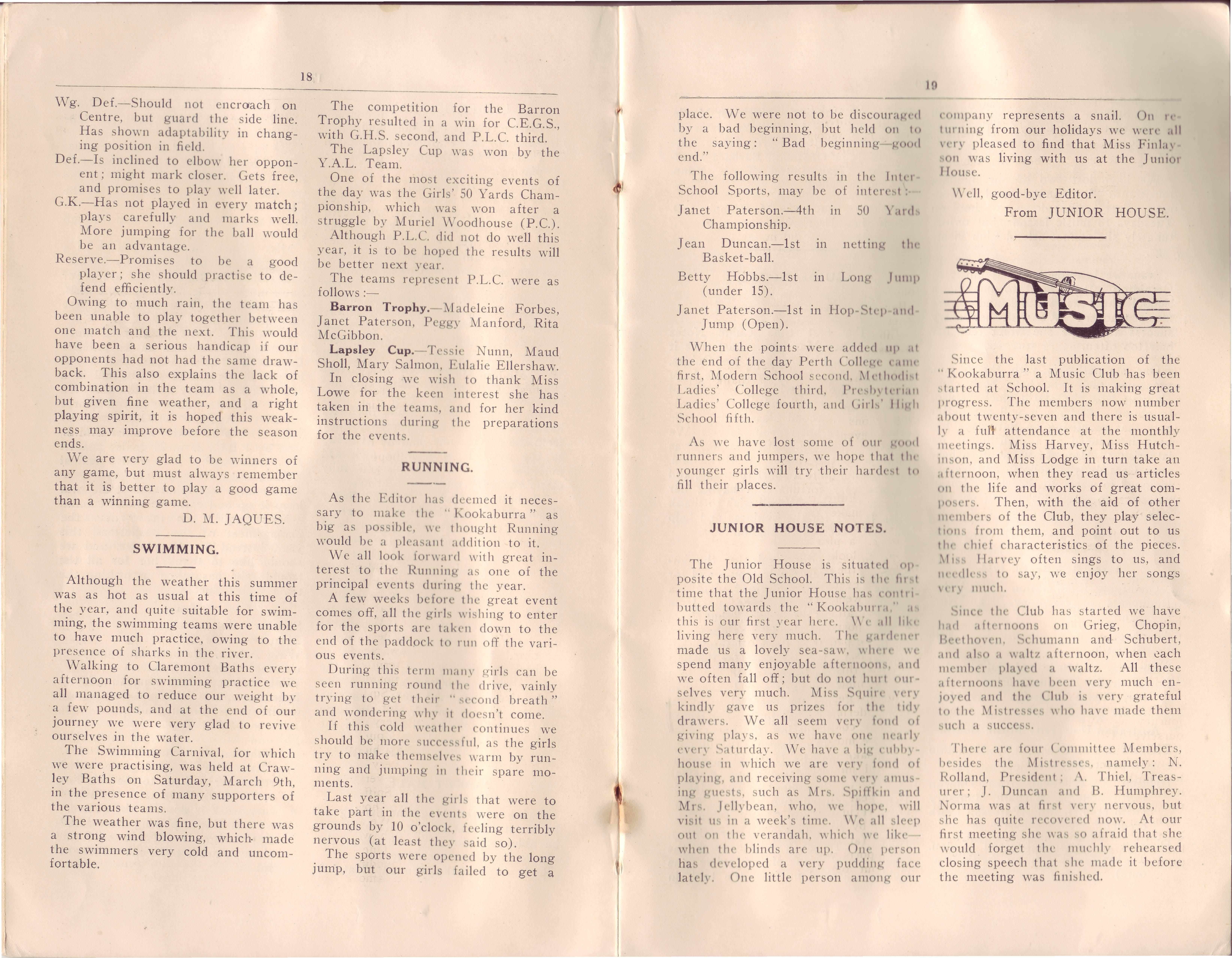 We were a ll very sorry at the end of thl' year to have to bid farewell to Miss Nicholson and Mis s Munro, who sailed for England by the "Jervis Bay, " Miss Robertson, who left us to get married, a nd Mrs. Proctor. Miss Munro has returned to Scotland, while