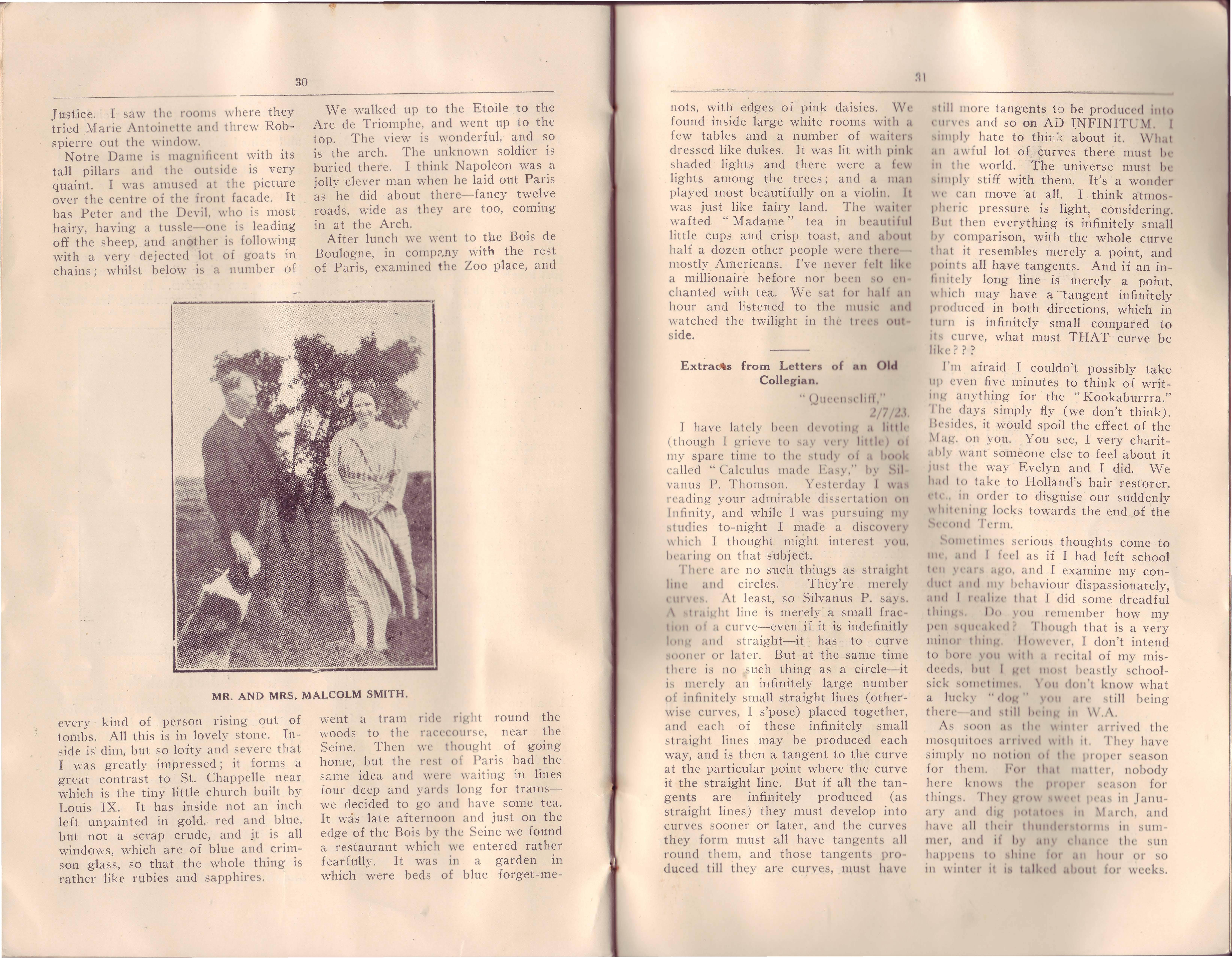 Mi ss Sumlllers brought us news of our late Principal (Miss Srorgie), who, by the way, is n o longvr ti l iss Scorgie, but Mrs. Malcolm Slllith. We hope her futur e life will he a very happy and prospero u s one: and judging from the "snaps" tak en by Miss Summers while in South Africa, it h as every pro s p e ct of being so