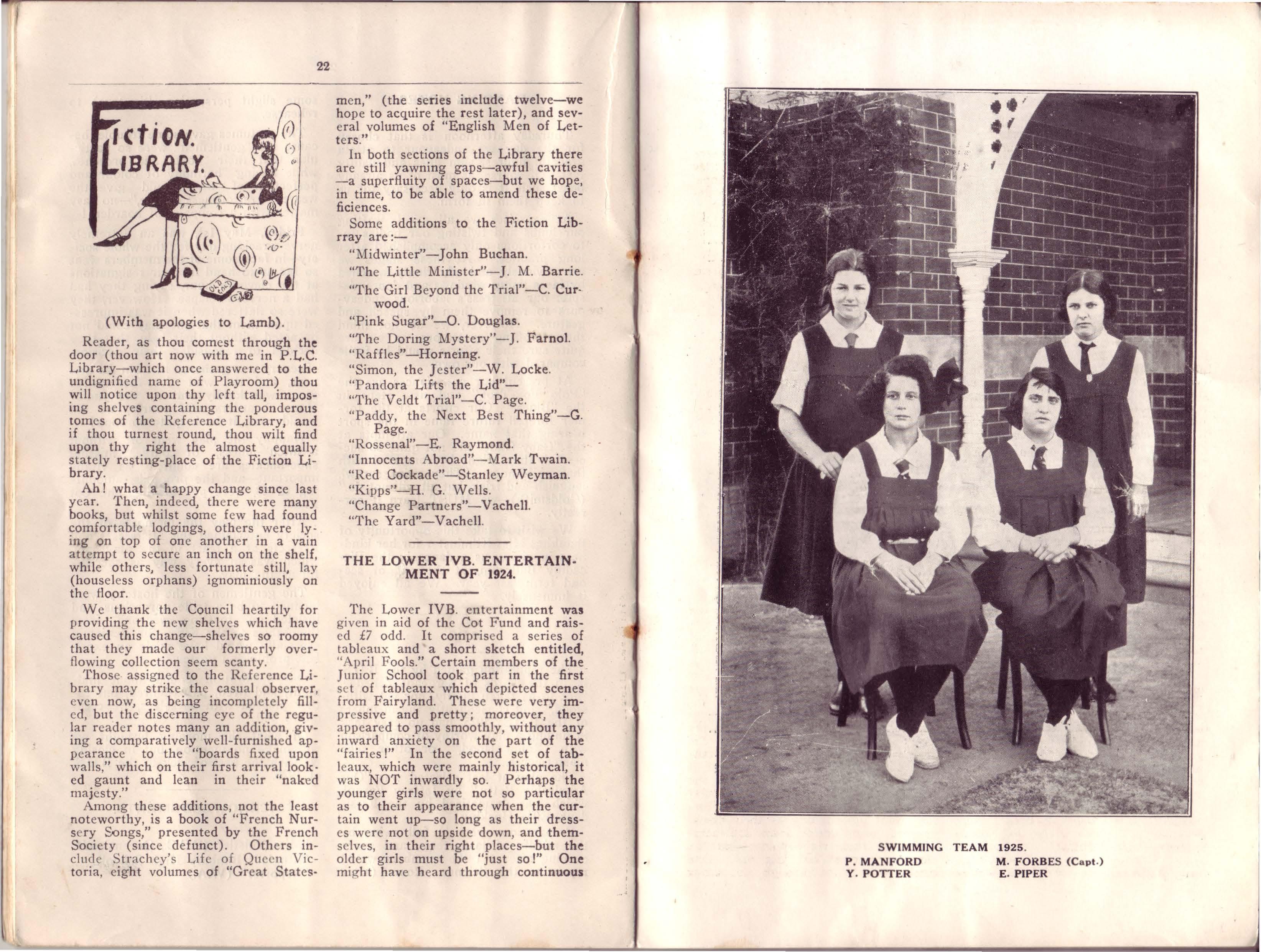 A ugust 19t h-2 1st, 1924. Th e se thre e days w e re s e t apart by Miss Finlayson for th e purpose of a School Eisteddfod, in the form of competitions in English Po e tr y, French R eading and Latin Poetry . Each Form was allowed three girls to r epr e sent it in each of th e three lan g ua ge s, thus allowing for fair competition A wellfought contest ensued r es ulting in Lower VA winning th e English Poetry competition; Lower lVB t h e French reading, and Upp e r V ,t h e Latin Poetry. Great int eres t was manif es t e d in the Eisteddfod, and it brought many unknown geniuses to th e limelight.