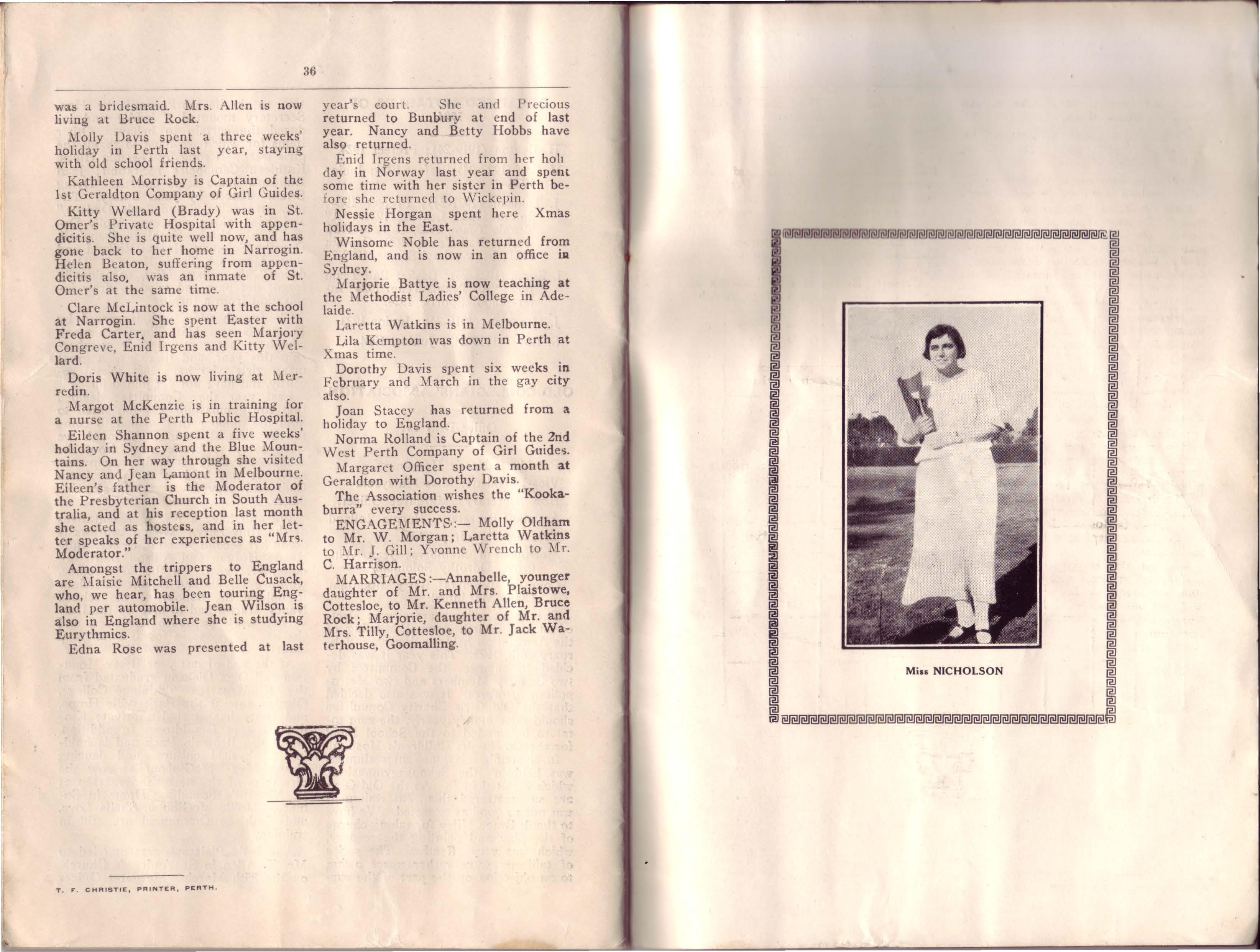 Clare McLintock is now at the school at Narrogin. She spent Easter with Freda Carter. and has seen Marjory Congreve, Enid Irgens and Kitty Wellard.