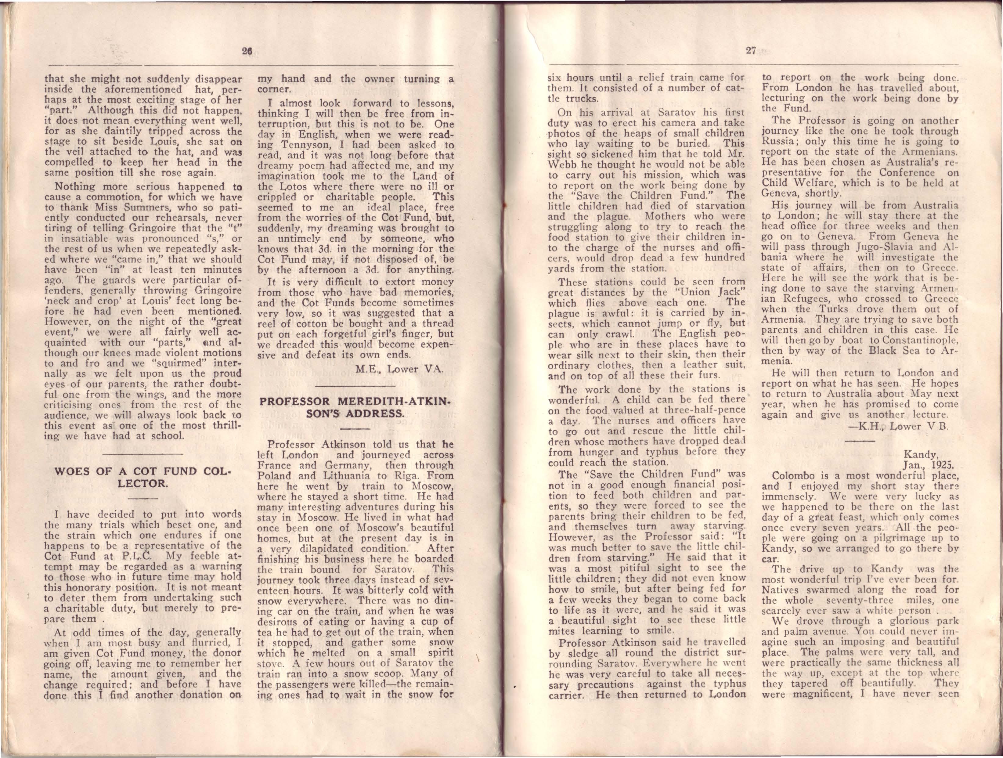 Professor Meredith Atkinson gave a lecture on the "Present Condition of Russia," in the interests of the Save the Children's Fund. It was probably the most inspiring and pathetic address we have ever heard, and besides deeply pitying the Russians, we were filled with the greatest admiration for the lecturer himself,who, d e spit e modesty, must be a courageous an<l very unselfish man. We were sorry that we could not do more to raise money for the Fund, but quite voluntarily girls brought up small amounts , and so we were able to send in a few pounds, however, we w e re all very thrilled at the idea of adopting an Armenian baby and girls banded th emselves into g roups to do this. Difficult as it is to believe it, a child can b e fed on a penny half penny a day, and as it only takes a shilling a w ek to support the child, the groups mainly consist of six or eight. It is a very inspiring thought that through our own efforts we are kc ping another human being alive, and th r would be no limit to the number of babies adopted if we had not to rmember our Cot Fund, and r main true to our first endeavour at all costs . May 18th, 1925.