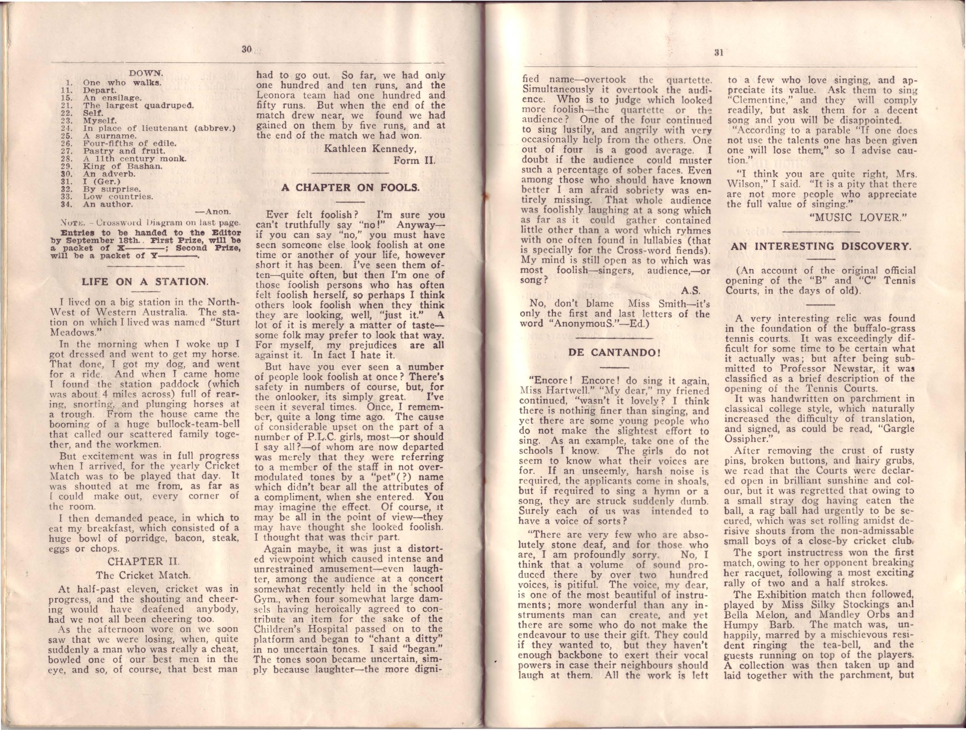 t.1in to do its work, untrl th flon. St·crt tary mounted a la<l<kr and intlncul the curtain to behave Other itt rn. for which w hav to thank the •iris were :-a song by Gwenda Hicks, Kathleen Campbell's recitation; J an lhrncan's piano solos and the "Dying Swan," danced by Joan Stac y. Th'! play was called "Dandelion's J>odg s," .1nd those taking part were MoJiy Da' 1s, '!'essie Nunn, Kathleen Campbell, Dorothy Soloman, Norma Rolland and Hl'llY .\lountain Tessie Nunn as "Dan· dclion," the village idiot, occasionally for g ot h e r part and tried to draw inspiration from a turnip.