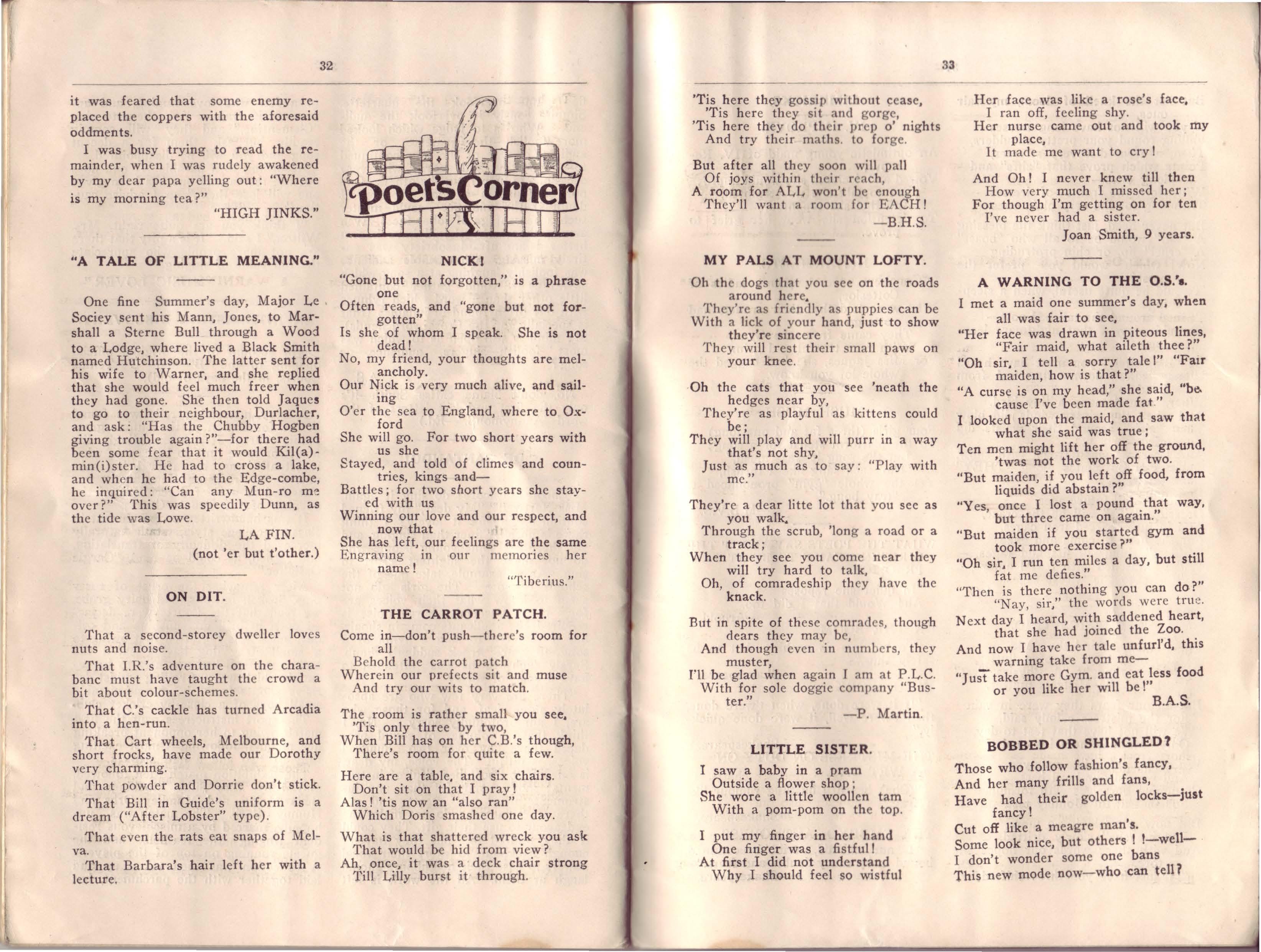 Y ea r after year th e School Magazi n e appears, the "On Dit" colu111:ns are read the Poet's Corn e r skunmed and the There is little sense of JUStice m the ordinary school girl; she not s ee in the tiny rhyme of the girl the big desire to produce a worthy work; as she does not see in h e rself slacker who won't write one. Th e r e IS ever a littl e heap of 15irls at ve ry foot of the school bnmmmg w1th e nthusi asm: there is always . a g ;oup at th e h ead ready to do their bit-then th ere is the middle section-and self· complacency.