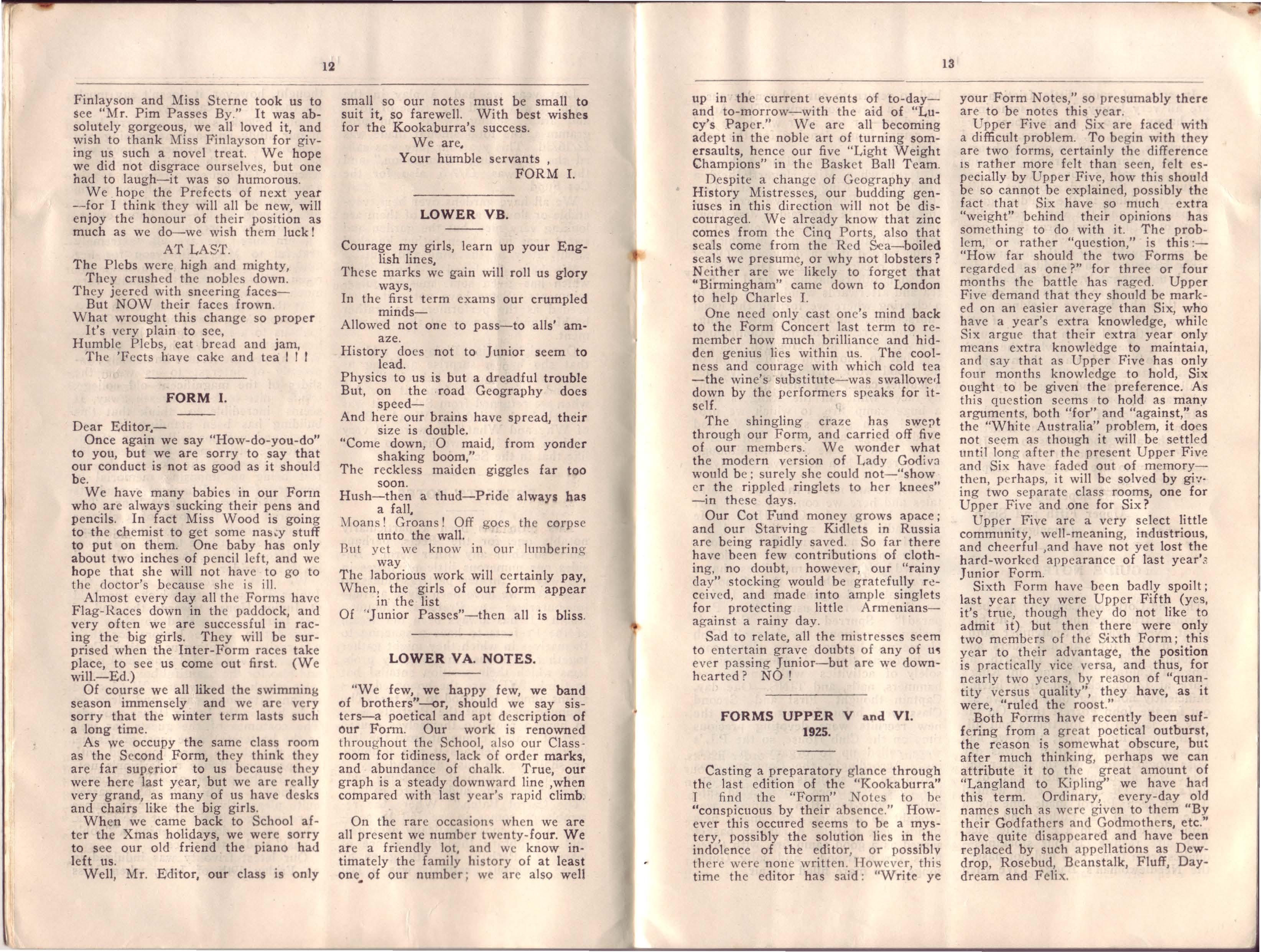 These three days were also taken up by an Eisteddfod, this time in the form of concerts. Each Form gave a concert lasting about twenty min·· utes, and it was finally decided that the concert given by Forms I and l[ and Kindergarten Amalgamated should be awarded the prize, which was a to the Cot Fund given by Mtss Fmlayson to be placed to their credit.