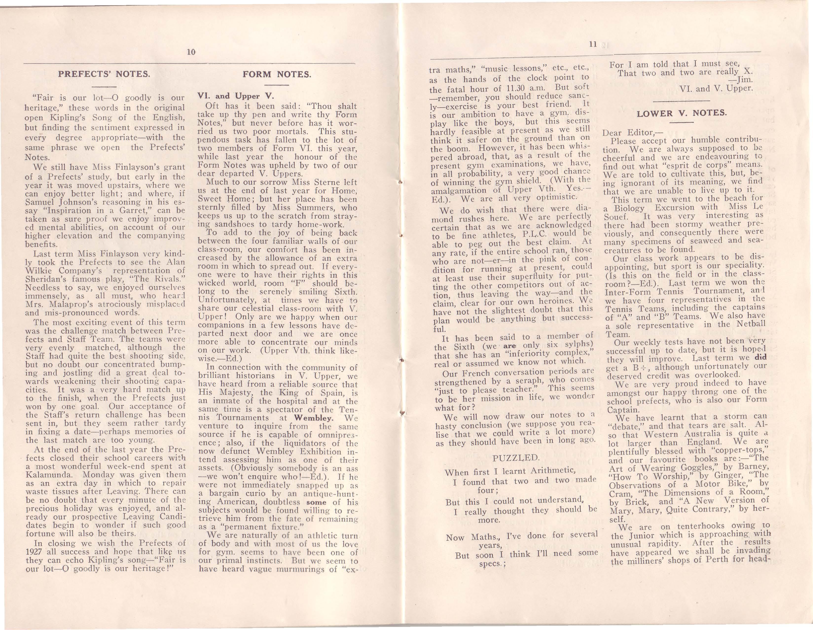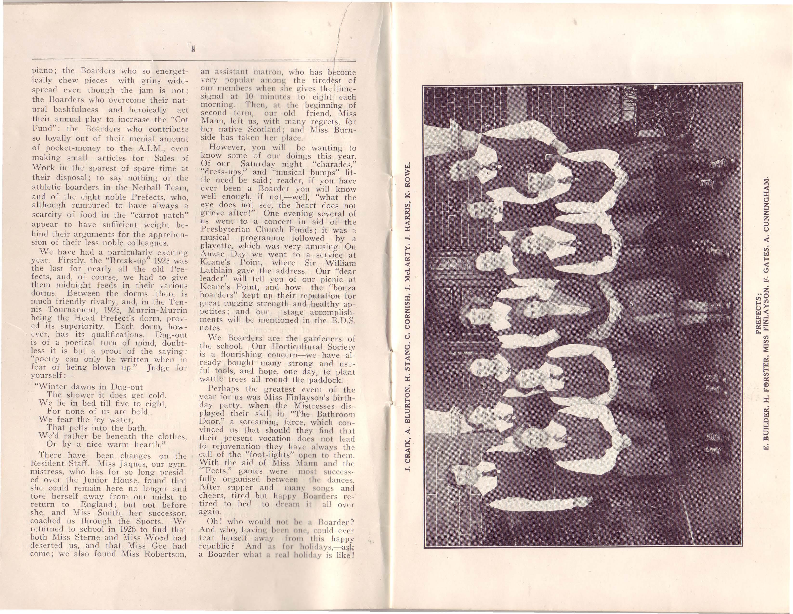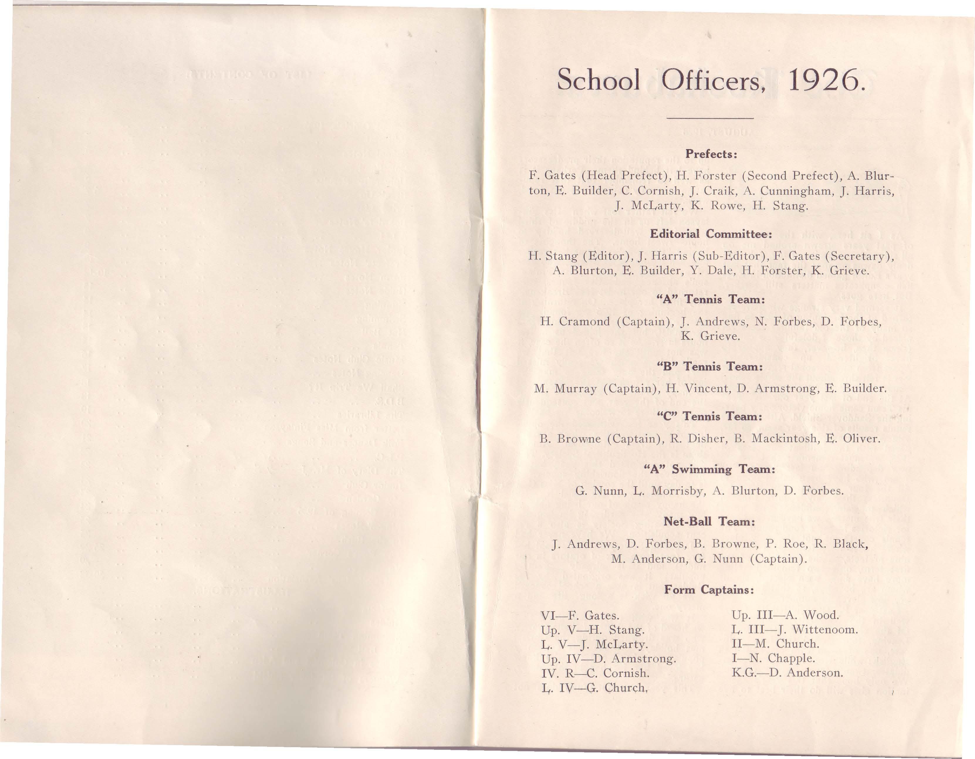 It seemed very strange when we returned at the beginning of 1926 to find so many of the old familiar faces rep laced by those of doleful 'new chumo' (since then, however, they appeat· to have brightened up considerably). Apart from any personal regrets· the1r loss is felt throughout the whole -more especially on the sports field. At the end of last year our "A" Tennis Team came home victoriously bearing the Sandover Shield. Although the tennis results of this year seem, so far somewhat disappointing, when pared with the brilliant successes A 1925, we must remember that we 01re now depending on last year's "B" Team ,who have been called upon to fill the four vacancies in the "A". Doubtless they only require time in which to gain confidence and prove their true mettle: we have great hopes for victories in the second round. The tennis court was not the only place where losses wer e felt. Of a band of nine prefects, at th e be g inning of the first term. onl v two remained. Nine more have since been e l ected, six of whom are board e t·s, so that the 'fects are now eleven in number.