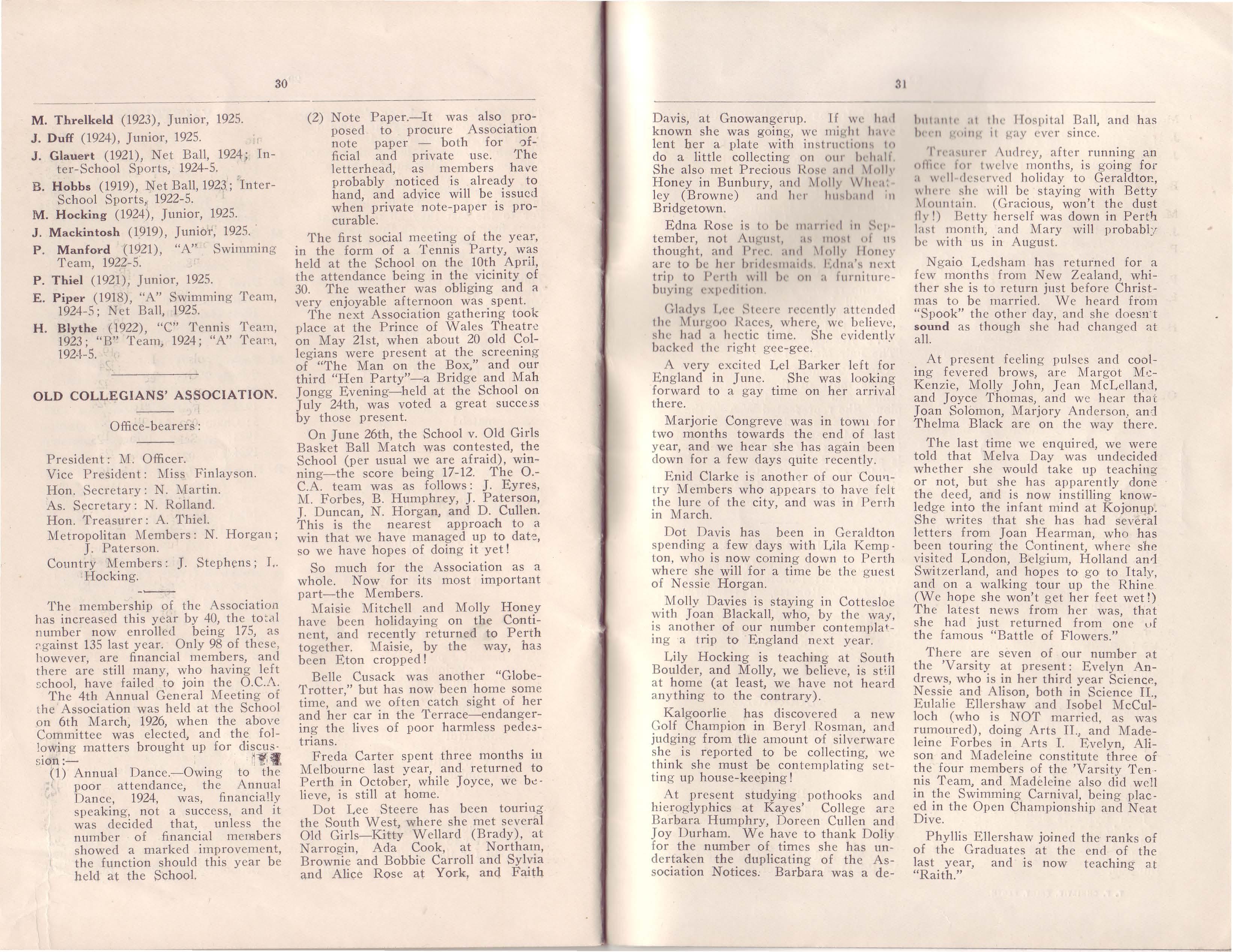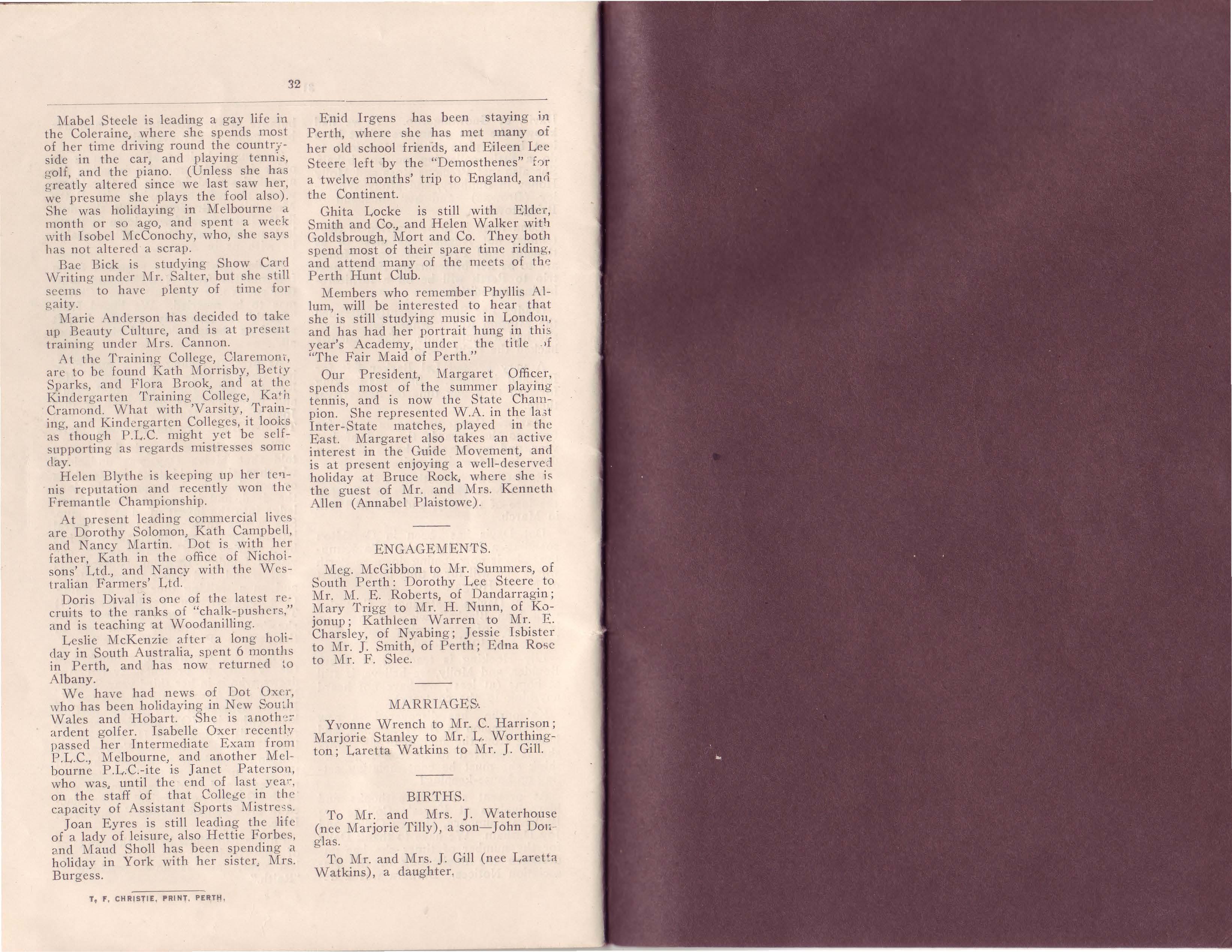 We have had news of Dot Oxe1-, who has been holidaying in N ew Sou ch Wa l es and Hobart. She is anoth •, 7 a rd ent golfer. Isabelle Oxer recentlv passed her Intermediate Exam from P.L.C., Melbourne, and ano th er Melbourne P.L.C.-ite is Janet Paterson, who was, until the end of last yea•-, on the staff of that Collc5e in th e capacity of Assistant Sports Mistre,;s Joan Eyres is still leading the life of a lady of leisure, also Hettie Forbes, a nd Maud Sholl has been spending a holidav in York with her sister . Mrs. Burgess.T F CHRISTIE , PRINT , PERTH