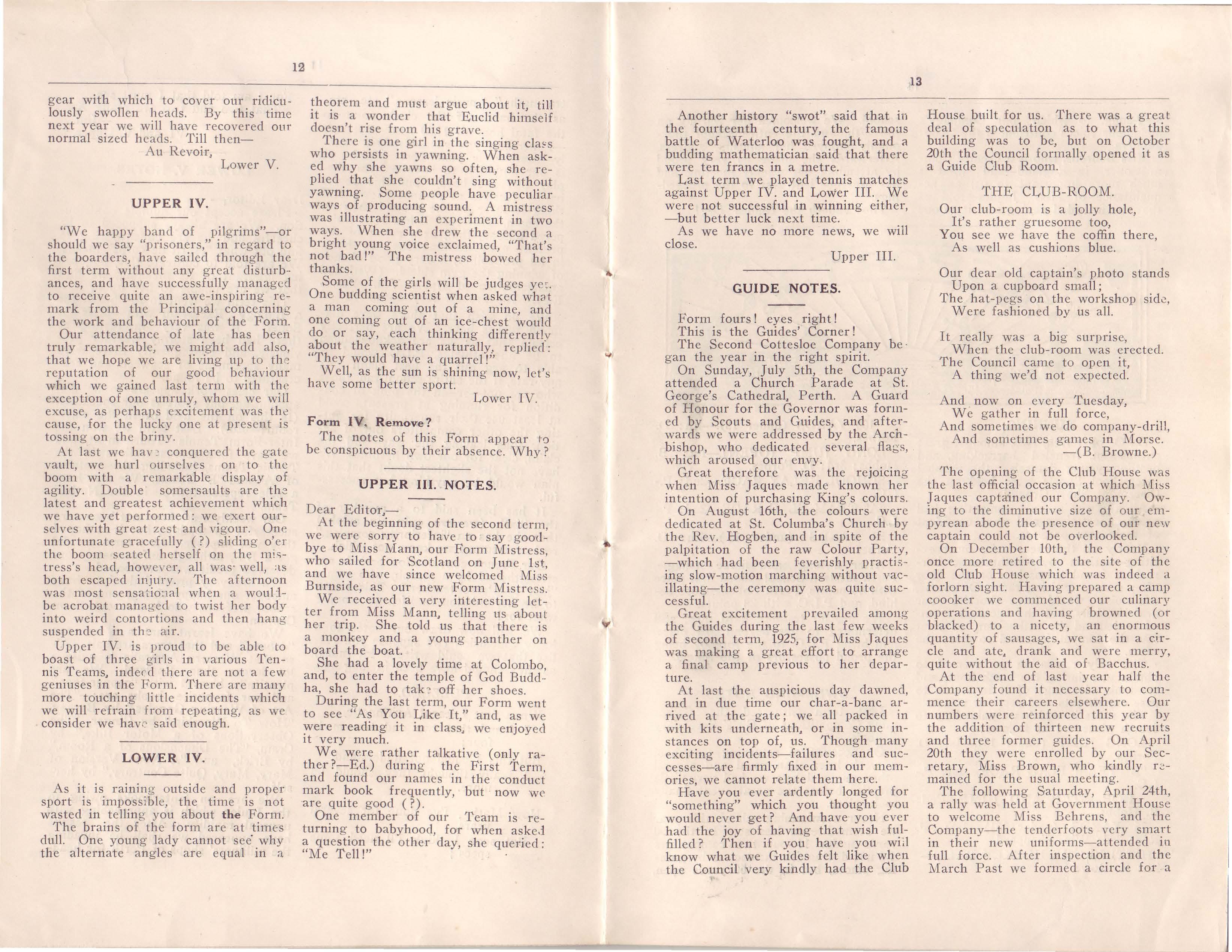 Miss Behrens, County-Commissioner of Girl Guides in England, aclclressecl th;: school. Miss Behrens is on a health tour, and remained in our State for several weeks, during w h ich time she did very good work among the Guides.