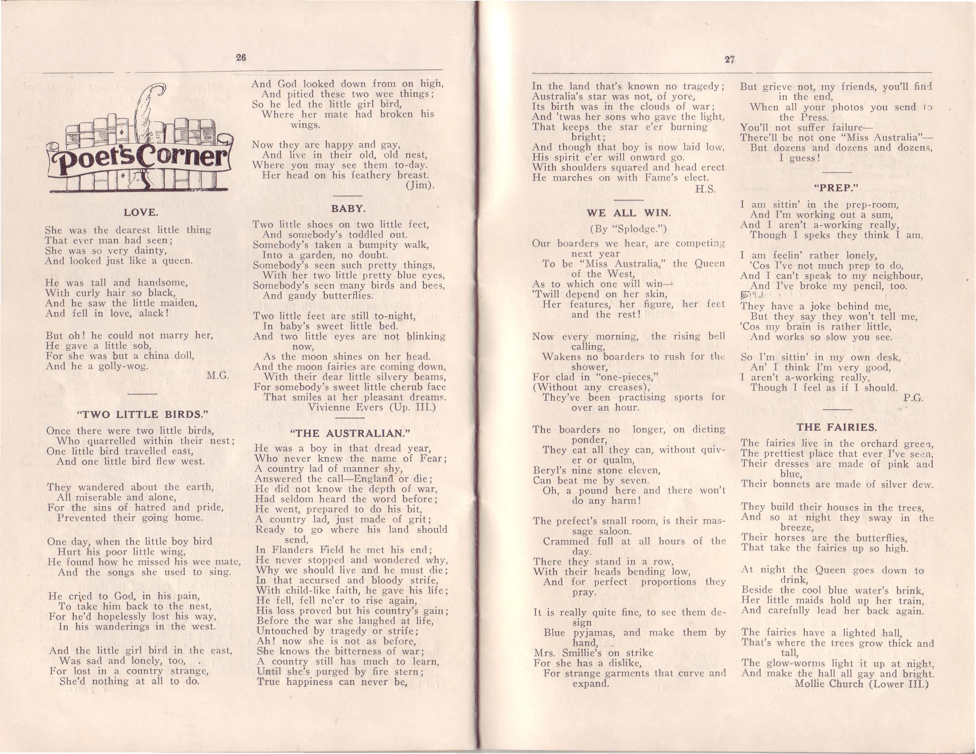 There arc seven of our number the 'Varsity at present: Evelyn Andrews, who is in her third year Nessie and Alison, both in Science II.: Eulalie Ellershaw and Isobel McCulloch (who is NOT married, as was rumoured), doing Arts IT., and Madeleine Forbes in Arts I. Evelyn, Alison and Madeleine constitute three of the four members of the 'Varsity Tennis Team, and Madeleine also did well in Swimming Carnival, being placed 111 the Open Championship and Neat Dive.
