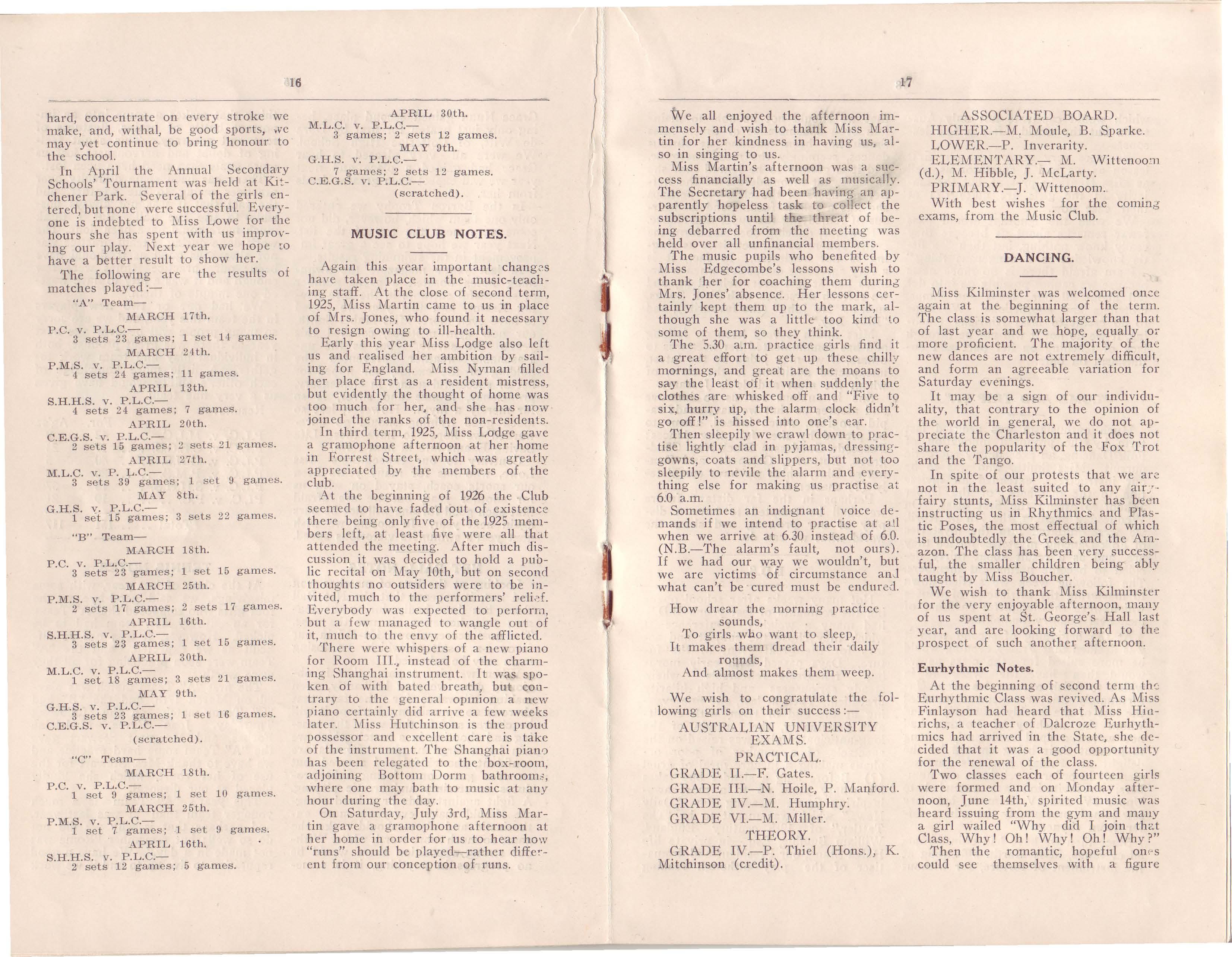 The first Eurhythmic Class was held. Miss Wittenoom previous ly taught the girls, but she left in 1922, and since t h en there has been no cl ass at a ll unt.il M!ss Hinrichs. who has latei:,; arnved 111 thts State. and who is an excellent teacher of Dalcroze Eurhythmics, offered her services. Unfortunately, she is unable to take a lan:e class, greatly to the disappointment af many of the girls.