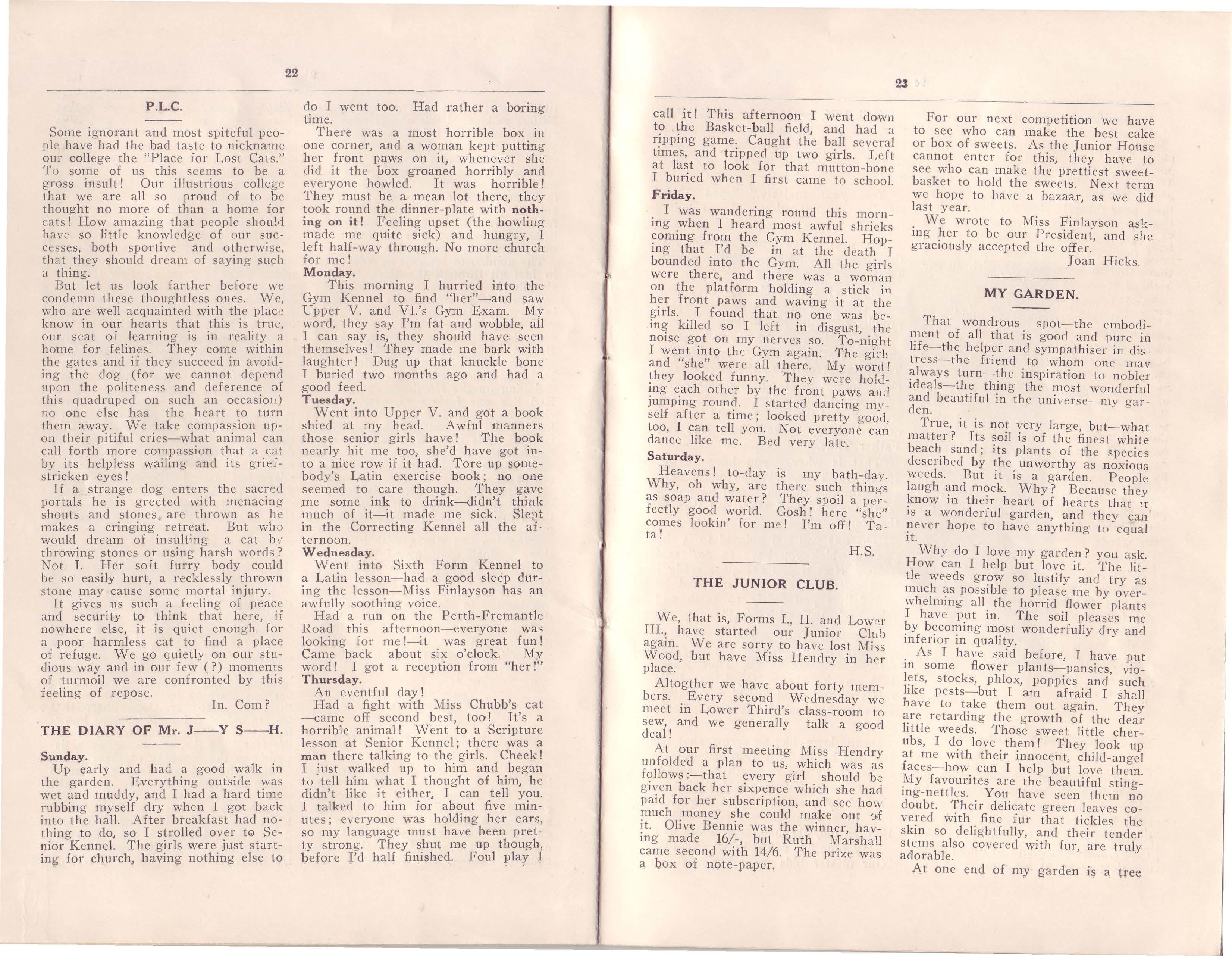 The last time we enquired, we were told that Melva Day was undecided whether she would take up teaching or not, but she has apparently done the deed, and is now instilling knowledge into the infant mind at Kojonup. She writes that she has had several l etters from Joan Hearman, who has been touring the Continent where she visited London, Belgium, Ho ll and awl Switzerland, and hopes to go to Italy, and on a wa lking tour up the Rhine (We hope she won't get her feet wet l) The news from her was, that she had JUSt returned from one uf the famous "Battle of Flowers."