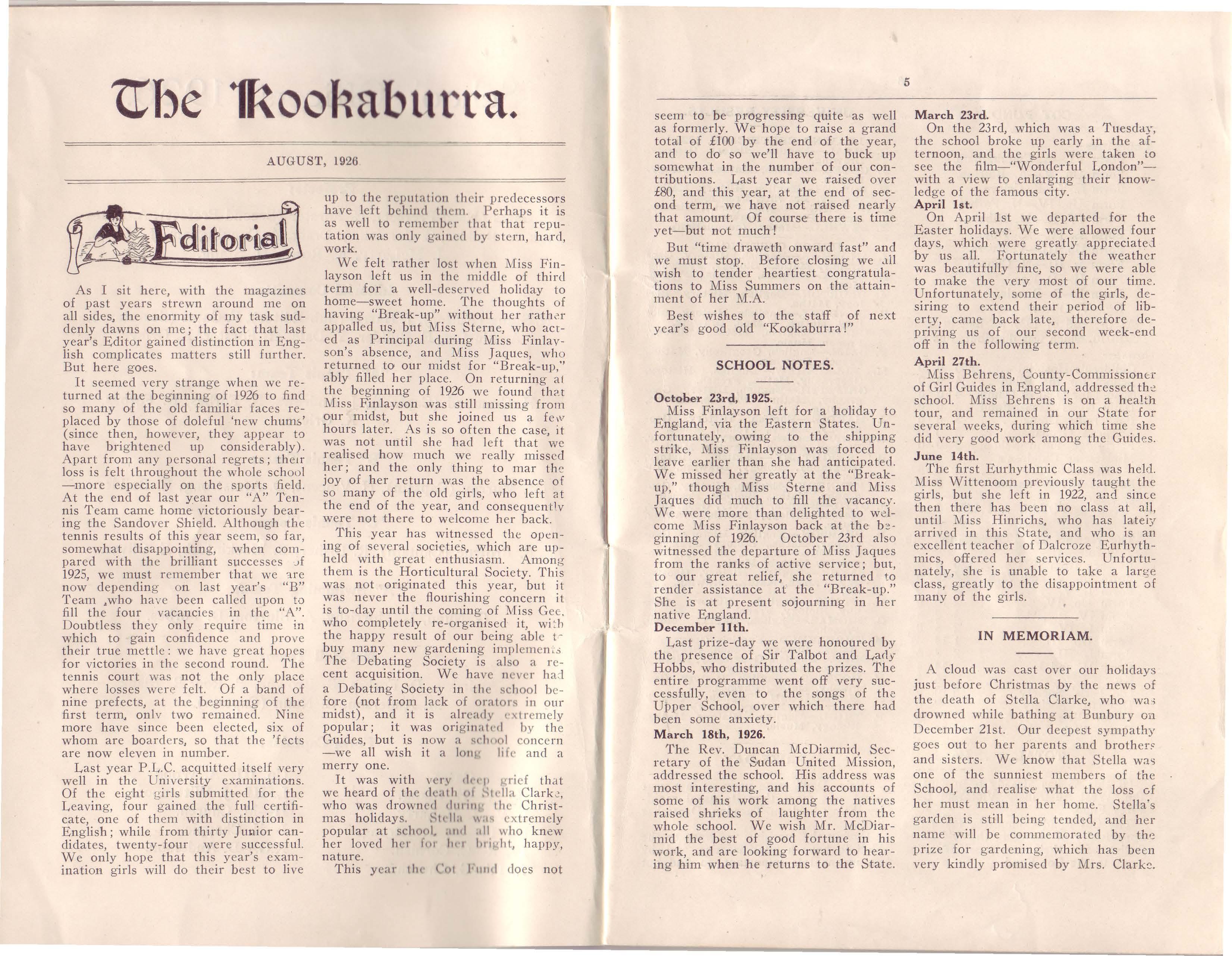 A cloud was cast over our holidays just before Christmas by the news of the death of Stella Clarke, who was drowned while bathing at Bunbury 0>1 December 21st. Our deepest sympathy goes out to her parents and brother> and sisters. We know that Stella one of the sunniest members of the School, and realise what the loss c.f her must mean in her home Stella's garden is still bein g tended, and her name will be comme morated by tlv'! prize for gardening, which has been very kindly promised by Mrs. Clarke.