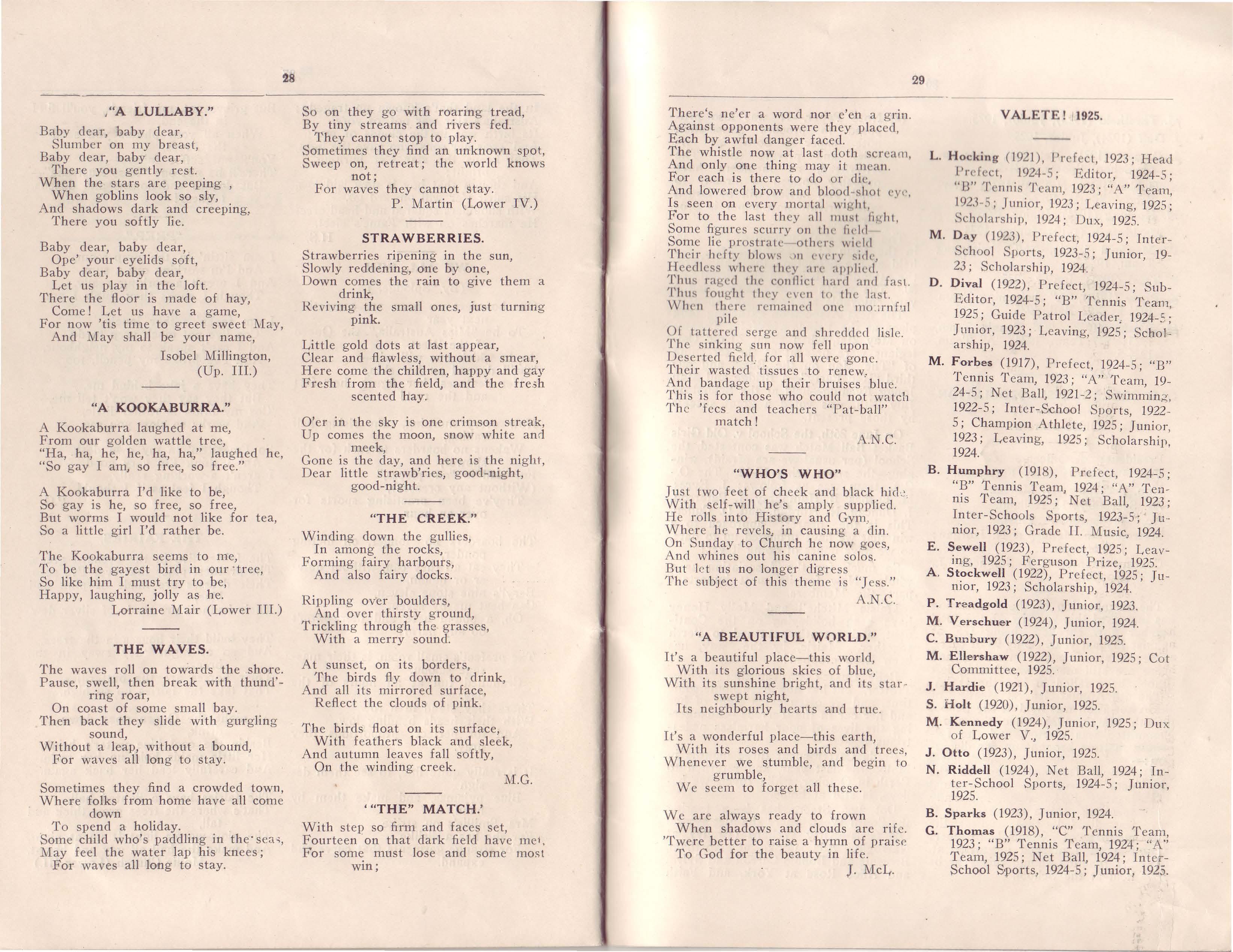 B. Humphry (1918), Prefect, 1924-5; "B" Tennis T ea m, 1924 ; "A" Tenms Team , 1925; Net Ball, 1923; Inter-Schools Sports, 1923-5 ; Junior, 1923; Grade II Music, 1924.