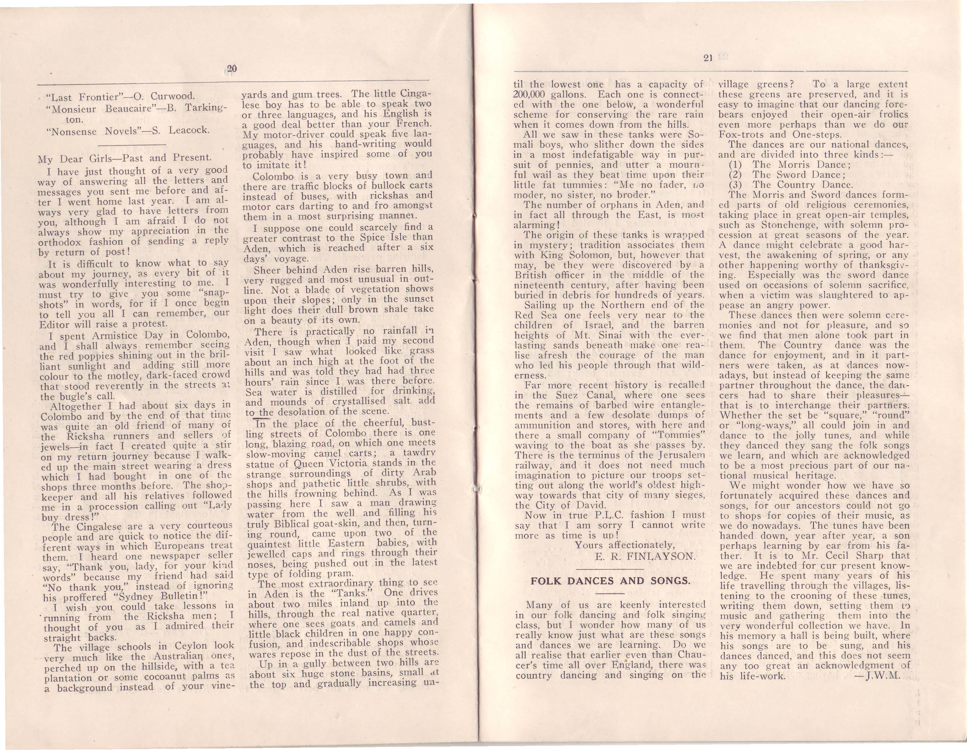 Miss Finlayson left for a holiday to England, via the Eastern Sta t es. Unfortunately, owing to the shipping strike, i\Iiss Fin layso n was forced to l eave earlier than she had anticipated. We missed her great ly at the "Breakup," though Miss Sterne and M i ss Jaques did much to fi ll the vaca n c;·. We were more than delighted to we'!come Miss Finlayson back at the ginning of 1926. October 23rcl also witnessed the departure of Miss Jaqu':!s from the ranks of active service· but to our great relief, she 1·encler assistance at the "Break-up." She is at present sojourning in her native Eng land.