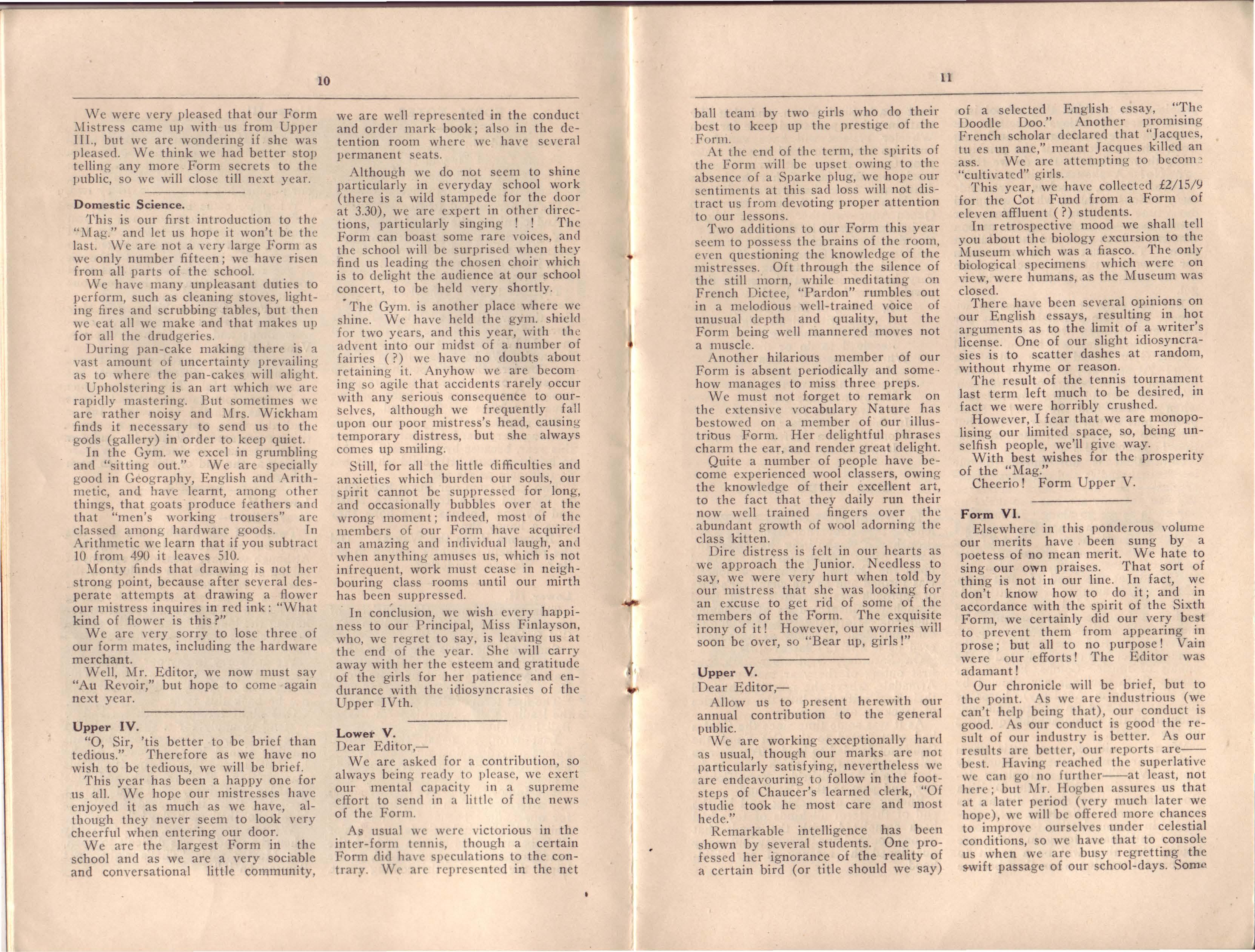 In conclusion I should likd to thank 11iss Summers, and Nancy Baird for the snaps of the various teams for the magazine, and Nancy Roberts for t h e views of P.L.C. Thanks are also due to all the mistresses who have he lpe •l with the work of the ::v[ag, and also t h e Committee for all they have clone to make it a success. All good wishes a n d sympathy to next year's comm i ttee I They will, doubtless need the sympathv when they realise that t h e product ioi1 of a school magazine is not all the fun that it might seem.