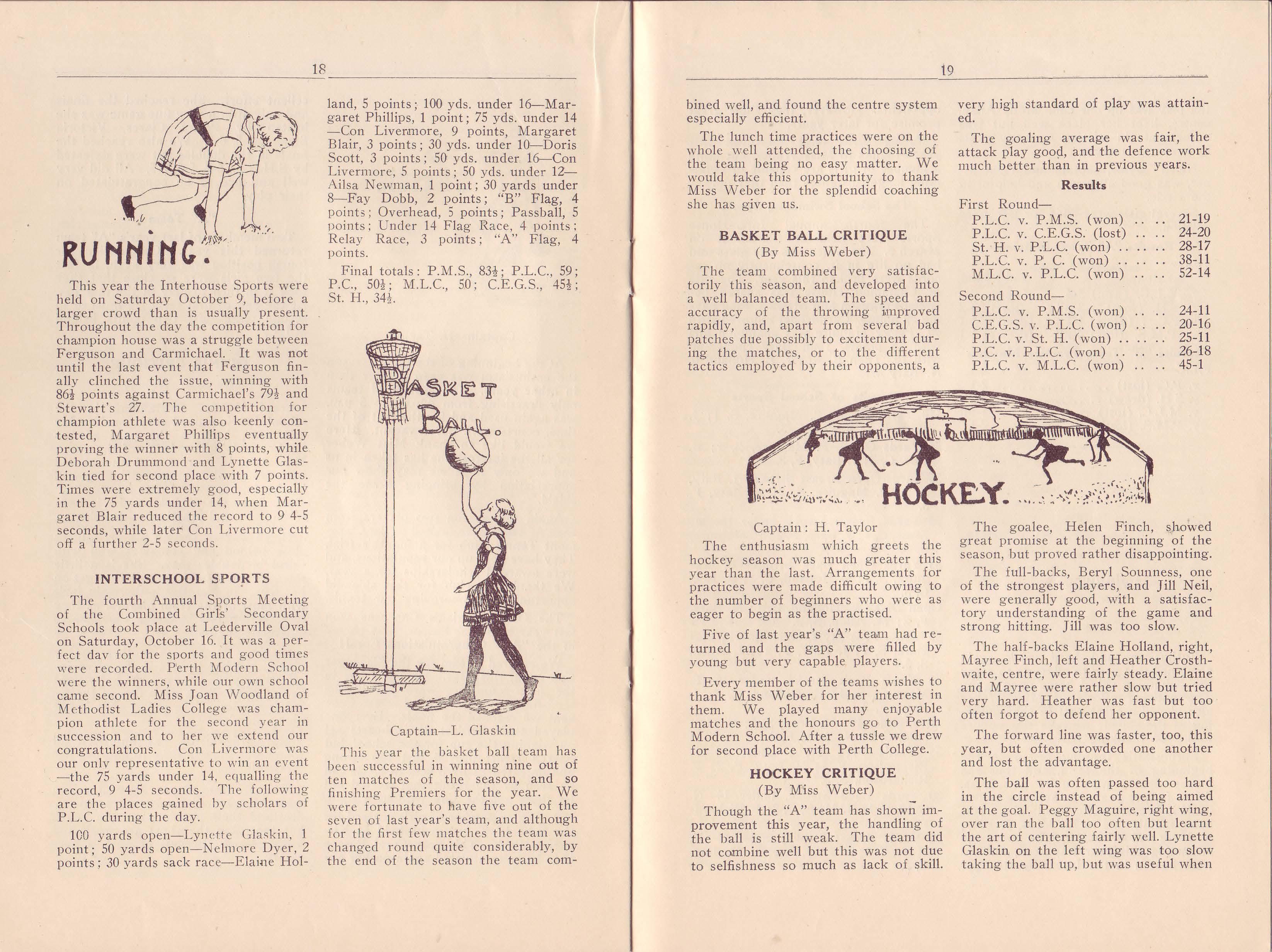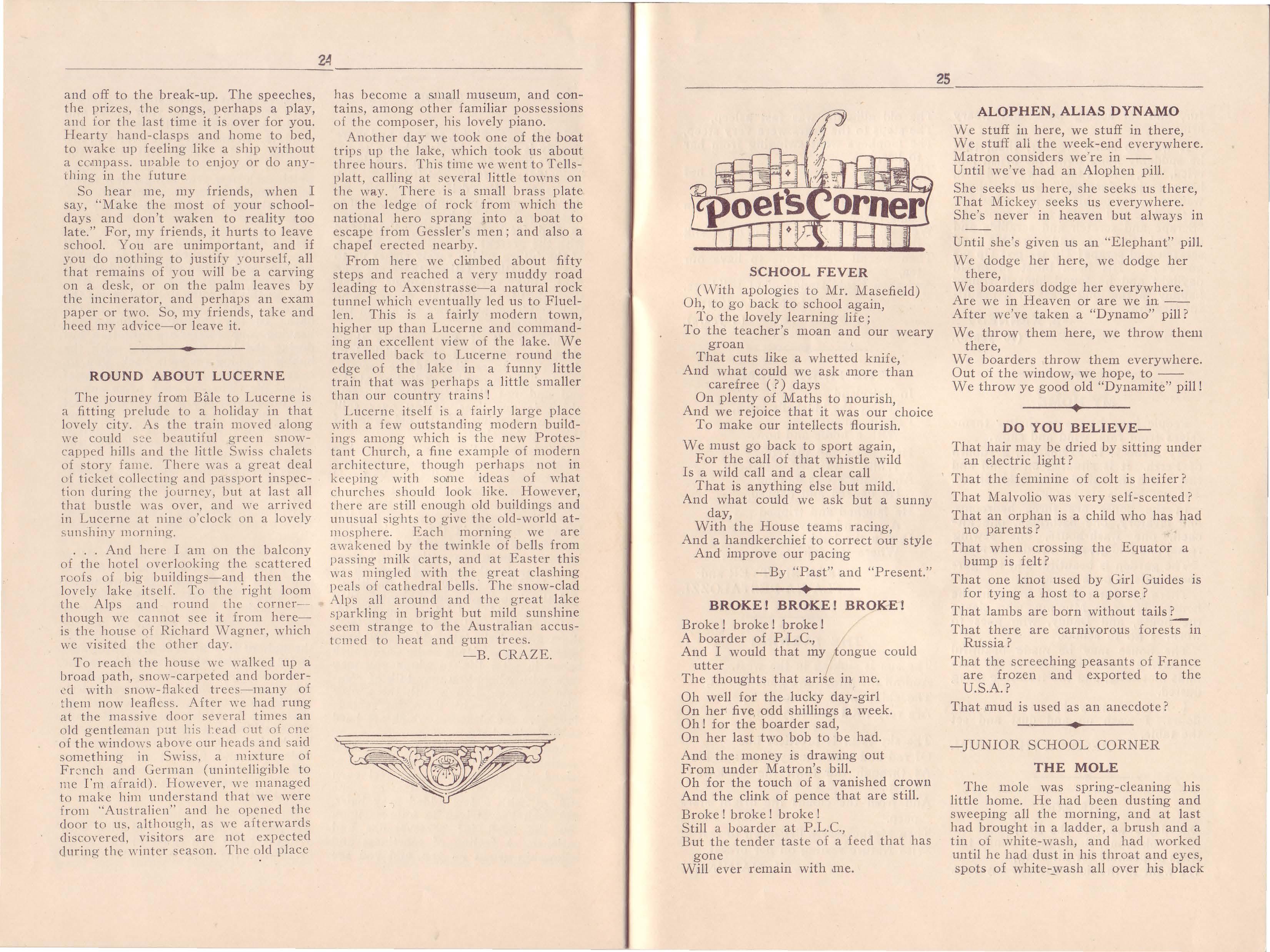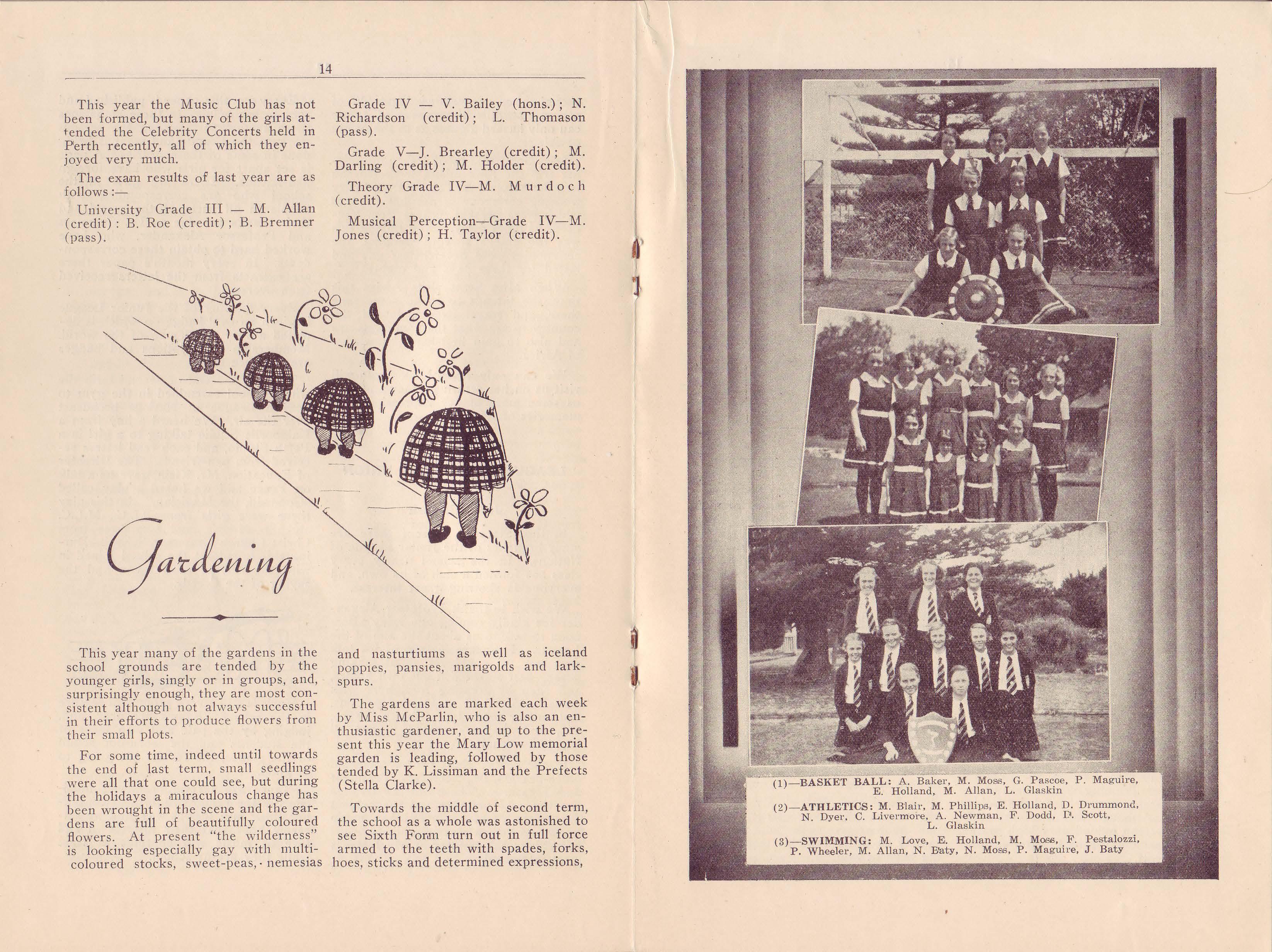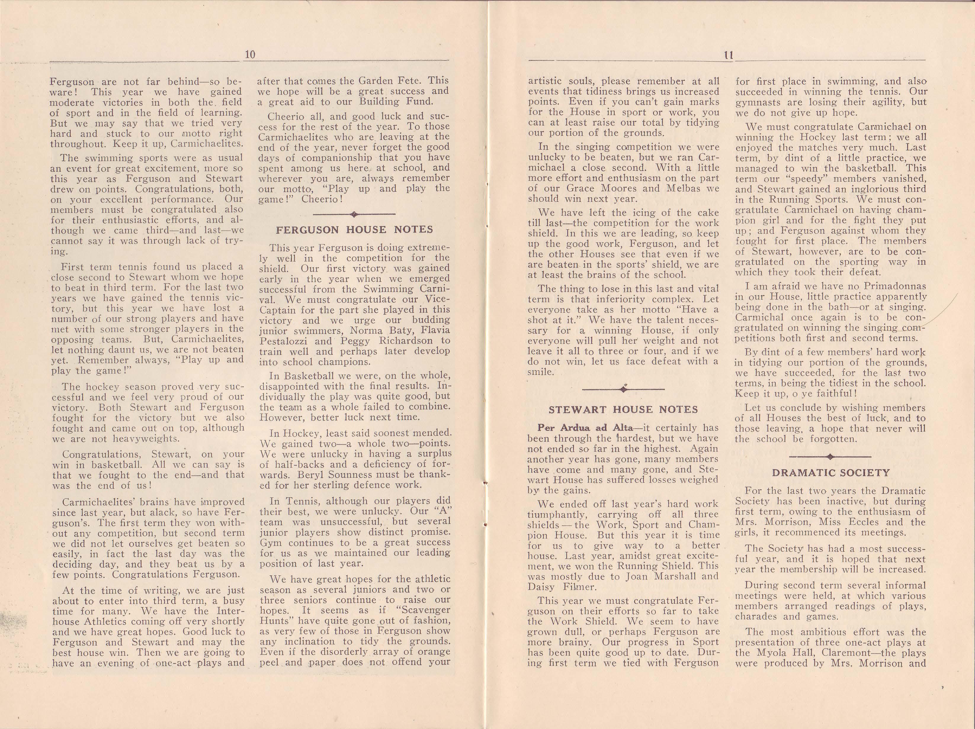On the 16th of June we held a tea at the Pleiades Club which was very well attended. Miss Freer and Miss Le Souef were present and many of their former pupils were pleased to be able to speak to them once more . Dr. Grace Clarke, a one-time member of the Staff who returned from England this year, gave a most interesting informal talk on her travels in Germany.