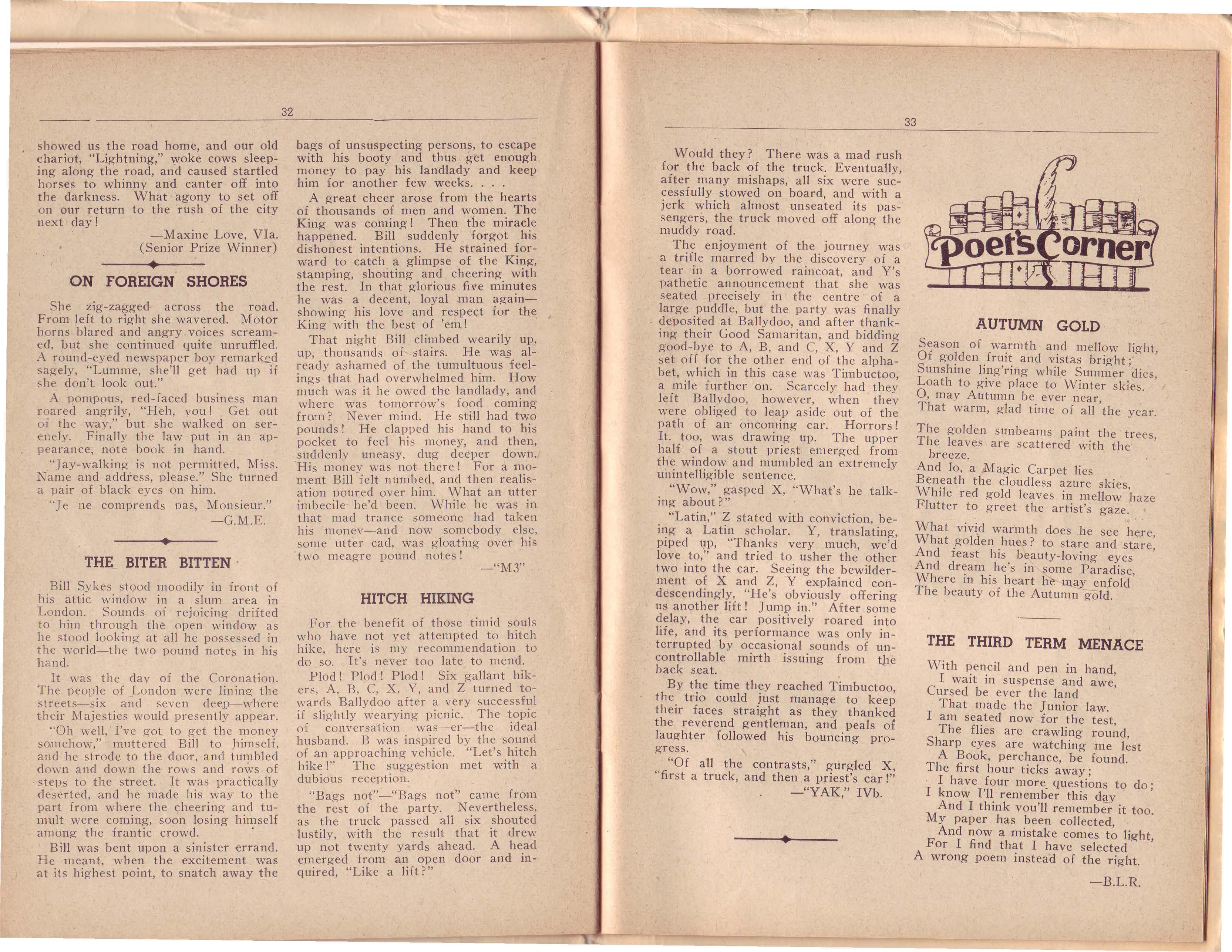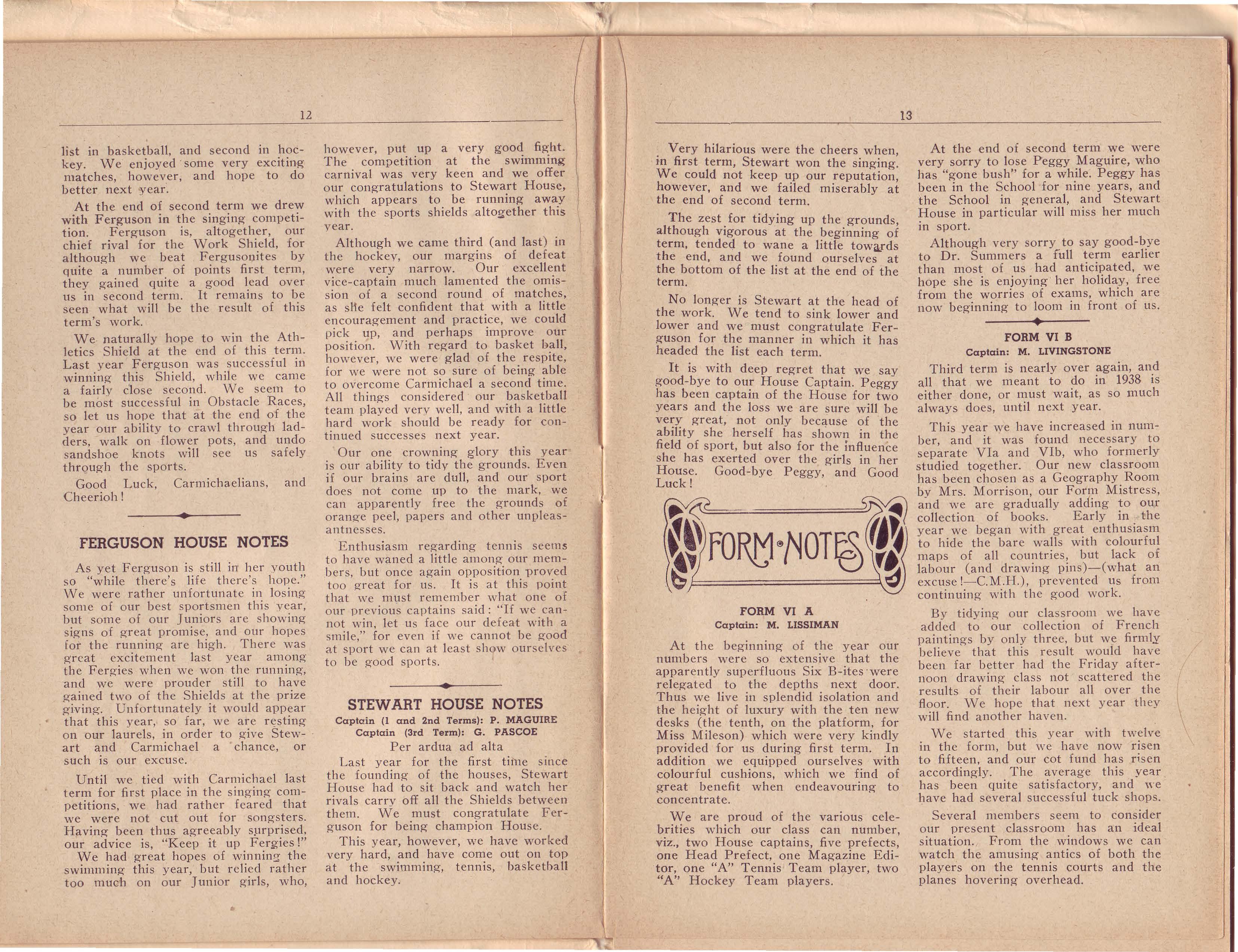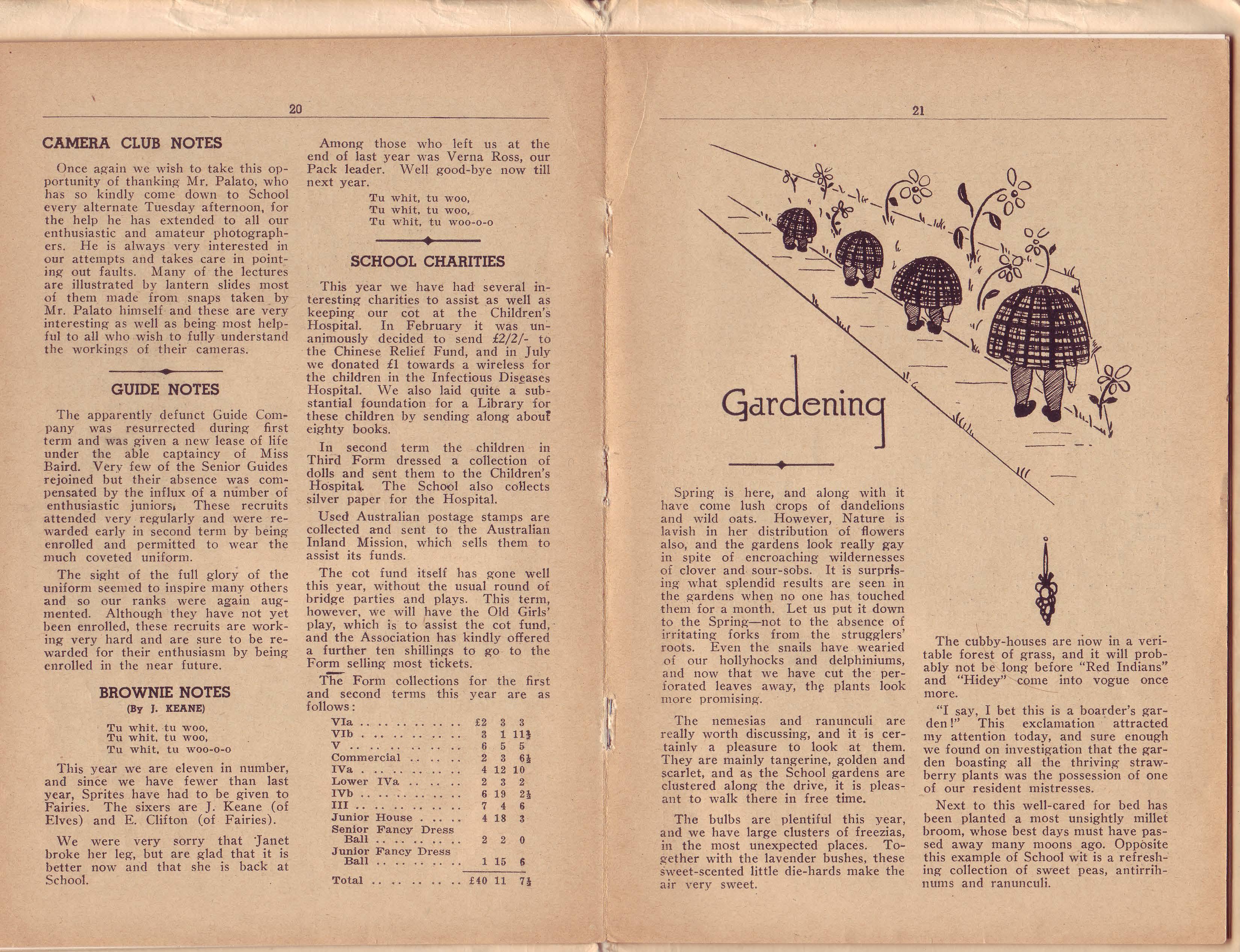 greenery which made the wall bars perfectly enchanting on Monday night had a decidedly bedraggled appearance on Wednesday morning. Our thanks are due to all those who helped decorate the gym., as well as those who spared their valuable time effecting repairs. Because of, or perhaps in spite of our efforts at beautification, both parties were quite successful and resulted in a total profit of about £4.