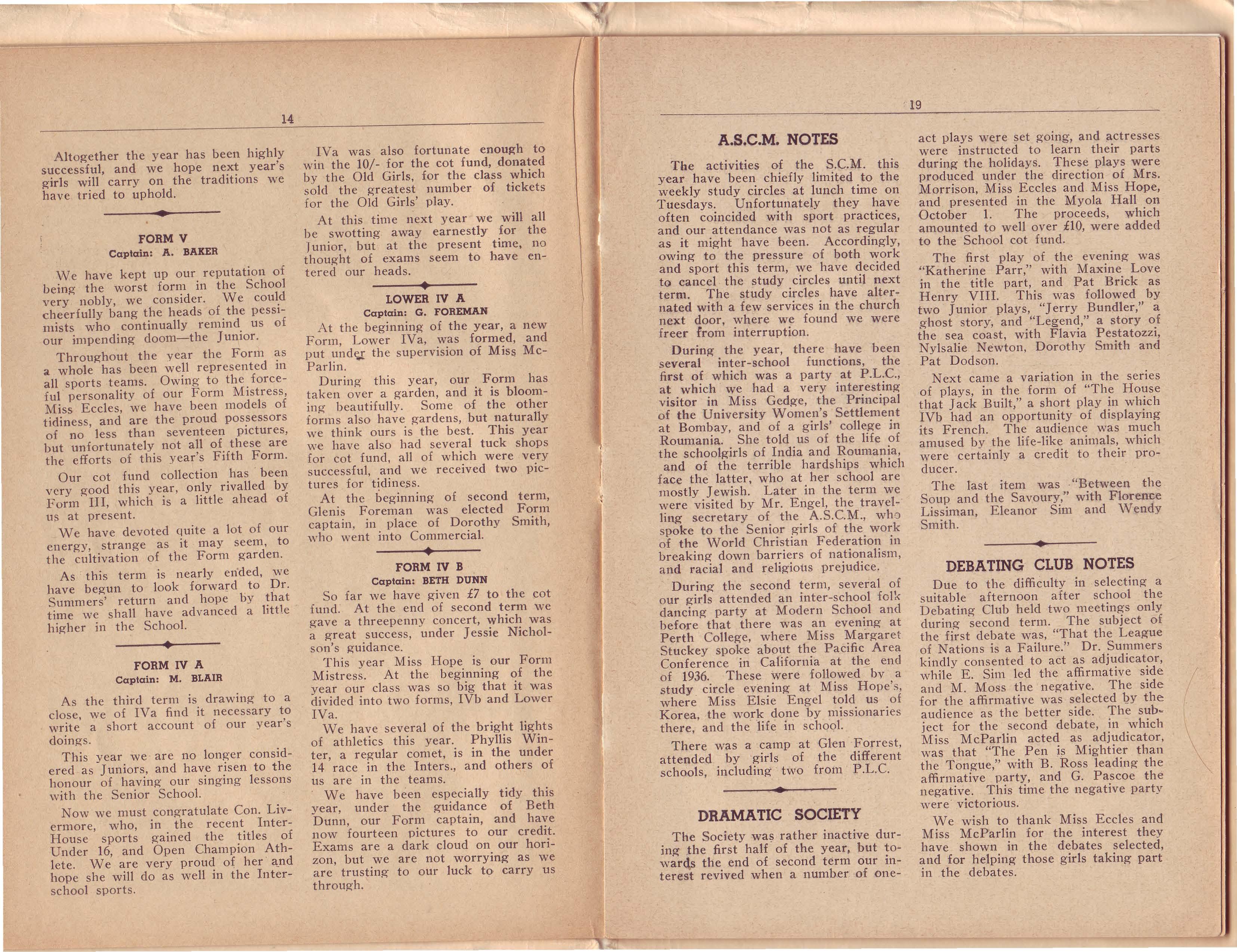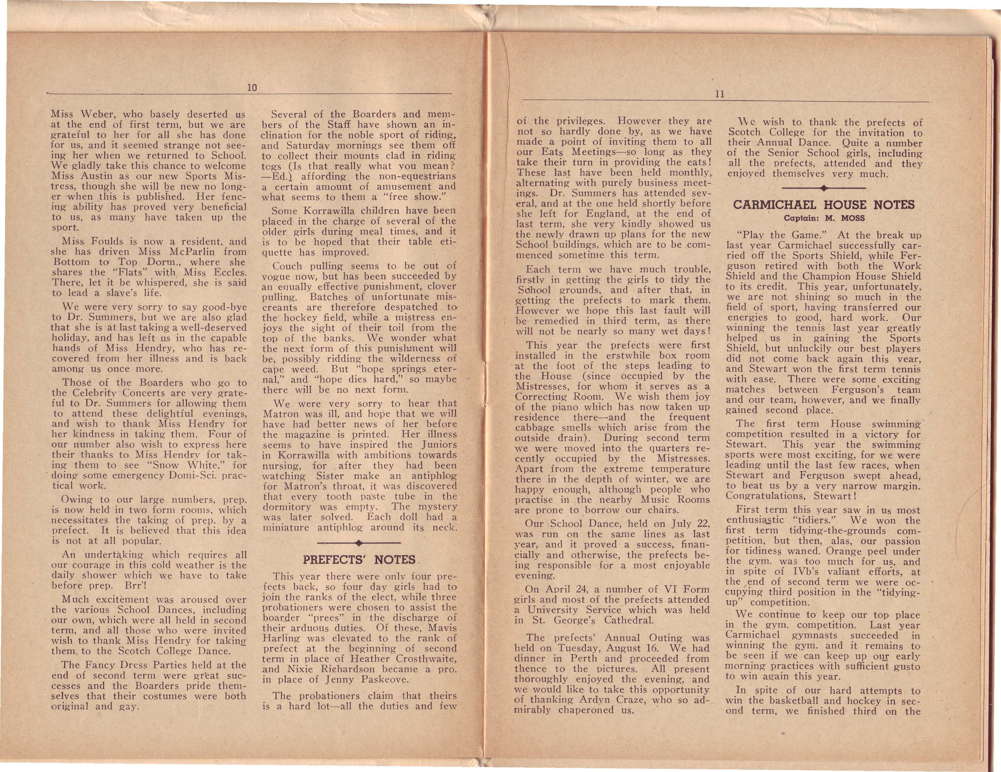 There have been several changes of staff this year. First of all, Miss Hendry is Acting Principal in D_r. Summers' absence, while Miss Sibree has come from the Eastern States and takes Dr. Summers' senior English classes. Also, we were very sorry to lose Miss Ross, who left us last year for a position in Victoria, and Miss Weber, who went at the end of first