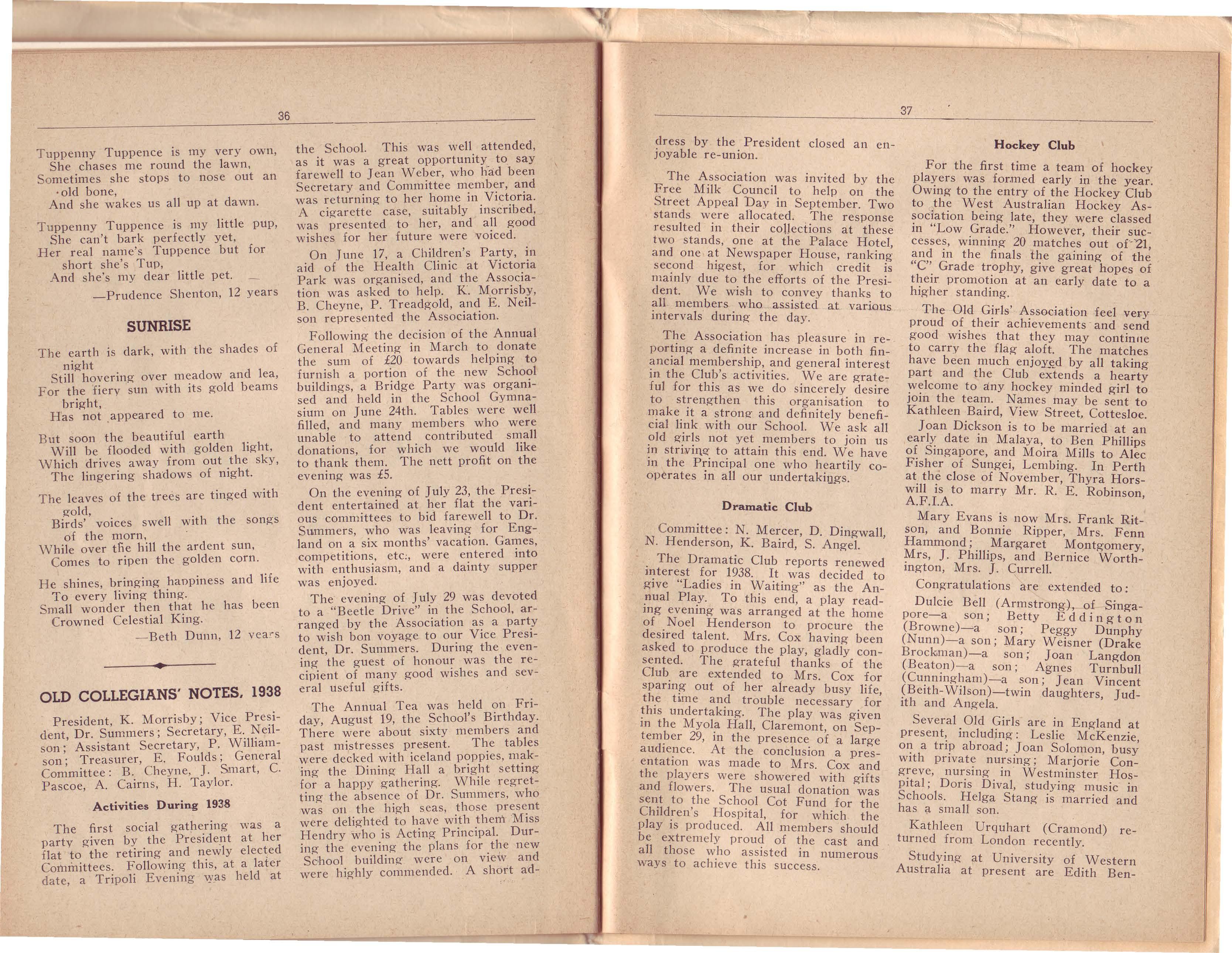 The Dramatic Club reports renewed mterest for 1938. It was decided to give "Ladies in Waiting" as the An_nual Play. To this end, a play readmg evemng was arranged at the home of Noel Henderson to procure the desJred talent. Mrs. Cox having been asked to produce the play, gladly consented. The grateful thanks of the Club_ are extended to Mrs. Cox for spannl' out of her already busy life, th_e hme an? trouble necessary for undertakmg. The play was given 111 the Myola Hall, Claremont on Septem_ber 29, in the presence of a large audtence. At the conclusion a presentatiOn was made to Mrs. Cox and the players were showered with gifts and flowers. The usual donation was sent to the School Cot Fund for the Child_ren's Hospital, for which the play IS produced. All members should be extremely proud of the cast and all those who assisted in numerous ways to achieve this success.