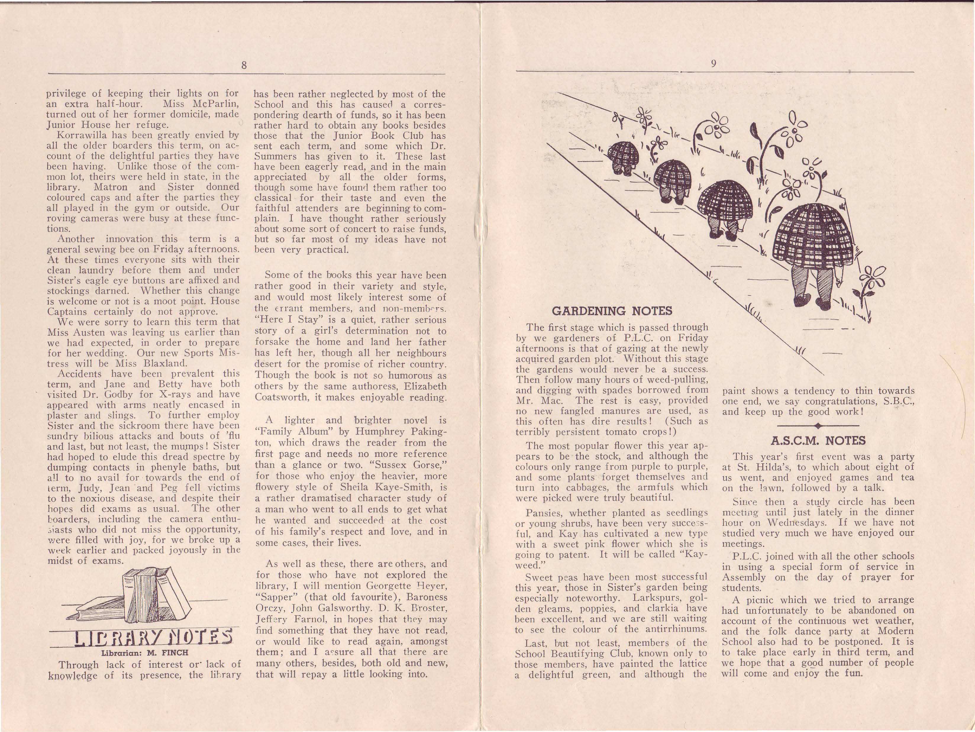 Another innovation this term is a general sewing bee on Friday afternoons. At these times everyone sits with their clean laundry before them and under Sister's eagle eye buttons are affixed and stockings darned. Whether this change is welcome or not is a moot point. House Captains certainly do not approve.