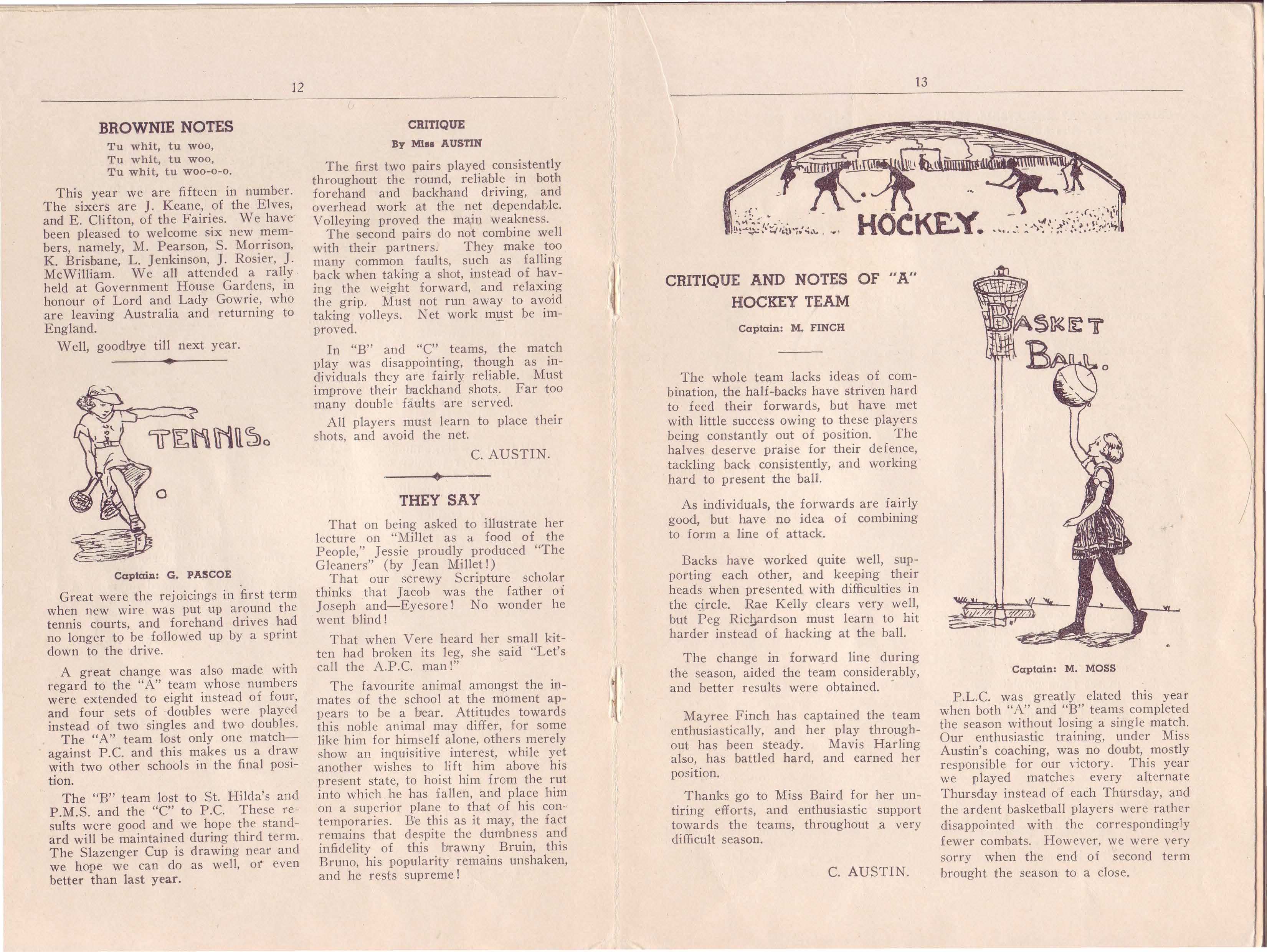 We were sorry to learn this term that Miss Austen was leaving us earlier than we had expected, in order to prepare for her wedding. Our new Sports Mistress will be Miss Blaxland.