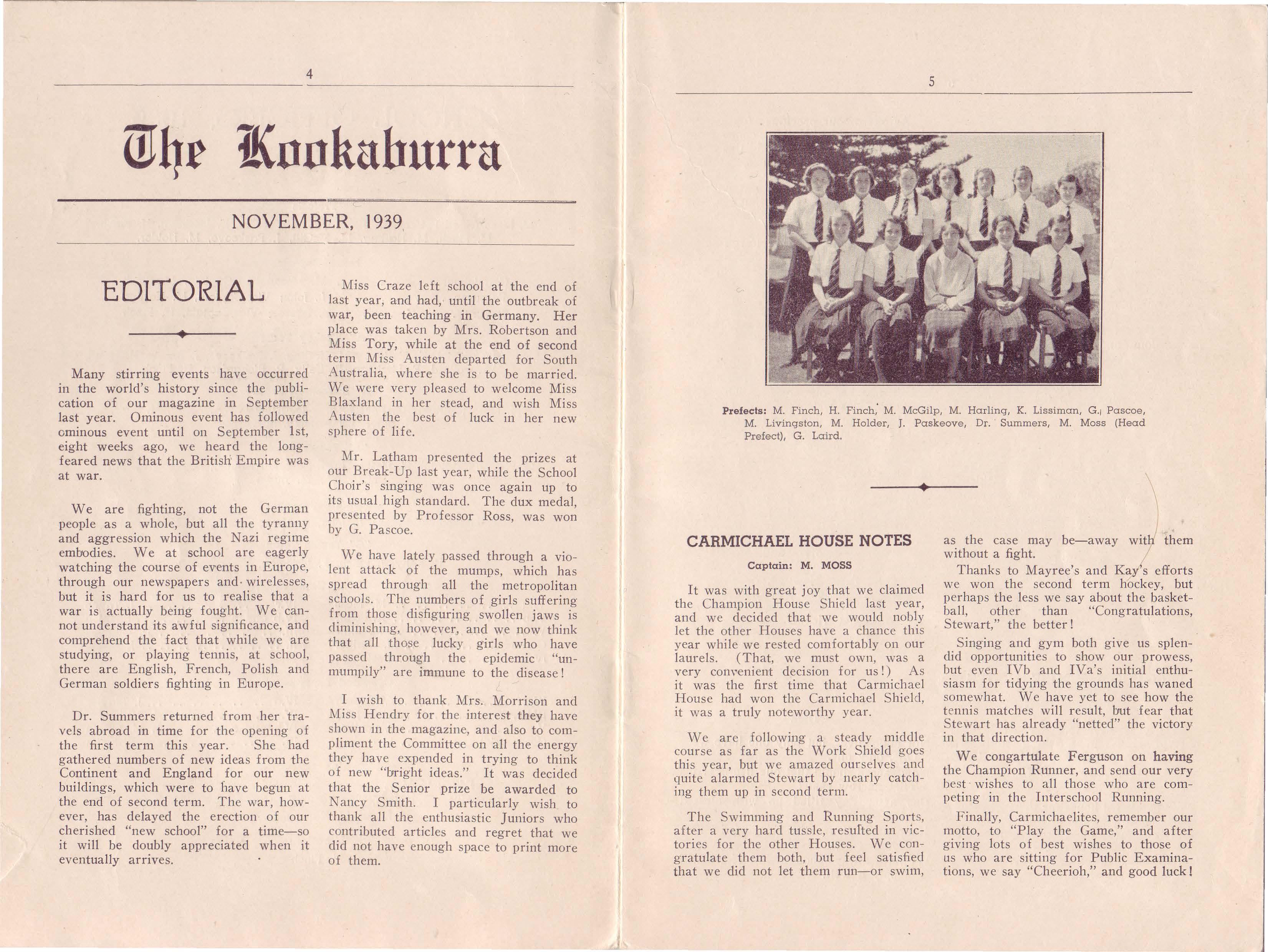 Prefects: M. Finch, H. Finch: M. McGilp, M. Harling, K. Lissiman, G.1 Pascoe, M. Livingston, M. Holder, J. Paskeove, Dr. Summers, M. Moss (Head Prefect), G. Laird