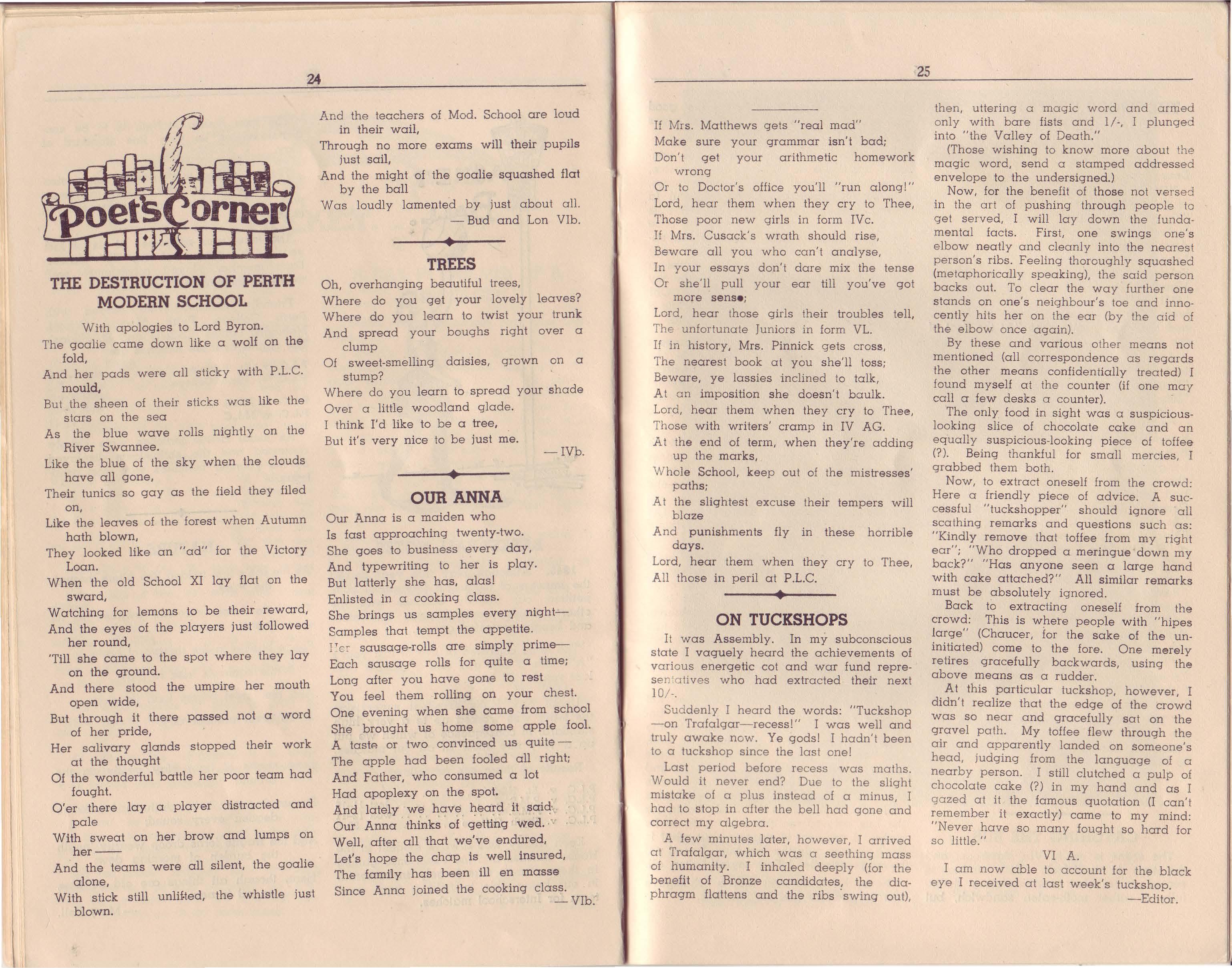 The main event of the year was, as usual, camp, which was held at Log Cabin, Greenmount for five days of the August holidays. There were about twenty-five campers from various schools, but P.L.C. representatives far outnumbered those of any other school. We all enjoyed the short five days of fun and fellowship in ideal weather, and with the exhilarating leadership of Mrs. Fletcher, the travelling Secretary of the Movement, camp was a great inspiration to us all.