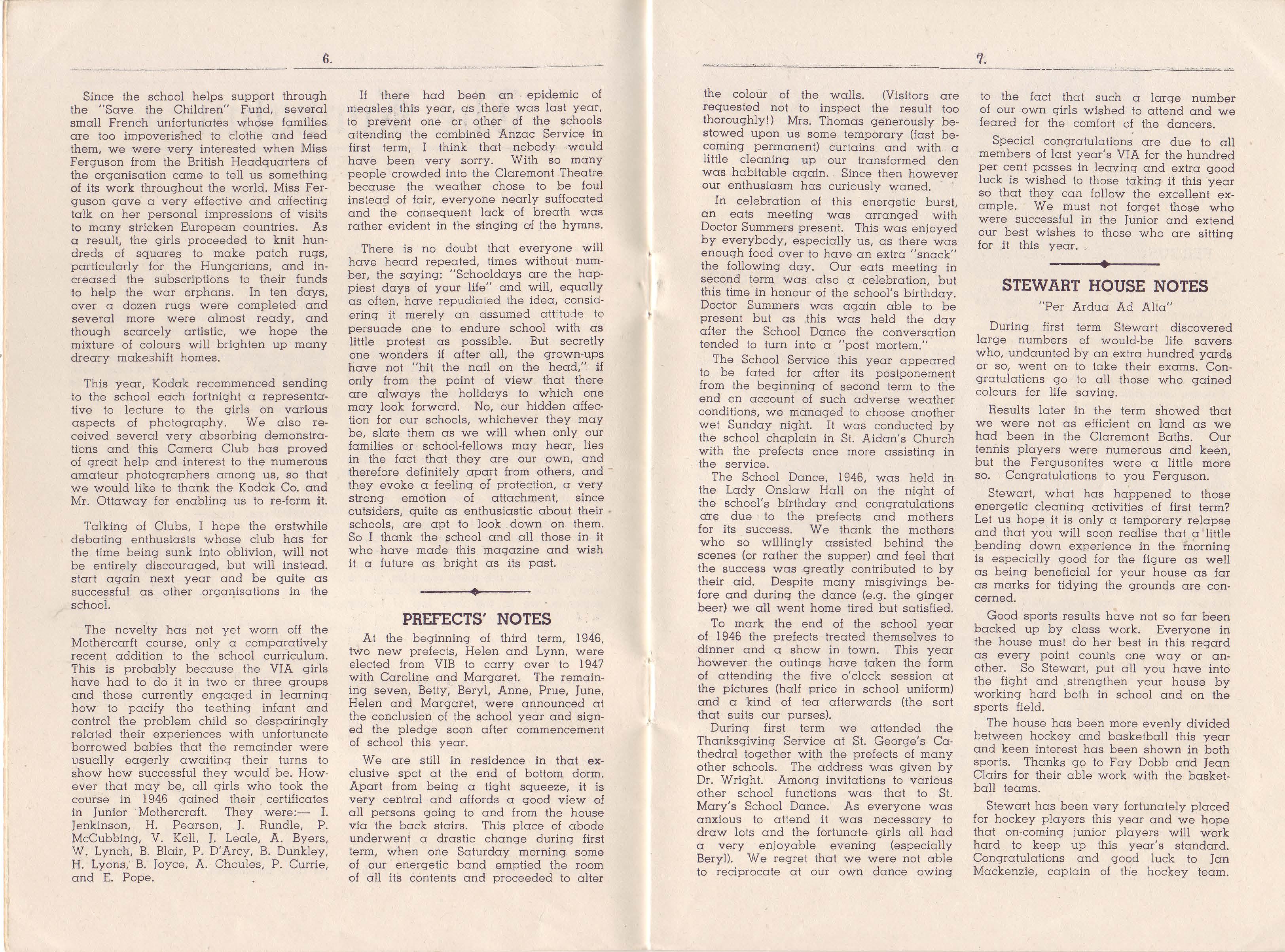 At the beginning of third term, 1946, two new prefects, Helen and Lynn, were elected from VIB to carry over to 1947 with Caroline and Margaret. The remaining seven, Betty, Beryl, Anne, Prue, June, Helen and Margaret, were announced at the conclusion of the school year and signed the pledge soon after commencement of school this year