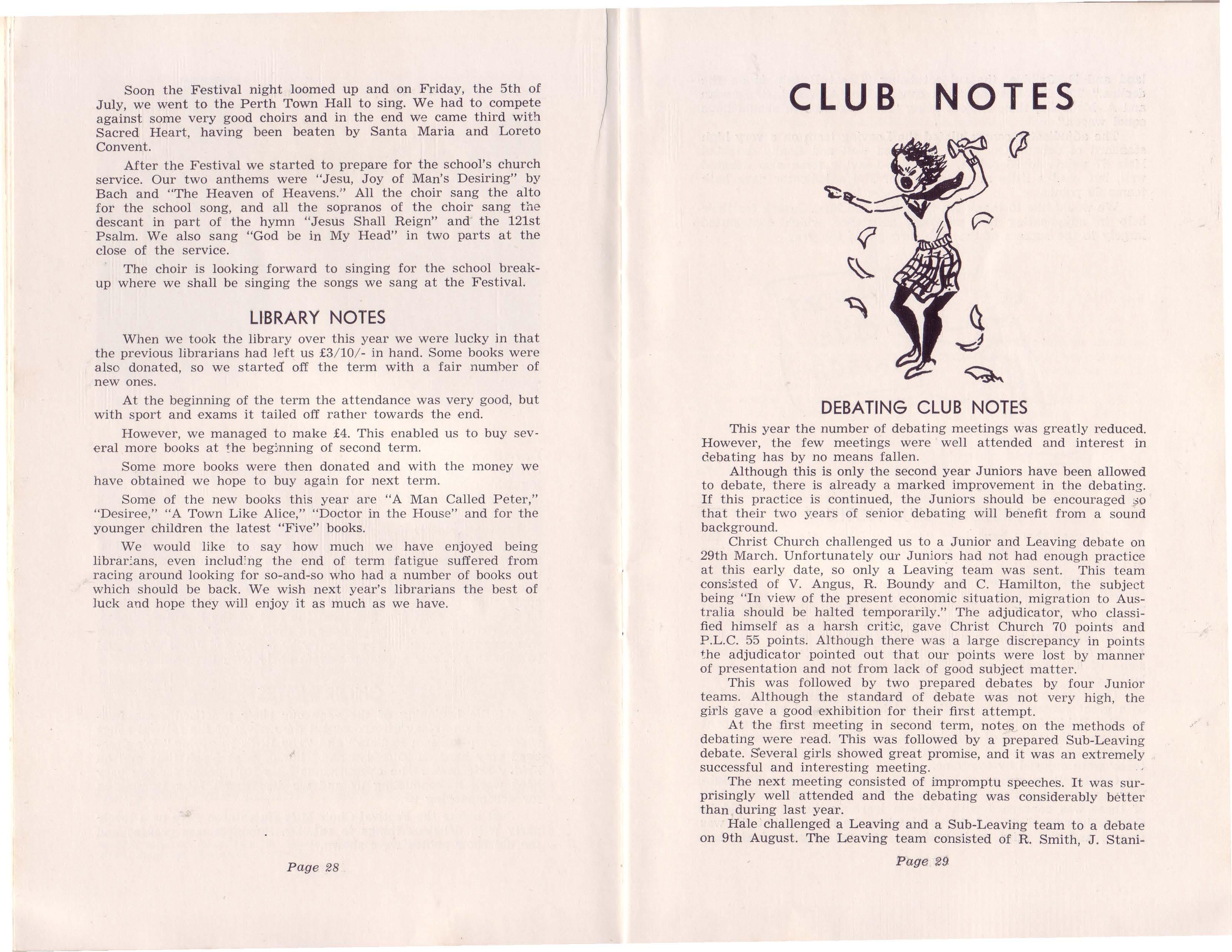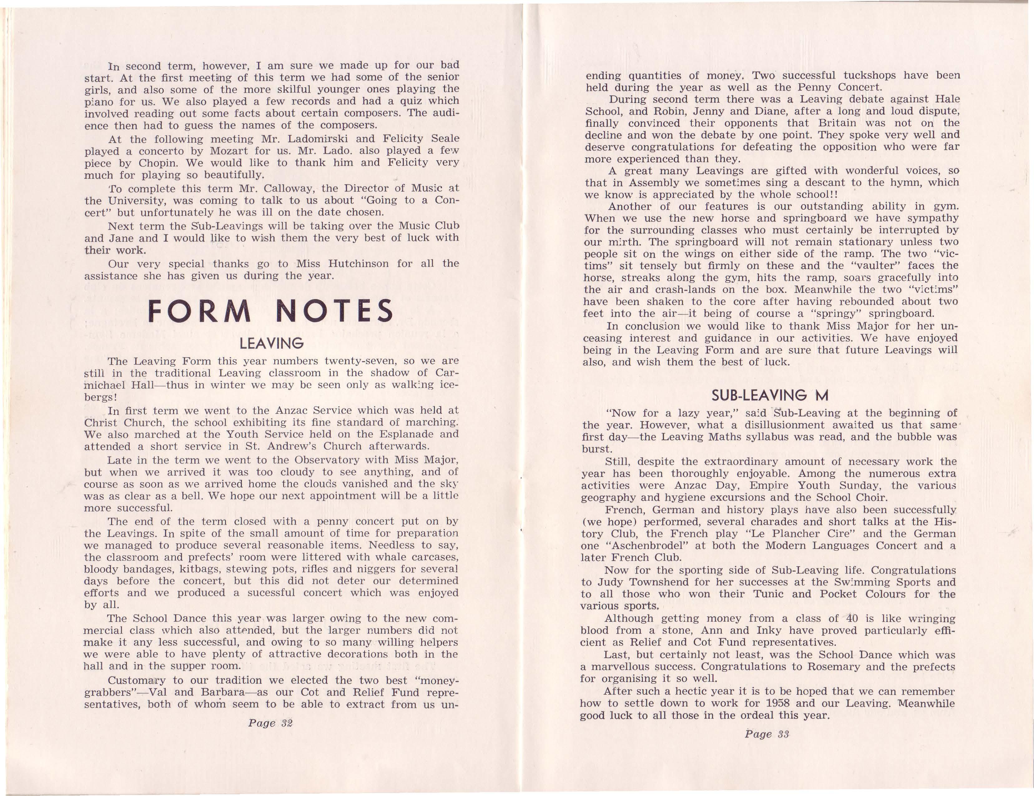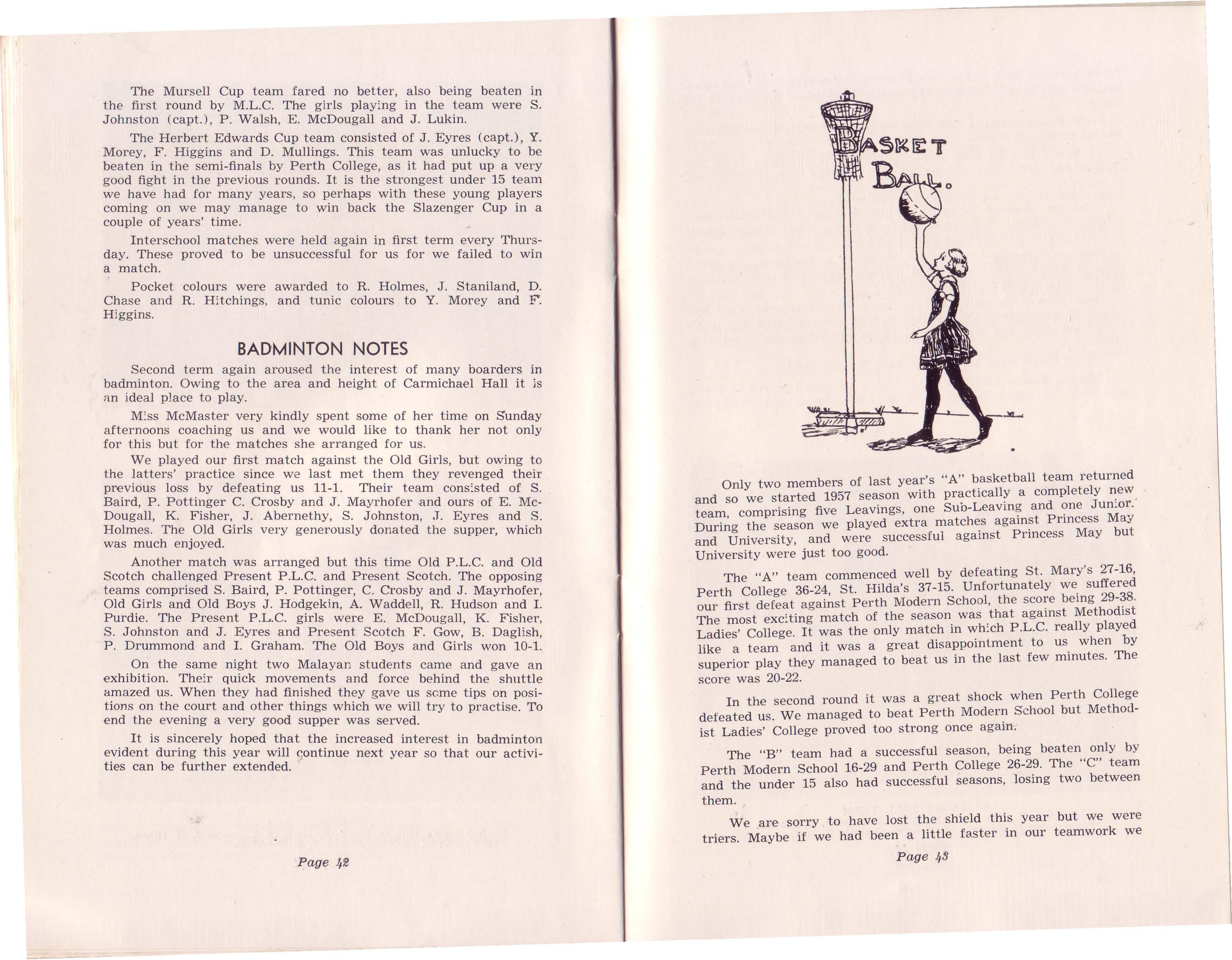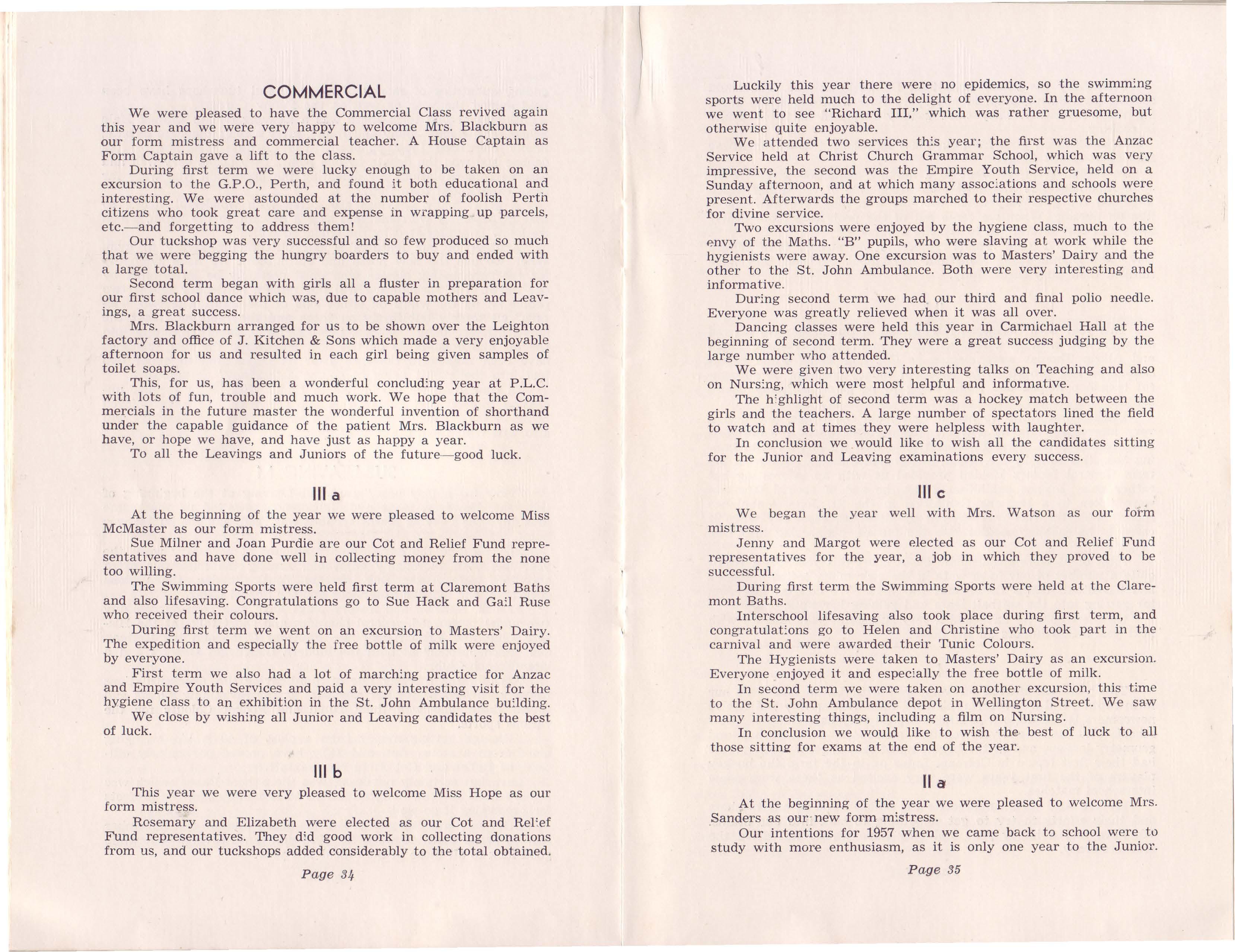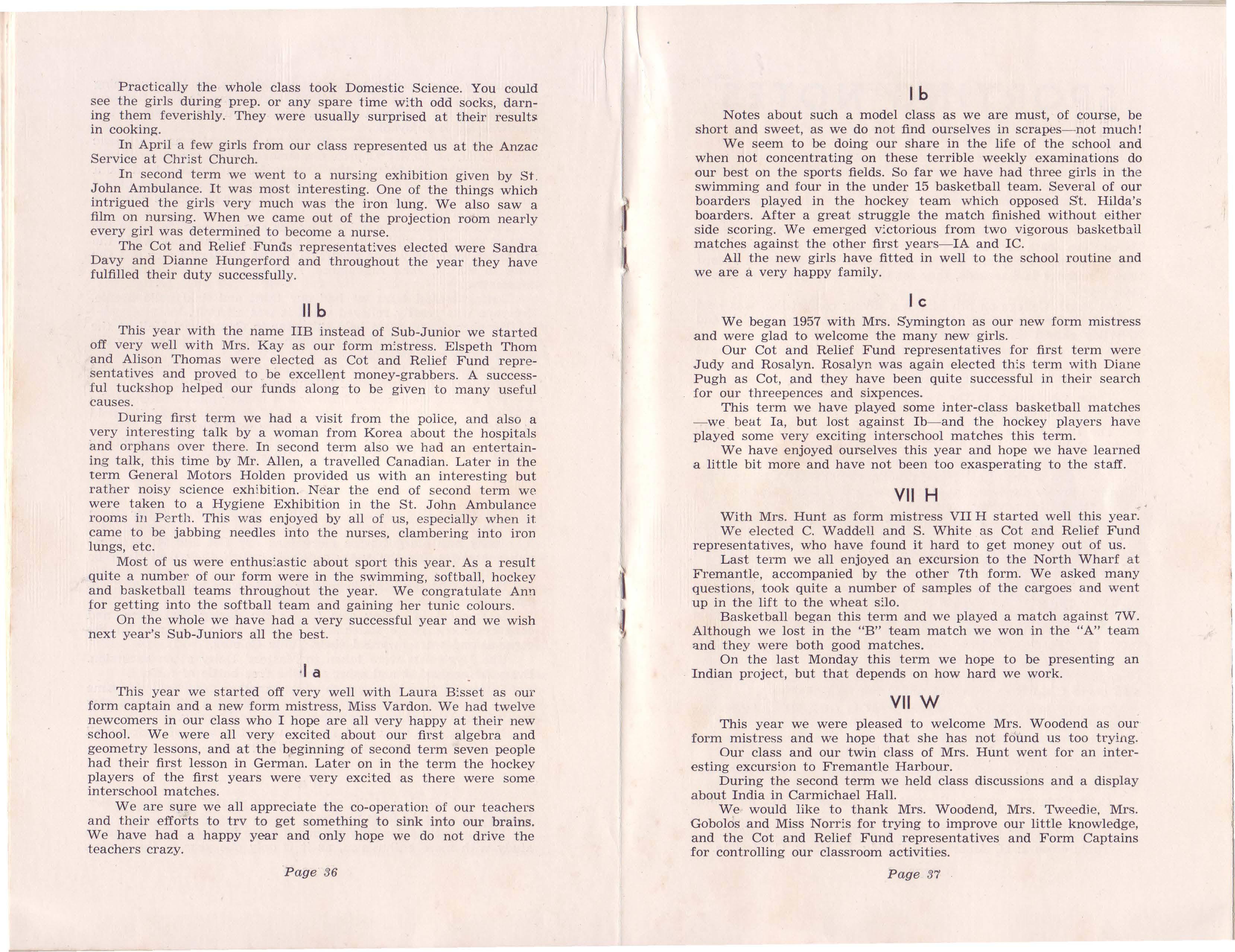 Penelope Norwood has returned from Sydney and is teaching at St. Hilda's Girls' School. Many Old Girls have gone to "greener pastures" in the Eastern States: Jan Perrin, Elizabeth Vincent and June Gwyther are working in Melbourne, Morwenna Vincent is doing a librarian course in Melbourne, and Sylvia Murray is working in Canberra. Dianne Creightmore is a manageress of a hotel in Melbourne and her sister Meredith is studying at the University.