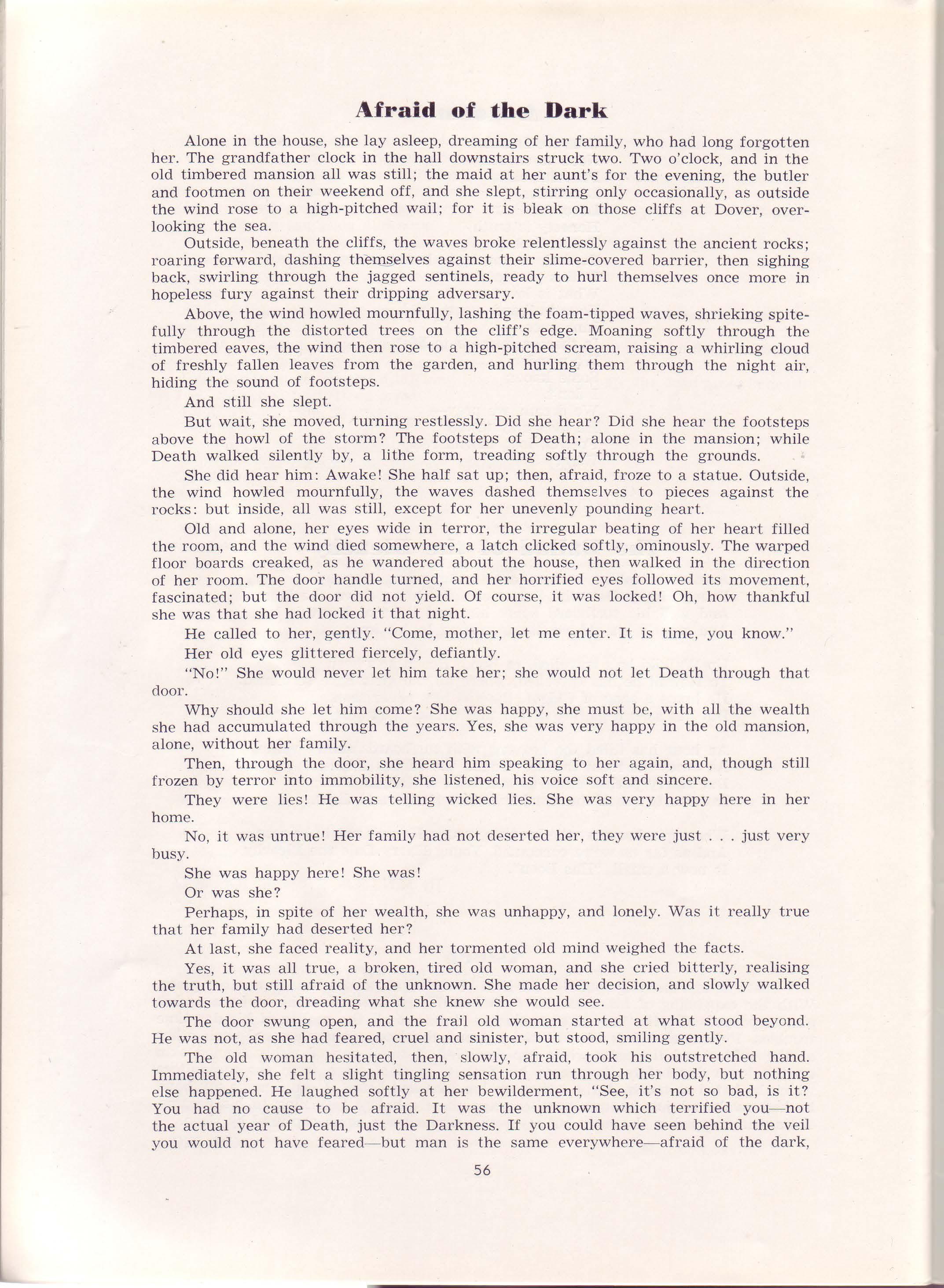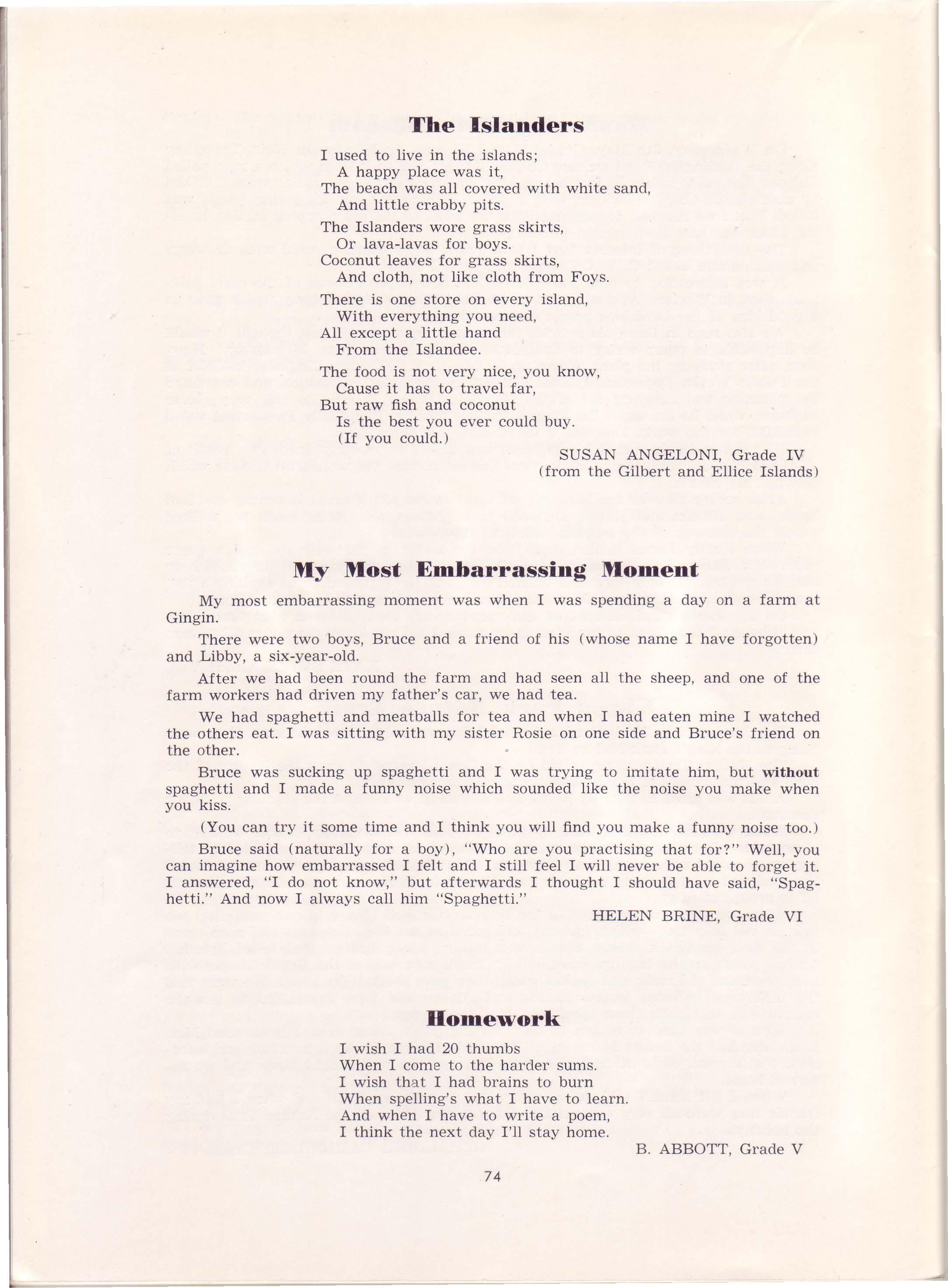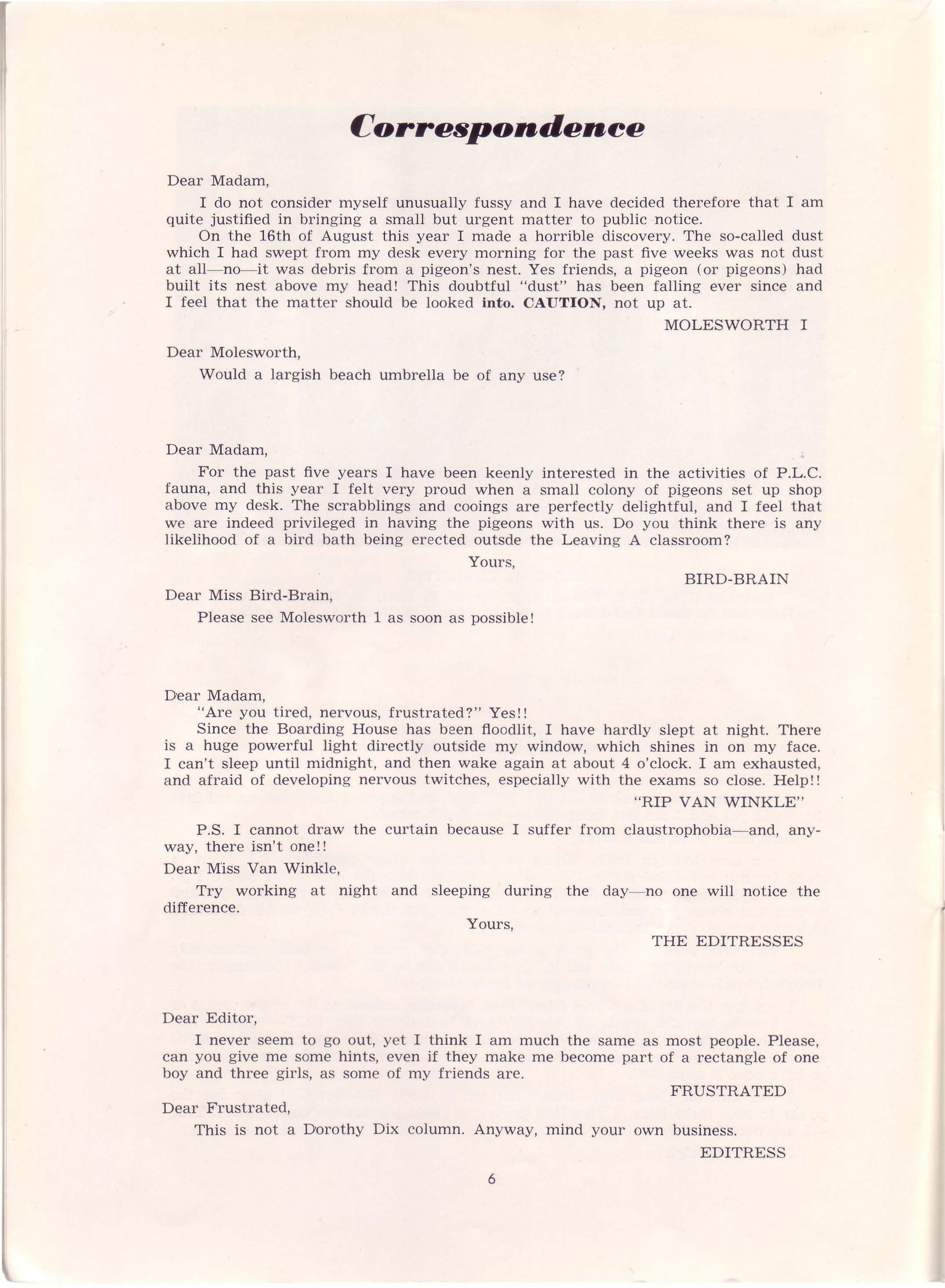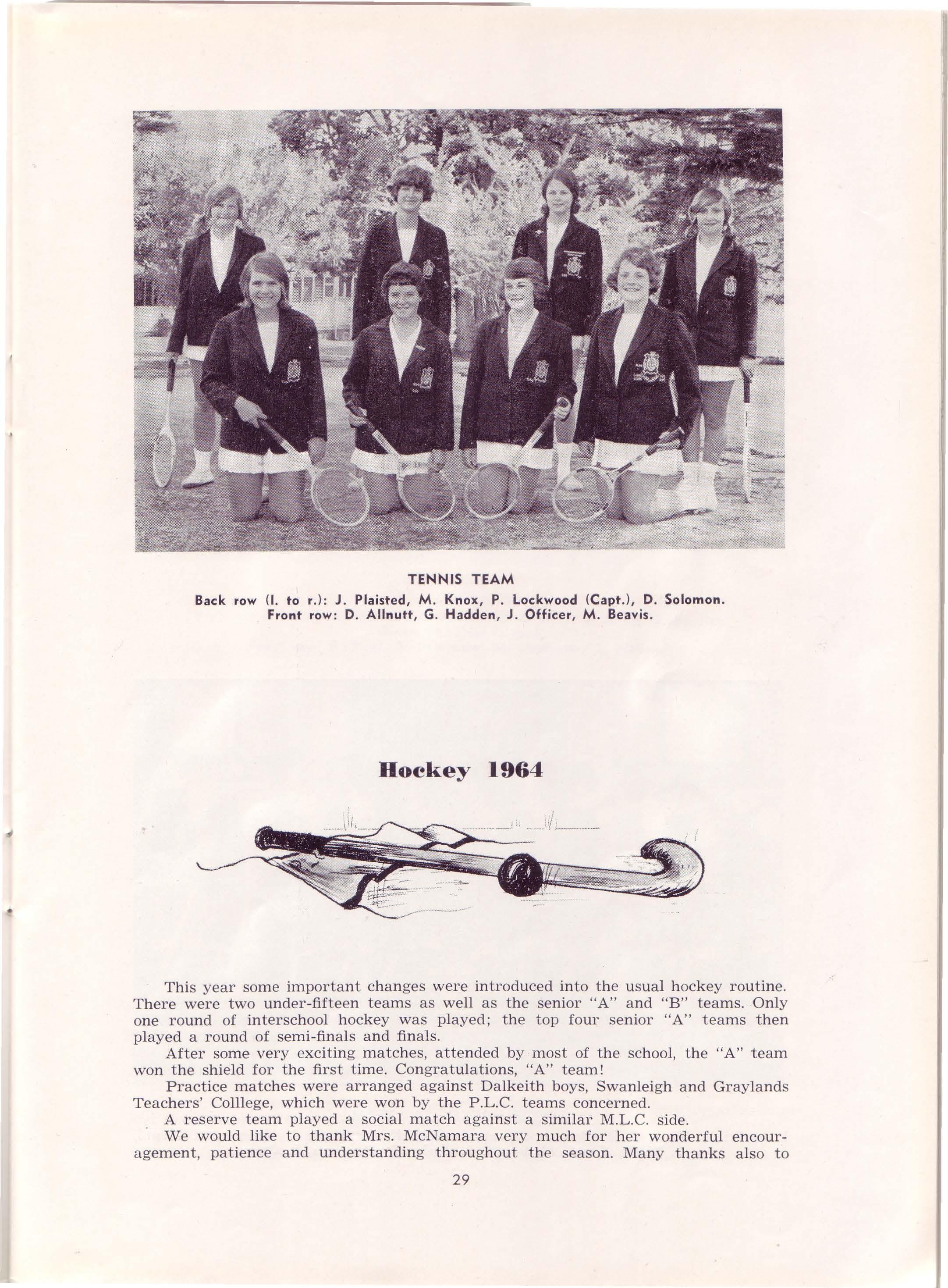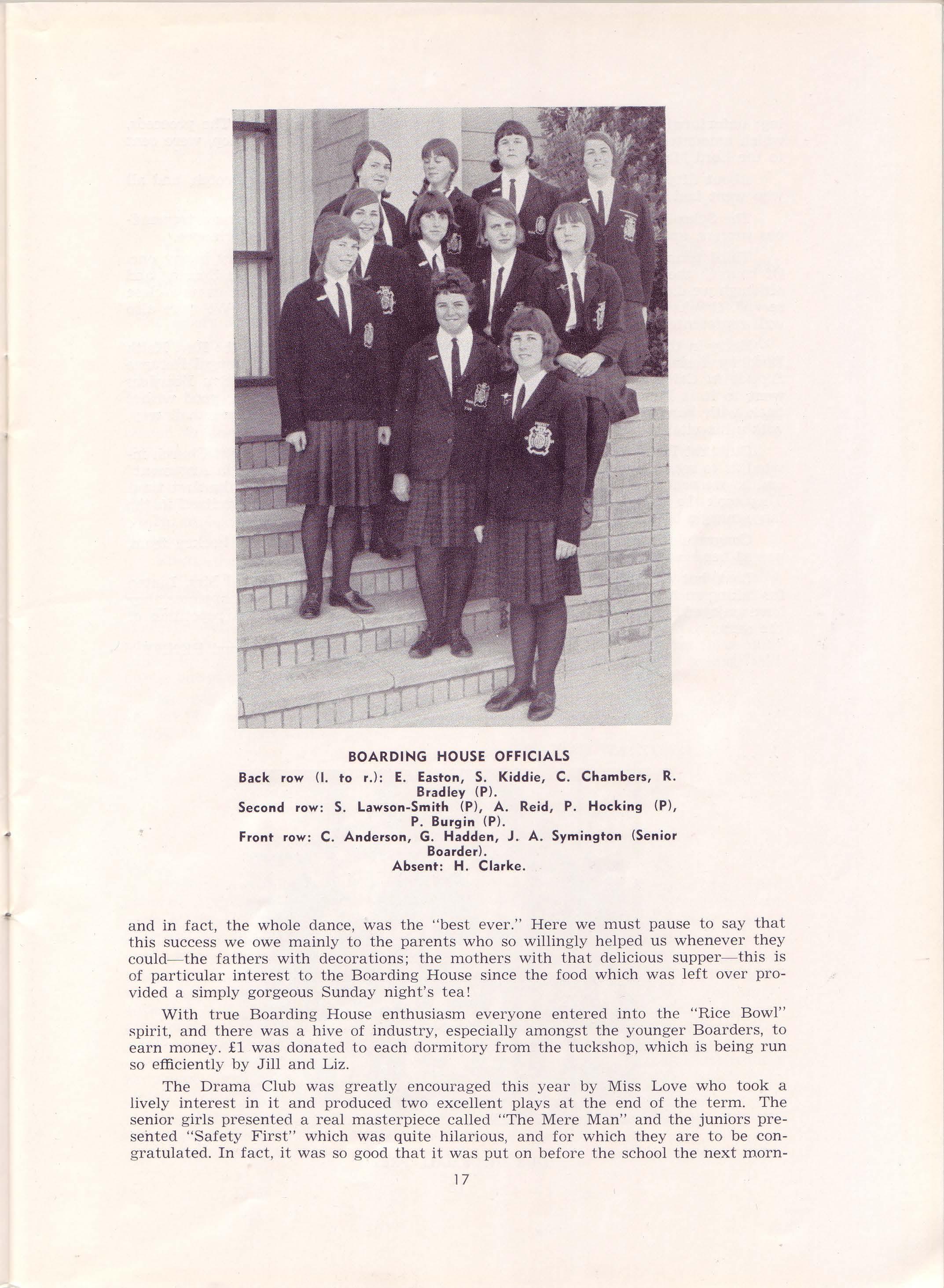 In June, Sergeant Watson spoke to a general meeting of parents on "The Role of Radio in the Police Service". Prior to this talk , girls demonstrated garments they had made in class , modelling them themselves in a delightful mannequin parade, after which they retired to an enjoyable supper. The only other social gathering was the annual dinner on November 17.