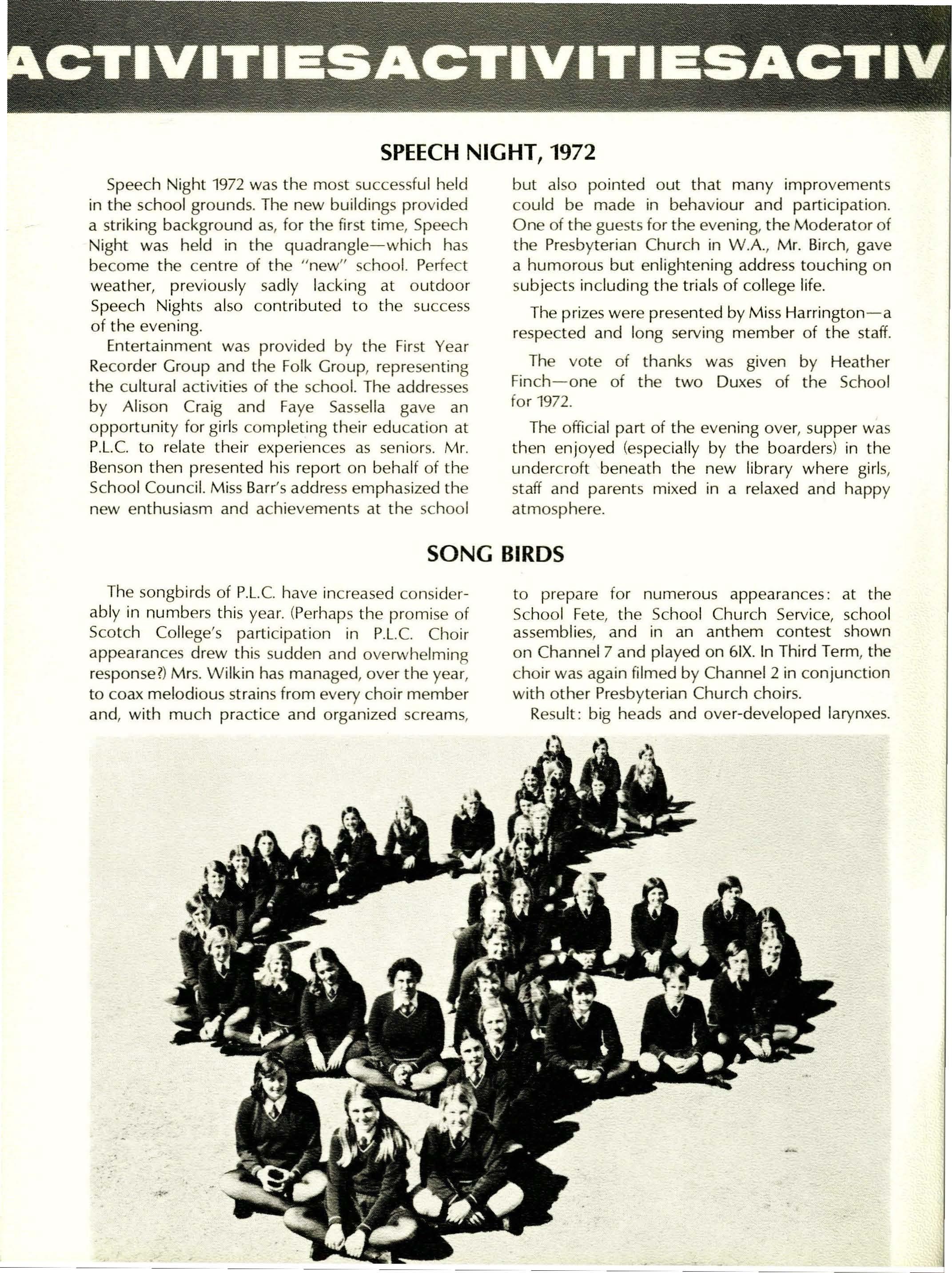 The songbirds of P.L.C have increased considerably in numbers this year. (Perhaps the promise of Scotch College's participation in P.L.C Choir appearances drew this sudden and overwhelming response?) Mrs. Wilkin has managed, over the year, to coax melodious strains from every choir member and, with much practice and organized screams,