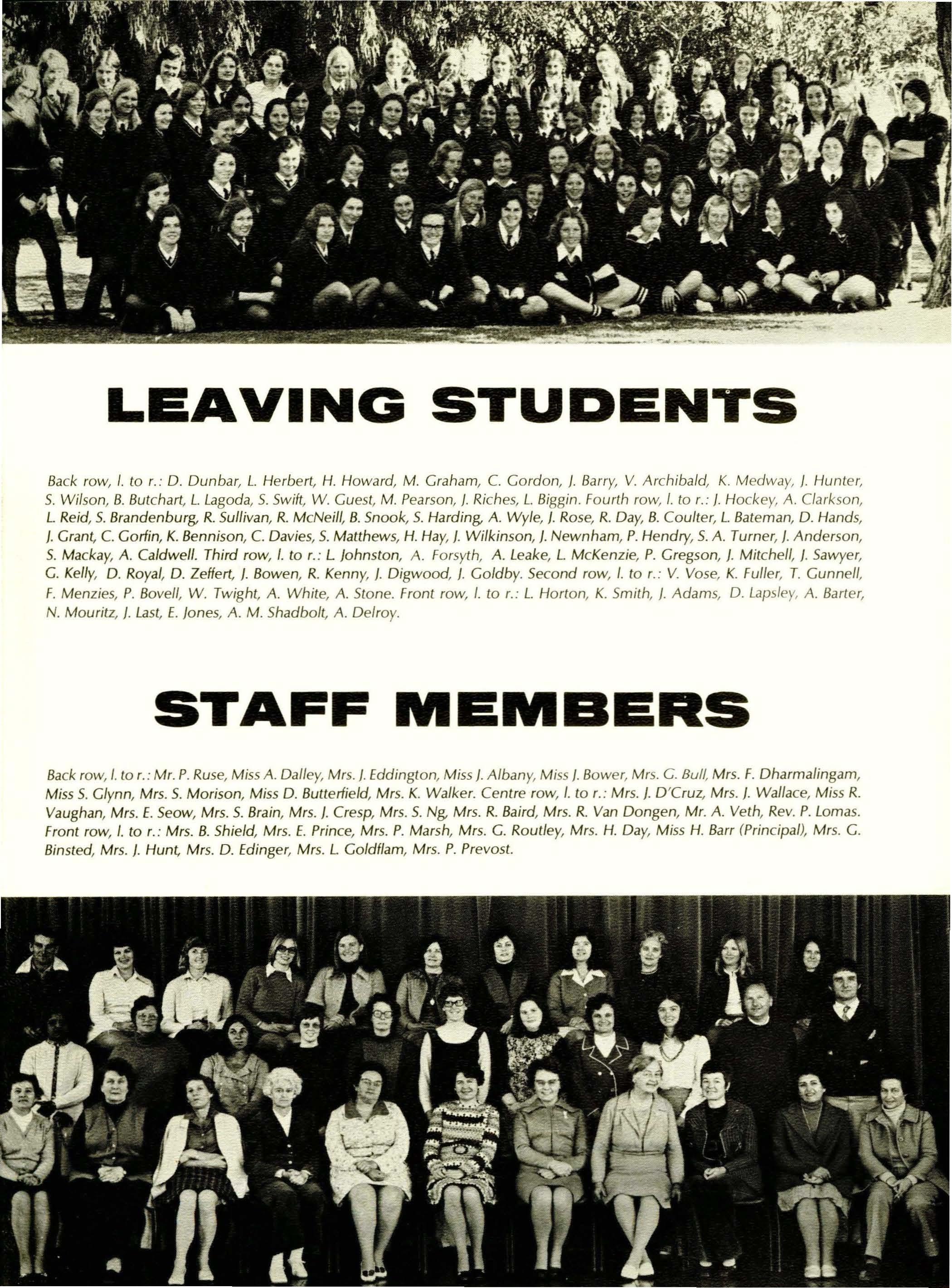 Full-time Staff: Mrs. H. Day, BA, Dip.Ed., L.Mus., L.TCL., AASA (Senior Mistress); Mrs. G. Binsted, B. Se. (Econ.), Dip.Ed.; Miss j. Albany, BA(Hons.) (Leic.), Dip.Ed.; Miss j. Bower, B.Sc.; Mrs. S. Brain, BA, Dip.Ed.; Mrs. G. Bull, (T.C), Dip.H.5e.; Miss D. Butterfield, (T.C), Diploma of Teaching; Mrs. S. Campbell (Laboratory Assistant); Mrs. I. Cresp, B.Sc.; Mrs. j. D'Cruz, BA (Maths.), B.Ed.; Mrs. F. Dharmalingam, SA, Dip.Ed., FTCL., L.SDA; Mrs. R. van Dongen, B.Se., Dip.Ed.; Miss M. Dorrington, L.Mus.; Miss A Dalley, (TC); Miss j. Dunn, B.Ed., Dip.Phys.Ed.; Miss S. Glynn, ACI.A, Cordon Bleu; Mrs. L. Goldflam (T.C); Mrs. H. Houghton, BA(HonsJ (Hull); Mrs. I. L. Hunt (T.C), MA, FTCL.; Rev. P. B. Lomas, H.N.C (Eng.); Mrs. P. Marsh, (T.C), BA, L.TCL.; Mrs. j. Mell, Dip. Occupational Therapy (Vic.); Mrs. S. Morison, Dip.Phys.Ed.; Mrs. S. Ng Chie Heung, BA, ASDA; Mrs. A Pace,