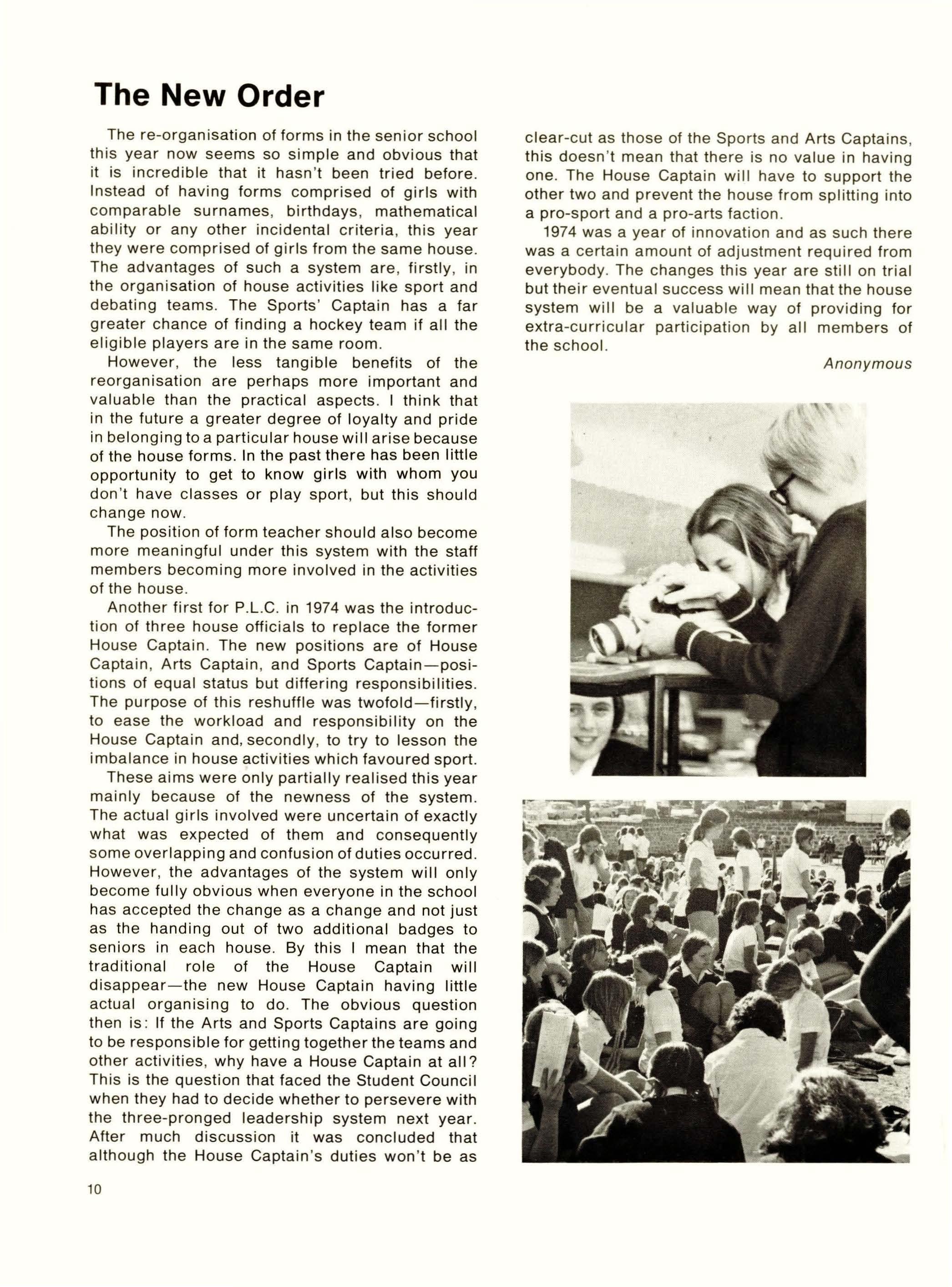 Another first for P.L.C. in 1974 was the introduction of three house officials to replace the former House Captain. The new positions are of House Captain, Arts Captain, and Sports Captain-positions of equal status but differing responsibilities. The purpose of this reshuffle was twofold-firstly, to ease the workload and responsibility on the House Captain and, secondly, to try to lesson the imbalance in house activities which favoured sport.