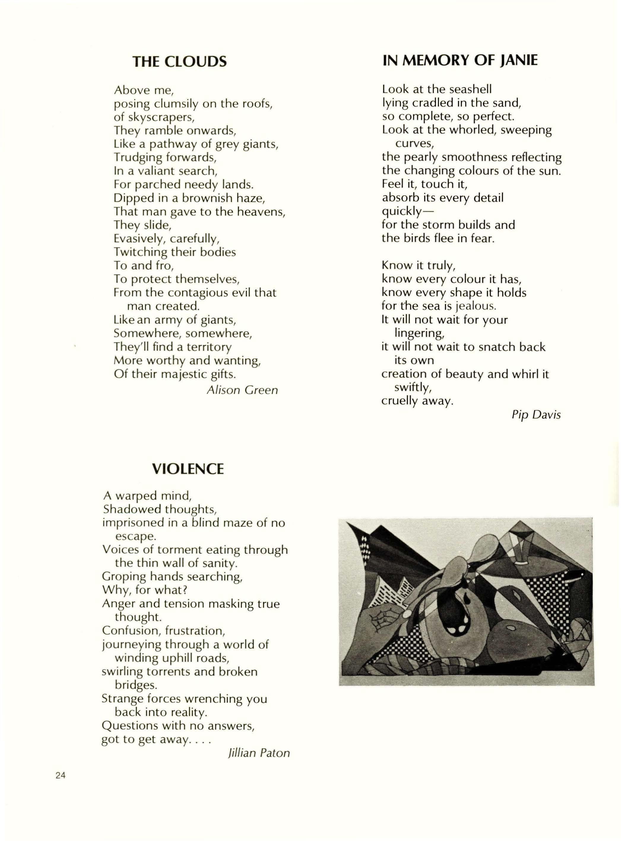 The Second Year Recorder Group, the members of which were Fiona Baird, Sheryl Goldflam, Teresa Parkinson, Fleta Raven and Janet Turner performed "Greensleeves", "The Month of Maying" and "Le Contrefaiseur". They were followed by three Fourth Year Drama pupils, Angela Rogers, Caroline McKenzie and Fiona Brine, who performed Shakespeare's "Sonnet 29", and excerpts from "Great Expectations" and "Wuthering Heights" respectively.
