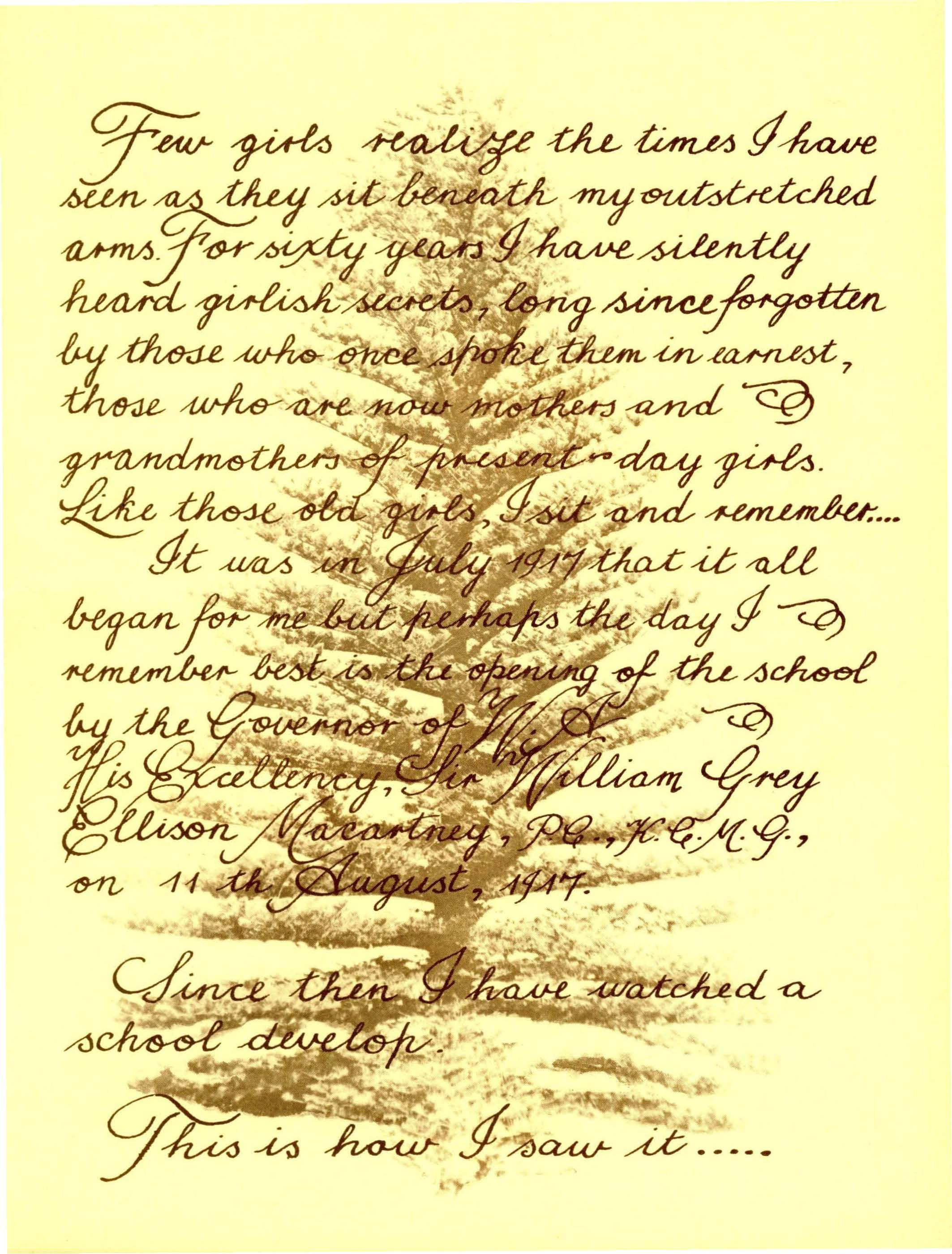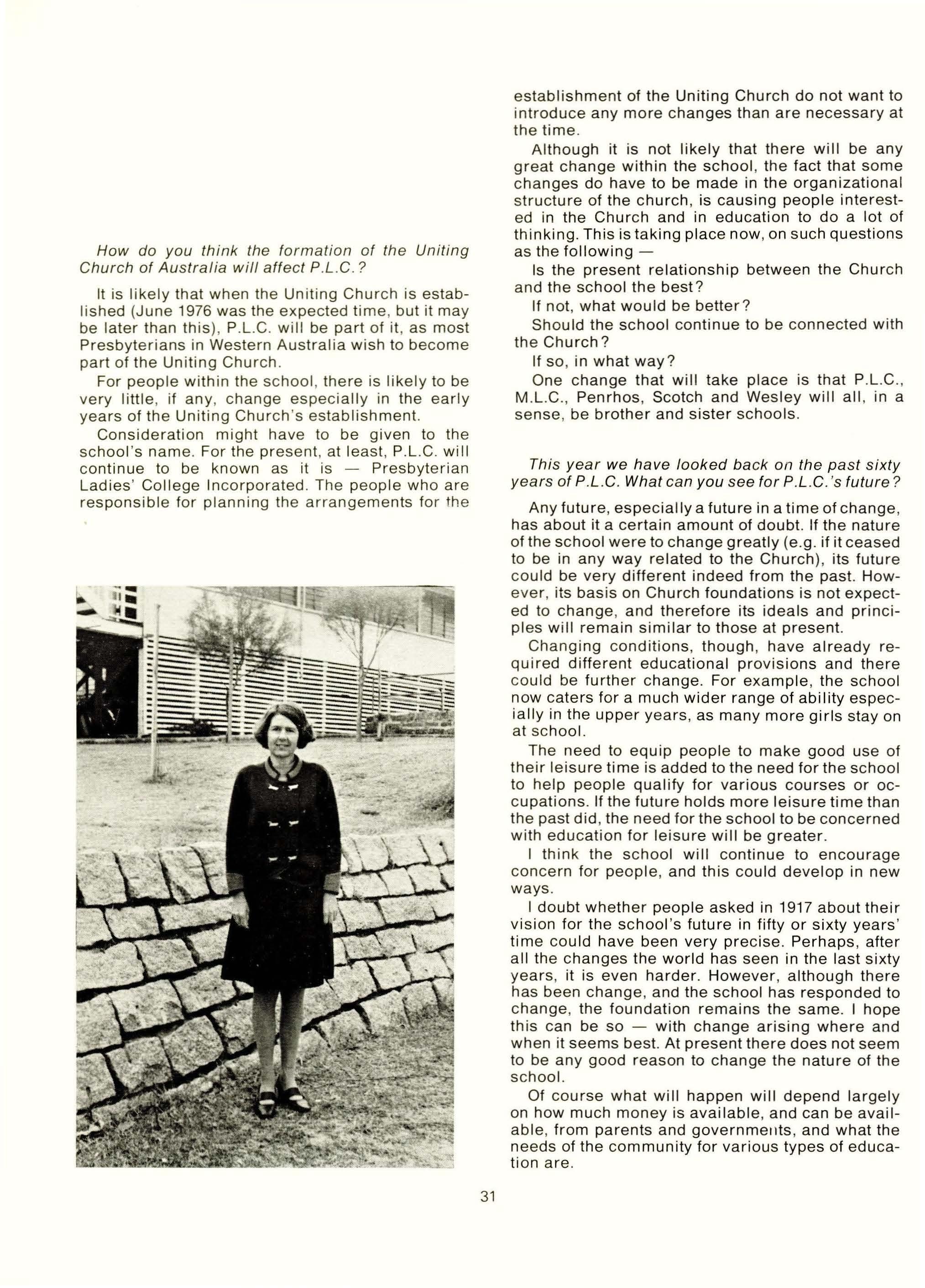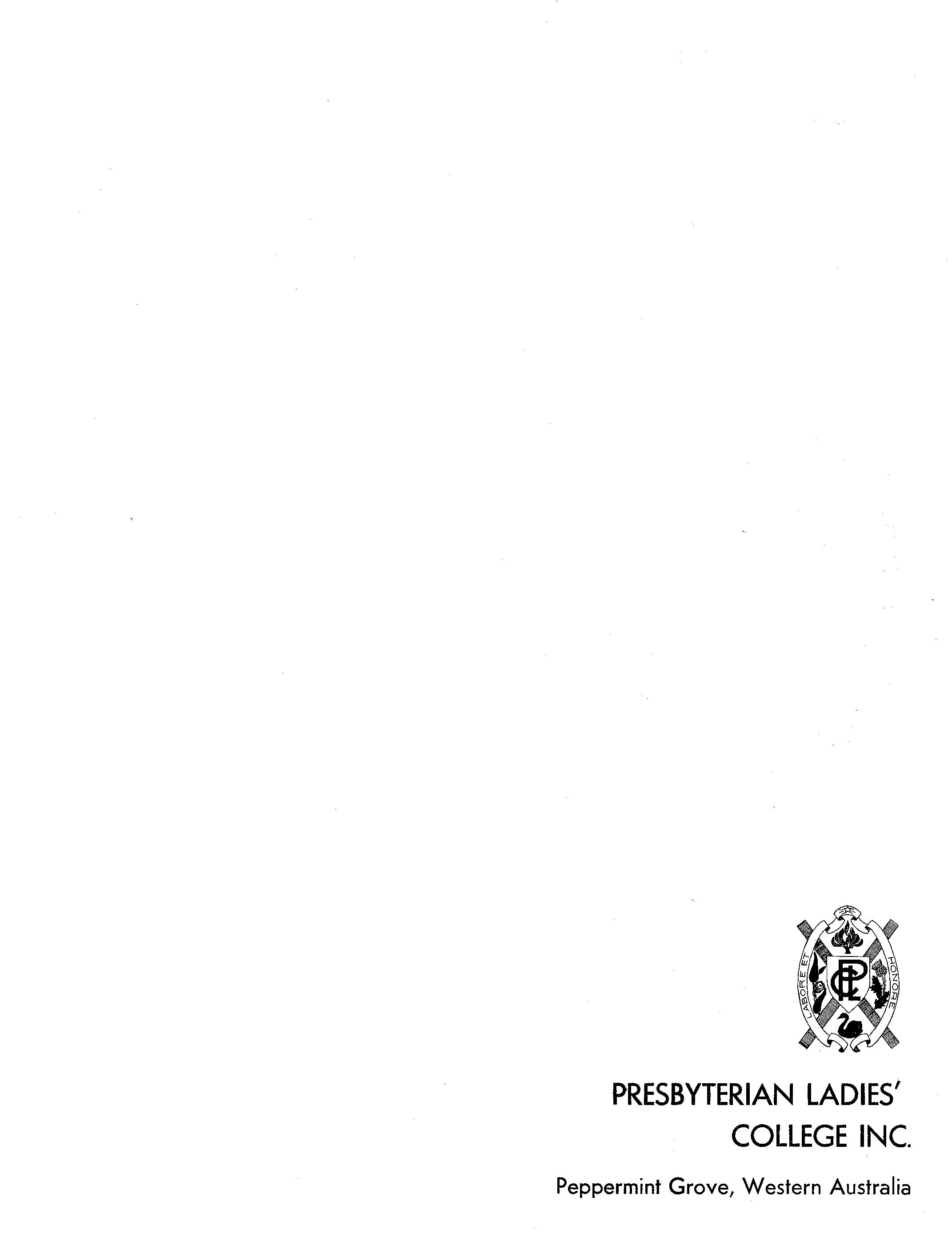 After the prayer of intercession which was led by Miss Barr, and the hymn, the Rt. Rev. D. j. Cousins, Moderator of the Presbyterian Church in Western Australia, preached the sermon "On This Foundation I will Build", which reminded us all, in this the sixtieth year of the school, of the principles, aims and ideas on which the school has been founded.